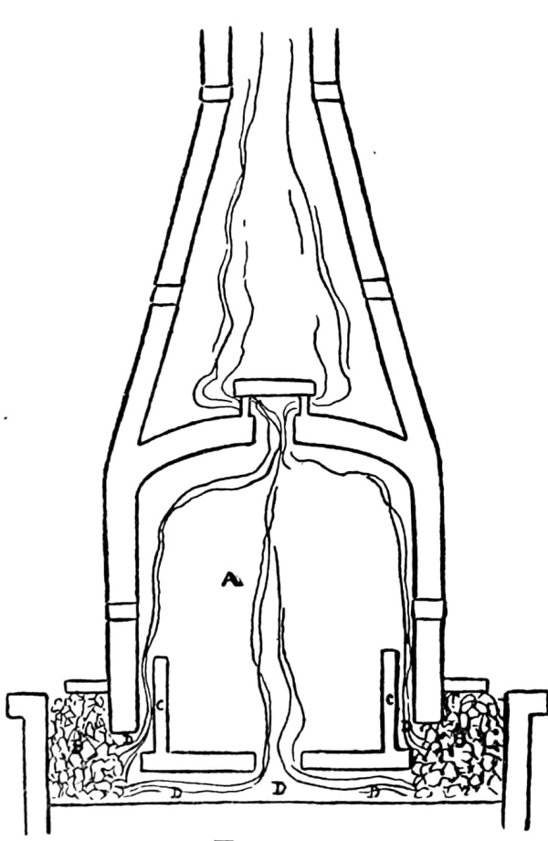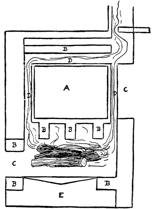 This fires at a low degree of heat, compared with the open-fire kiln. It is mostly used for under-glaze pottery and for glazing. In this kiln the fire could not come in direct contact with the ware, so that saggers are unnecessary; instead, there is a system of shelves upon which the pottery is placed.121 The fuel, which may be wood, is fed through a door on one side of the lower part of the kiln, with an ash-box below. A brick arch supports the muffle-box or chamber where the pottery is placed. On the opposite side from the furnace door is the opening through which the pieces are put into the kiln. This is carefully bricked up before the fire is started. The hot air passes through a passage extending around all sides and above the box, and the outlet is over the door where the pottery goes in. A slab extending nearly across this outlet controls the draught.