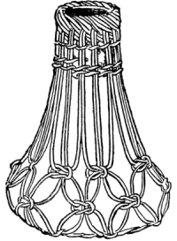 A piece of pliable brown rattan, No. 4, about two yards long, is wet until soft and passed around the knot nearest the top at one end of the jar. The ends are brought together and twisted for their entire length. At the opposite end of the jar they are brought around the knot nearest the top, turned up, and firmly bound to the handle with a piece of wire, which may then be covered with a binding of raffia.