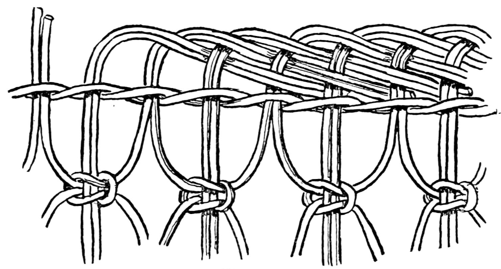 Five rows more of this knotting are made, each row being half an inch from the previous one, except the fifth, which is three-quarters of an inch from the fourth. Now bring all the strands from three groups together at an inch and three-quarters from the last row of knotting. Hold the middle one of the three groups taut, and tie the strands to right129 and left upon it in a Solomon’s knot. Tie another knot close to the first one, and another, until there are seven—one below the other. Three more groups are brought together at an inch and three-quarters from the last row of knotting, and tied in the same way. Then another three. The fourth bunch will have four groups of strands in it (as there were thirteen groups in all at starting). Two of these groups, the middle ones, are held taut, and those to left and right are tied upon this double group as the others were. Then, taking the long ends of one of these bunches, tie them again in three Solomon’s knots at an inch and three-quarters from the seventh knot. They are next brought straight down without knotting, for two inches more, when two knots are made. For two and three-quarter inches more they are brought without knotting, then tied and wound around a large ring—an old curtain ring about two inches in diameter will do. When all four bunches have been knotted in the same way, and the ends of all have been fastened securely to the curtain ring, the ring is covered neatly with button-hole stitch in raffia, and a raffia binding about half an inch wide is made just below the ring, where the strands are fastened to it.