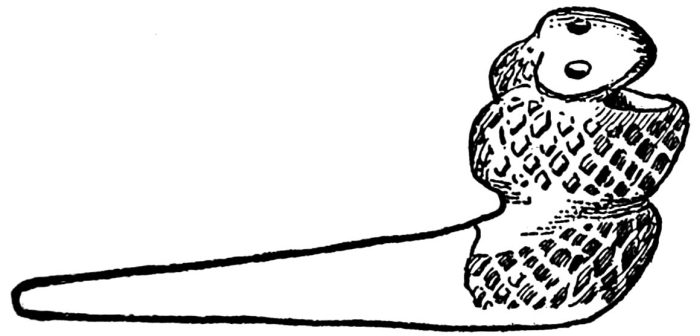 Unlike the Egyptians, the Indians made little use of clay in moulding beads and other personal ornaments. They evidently did not find it gay enough in colour, not knowing the secret of the brilliant enamels with which the early Egyptian potters coated their clays. Pipes, while they were often made of stone and other substances, were in some parts of the country moulded from clay, and ranged in form from a simple tube to curious and grotesque shapes. Those made by the Iroquois were particularly elaborate—a head of an animal156 or bird formed the bowl, or a snake coiled about it (see Fig. 60).