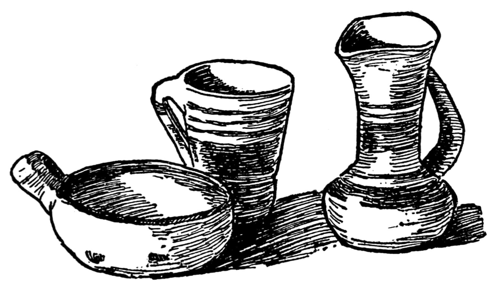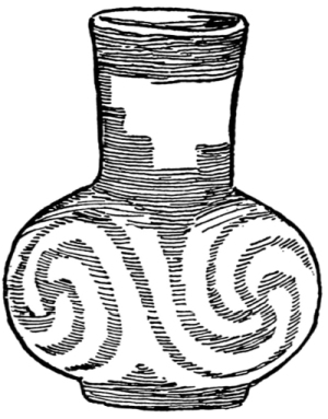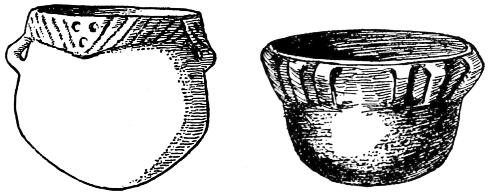 One would have thought that, in making their clay pots, which were primarily planned to serve useful purposes, and were, moreover, somewhat perishable, no attention would have been given to decoration; yet this is far from being the case. Bowls, cups, and cauldrons, water-jars and bottles (see Figs. 61 and 62) were often elaborately incised with beautiful and intricate designs. The forms, too, were simple and good.