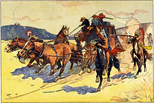 The next step in western travel was the famous overland stage which ran from St. Joseph to Sacramento, a distance of one thousand miles. This was a most difficult enterprise. For the stage carried at times large sums of money and was therefore frequently held up by highwaymen or Indians.