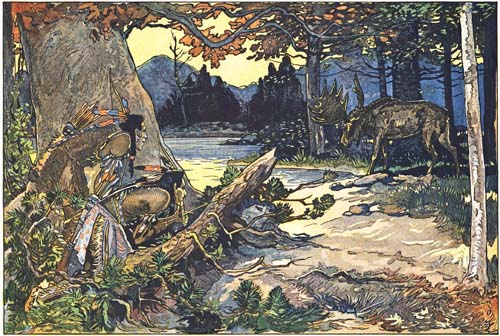 Although divided into numerous tribes or families, each speaking a different language, the Indians were, in traits of character and general appearance, very much alike. In war they were courageous, but at the same time intelligently cautious. Treacherous and deceitful to their foes, they preferred to slay an enemy by a secret rather than an open blow. Brave and successful a warrior as the Indian was, he excelled even more when he became a hunter. To be victor over the beast in the chase and hunt meant to the Indian plenty to eat and stout clothing to wear, so he developed remarkable skill in using his chief weapon, the bow and arrow.