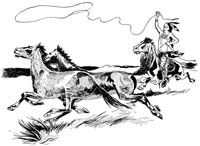 All these romantic and adventurous times finally gave way to the ever advancing civilization. The extensive tracts, then natural and free, were gradually cut up into small ranches enclosed by barbed wire fences. The cowboy too had to bear the marks of civilization and acknowledge the reign of law, but he still rides to-day as skillfully and easily as ever, sitting erect and jaunty, reins held high and loose in his hands, his whole body free yet firm in the saddle with the seat of the perfect horseman. His broad brimmed hat still sweeps up and back in the same careless freedom of those lawless days, and his belt is still adorned with the deadly guardians of his safety, his spurs jingling as he rides. His pony is the same as those of many years ago and trots steadily forward with the easy movement characteristic only of the western horse.