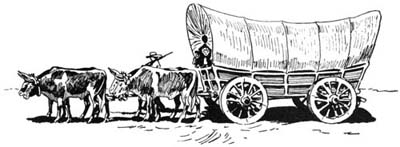 These wagons each could carry as much as six thousand pounds of freight and were drawn by several yoke of oxen in charge of one driver. Looking like large, flat-bottomed scows, the wagons were covered with canvas stretched over hoops bent round in shape. In this way the goods carried were protected from dampness and rain.