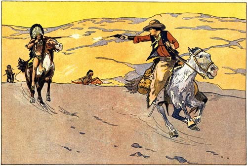 The cowboy’s life was full of continual excitement and hard work when out on the cattle range. While he was riding alone on the Plains, a band of Indians would often suddenly appear and, forming in a circle, ride madly around him. There was then nothing to do but stand them off until help came, or if forced, put up as good a fight single handed as possible while ammunition lasted. If the cowboy was an experienced frontiersman and did not lose his nerve, he could successfully cope with a small band of Indians, because he could match a gun against the Indians’ arrows.
