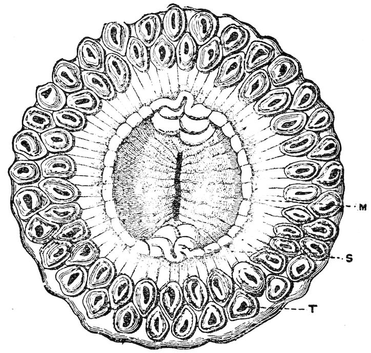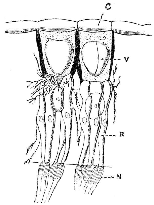 The most interesting forms brought to light by the Norwegians are the two genera Fenja and Aegir, animals possessing the general form of sea anemones but distinguished from all Cœlenterates by the presence of a continuous and straight gut reaching from the mouth to the aboral pores which completely shuts off the cœlenteron or general body cavity from the stomodæum.