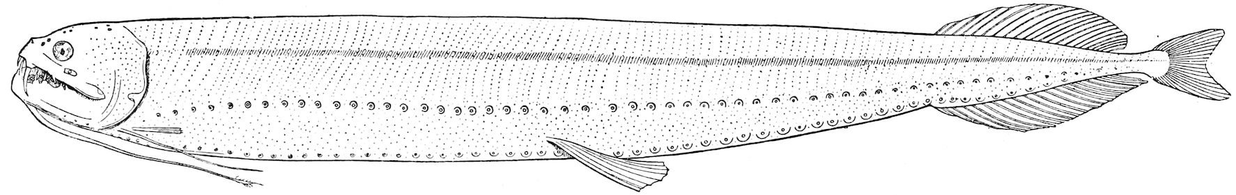 The family Halosauridæ contains five species all confined to the abysmal zone. They have long bodies tapering to a finely pointed tail, and the head is provided 165with a snout that projects considerably in front of the mouth.