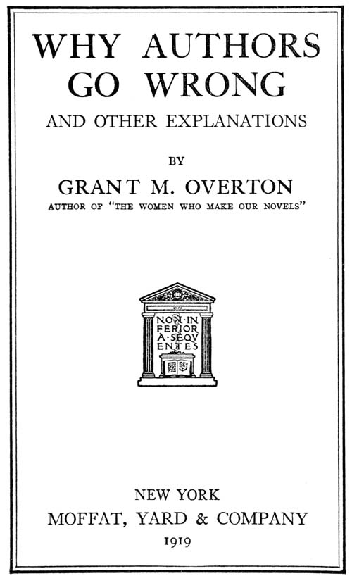 We were indicating that Why Authors Go Wrong is an extensive subject. It is so extensive because there are many authors and many, many more readers. It is extensive because it is a moral and not a literary question, a human and not an artistic problem. It is extensive because it is really unanswerable and anything that is essentially unanswerable necessitates prolonged efforts to answer it, this on the well-known theory that it is better that many be bored than that a few remain dissatisfied.