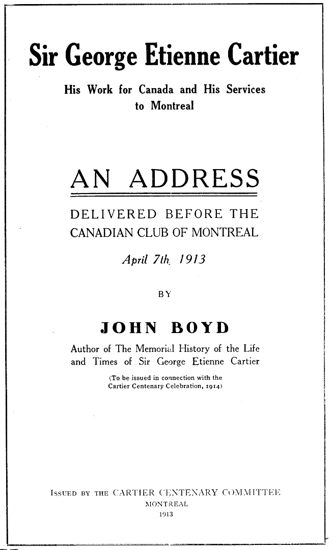 The great interest that has been aroused in the Cartier Centenary movement was shown by the large gathering which assembled at the Canadian Club luncheon in the Sailors' Institute on Monday, April 7th, 1913, to hear Mr. John Boyd speak on "Sir George Etienne Cartier, His Work for Canada and His Services to Montreal." The speaker's references to the work that Cartier had accomplished for Canada, and especially to the great services that he rendered to the City of Montreal, were enthusiastically applauded by the large audience of representative business men.