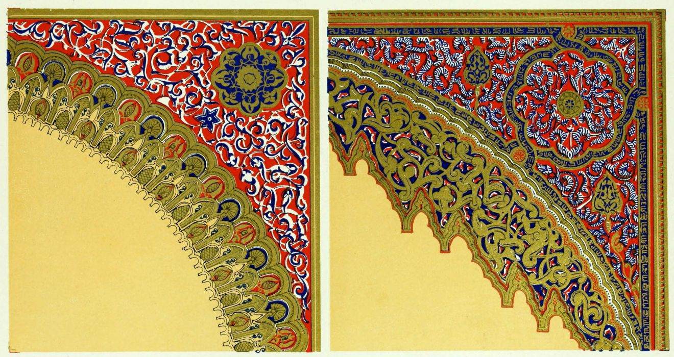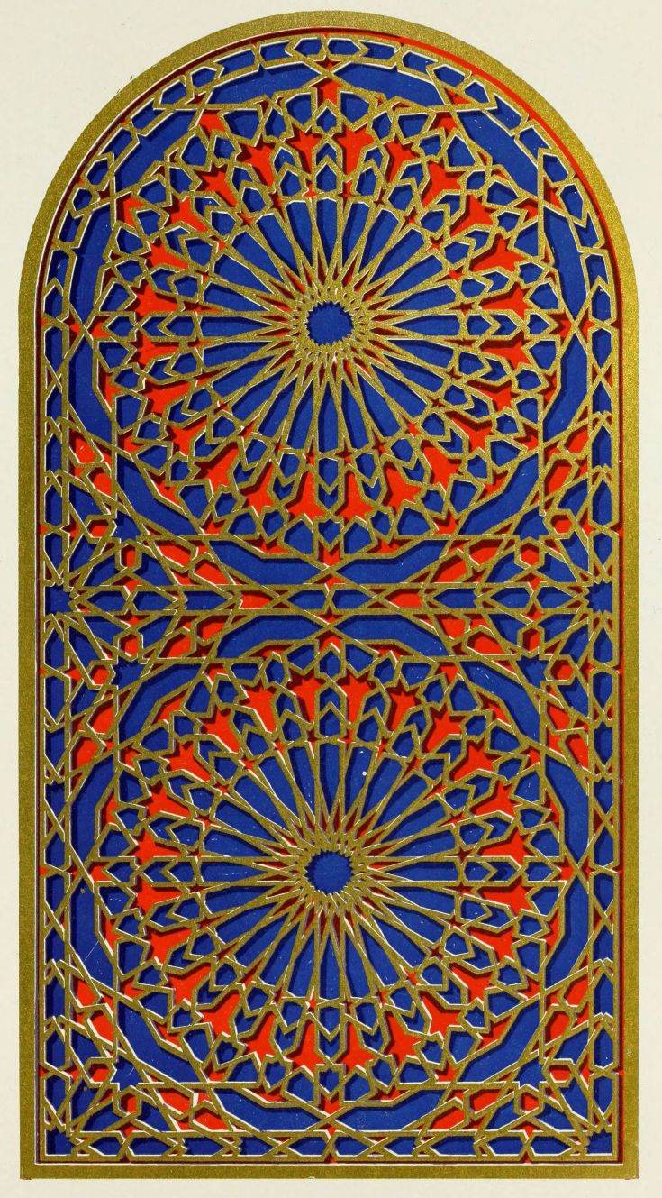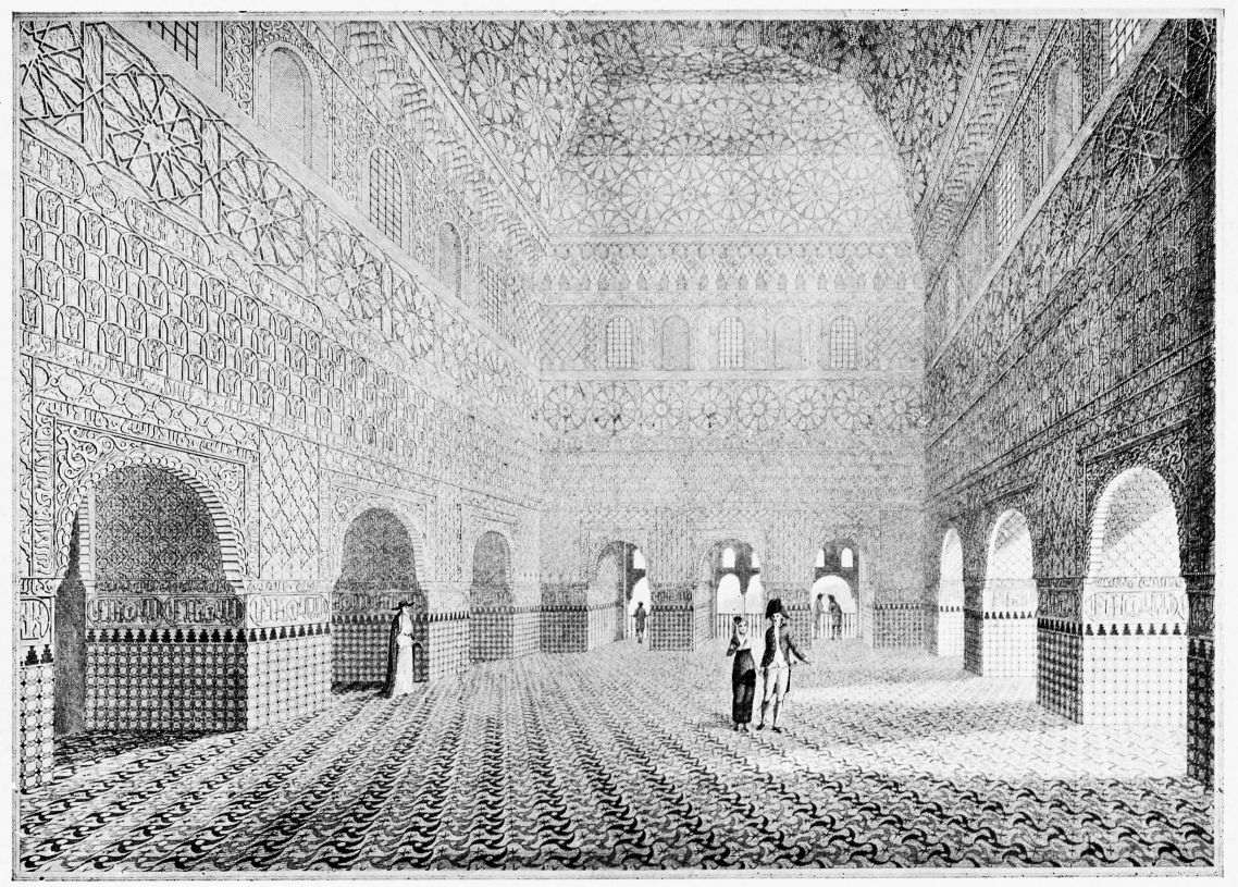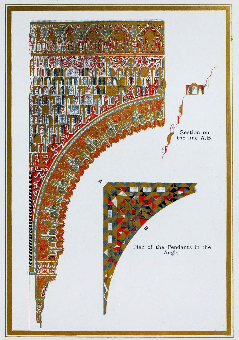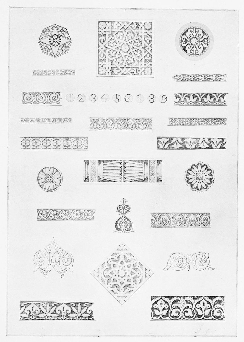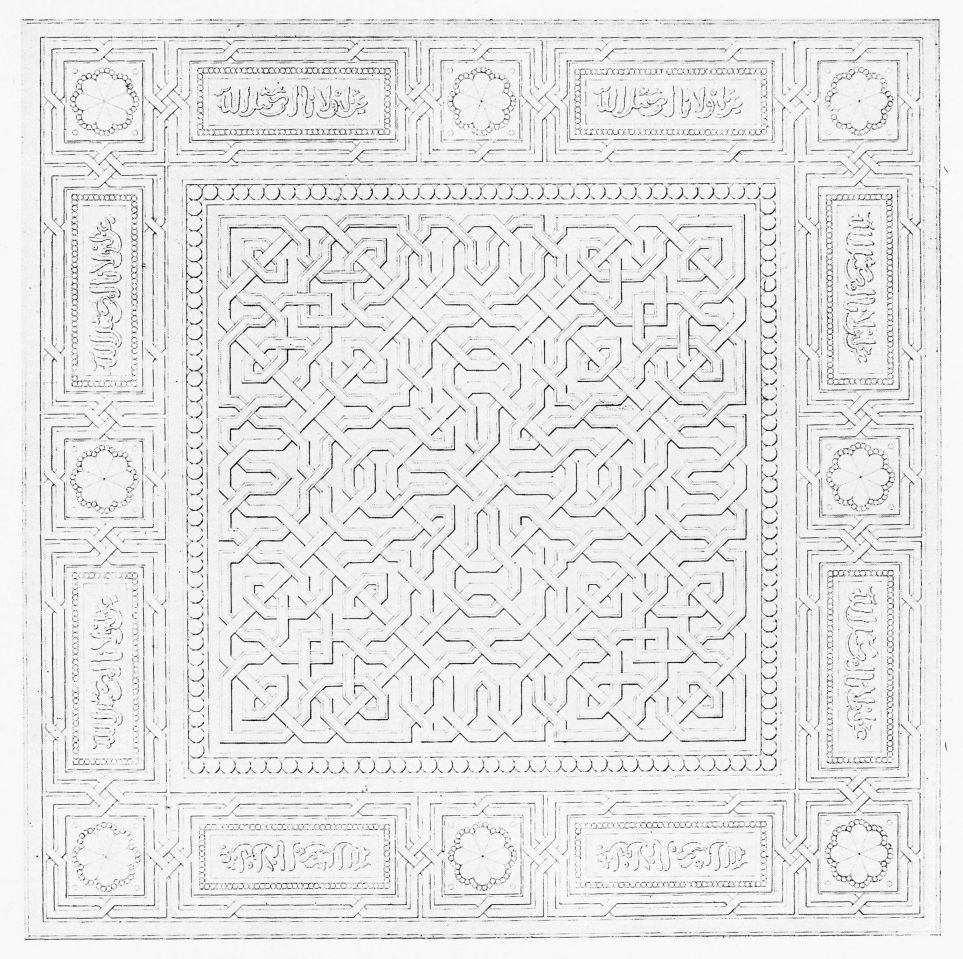 [9] Edited by Pablo Lozano. The antiquities and history of the Moorish domination in Spain remained unheeded until representations were made that research and accurate delineation would alone make their monuments intelligible. The Royal Academy of St. Ferdinand was commissioned to make drawings of the Palace of the Alhambra and of the Mosque of Córdova. The result of their labours were published at Madrid, in 1780, in a folio volume entitled as above, with sixteen plates of Arabic designs, accompanied by a few pages of letterpress. It is an exceedingly rare volume.