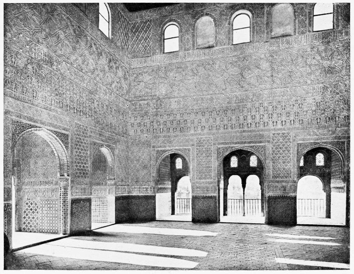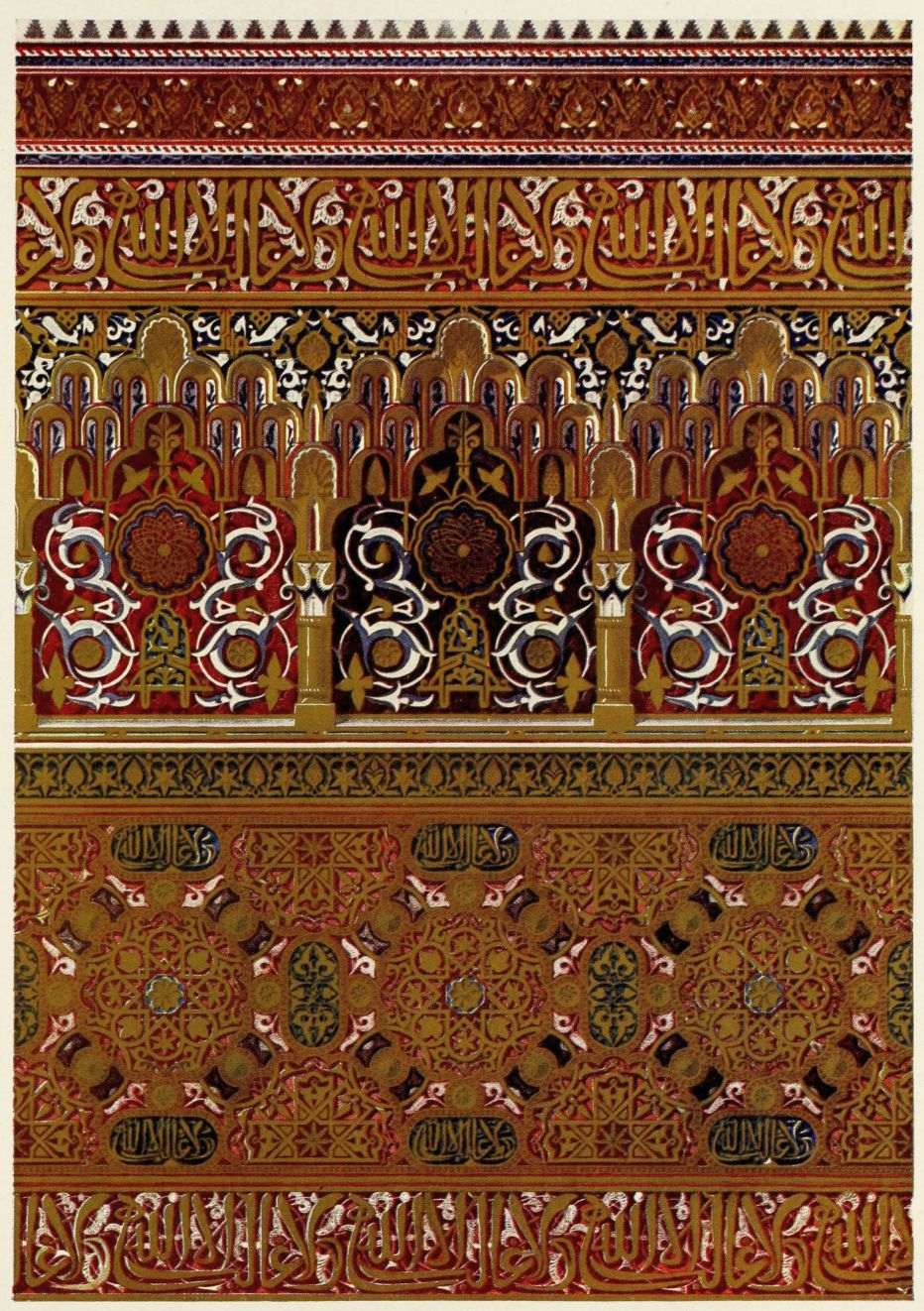 Don Mariano Contreras, Conservator of the Alhambra, the son of the gifted Raphaël Contreras, who devoted thirty-seven years of his life to the restoration of the Palace—gave me the benefit of his knowledge of this unique treasure-house of art; and I have also laid under contribution the beautiful plates of Owen Jones, who disposed of a Welsh inheritance in order to produce his great work on the Plans, Elevations, Sections and Details of the Alhambra. Jones’s Grammar of Ornament, which has been described as “beautiful enough to be the horn-book of the Angels,” also contains the result of his researches in the Alhambra, which occupied him for the greater part of eleven years. A selection of these illustrations is here rescued from the obscurity of public libraries and the inaccessible recesses of private collections. The inclusion of John F. Lewis’s drawings, and the reproduction of a series of pictures by James C. Murphy, who spent seven years in the study of the artistic marvels of the Alhambra, I do not feel called upon to defend. The photographs, several of which were placed at my disposal by Don Rafaël Garzón, represent the buildings as they appear to-day; the drawings were made before the Palace was damaged by the disastrous fire of September, 1890.{ix}