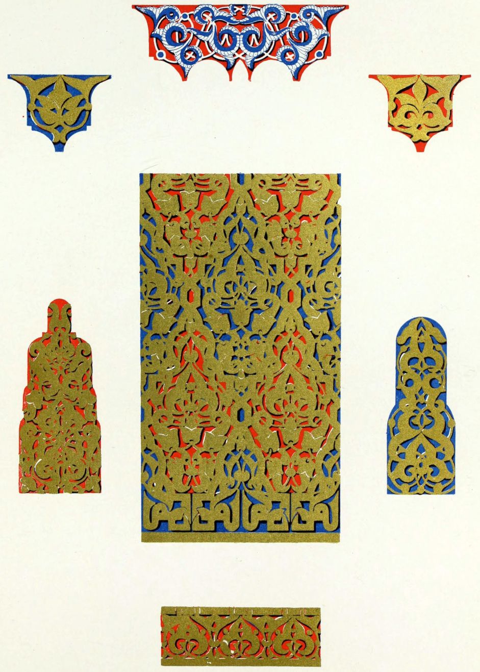 “It is only fitting that this important volume has been dedicated to the King of Spain, for it would be difficult to imagine a more sumptuous work illustrating the beautiful buildings which the Moors left behind them in the Peninsula to bear everlasting record to their taste and culture.... The illustrations are such a prominent feature of this volume that they claim our first attention. At the risk of being suspected of exaggeration we can only say that it is impossible to praise too highly the care with which they have been prepared. There are some hundreds of them, of which between eighty and ninety are exact reproductions in colour and gold of various portions of the marvellously beautiful decorations so beloved of the Moors and so characteristic of their work. The other illustrations are so numerous and well chosen as to give a perfect series of pictures of every portion of these Moorish buildings. Details of tracery, capitals of pillars, sections of friezes, decorations and roofs are pictured with absolute faithfulness, and as a treasure-house of Moorish art this book and its predecessor are, and will probably remain, unique. But by modestly remarking in his preface that he has made the letterpress subservient to the illustrations, the author has done himself a great injustice. Not only is the book carefully thought out and well arranged, but it is written in a most sympathetic spirit, and abounds in passages of real eloquence.”—Birmingham Daily Post.