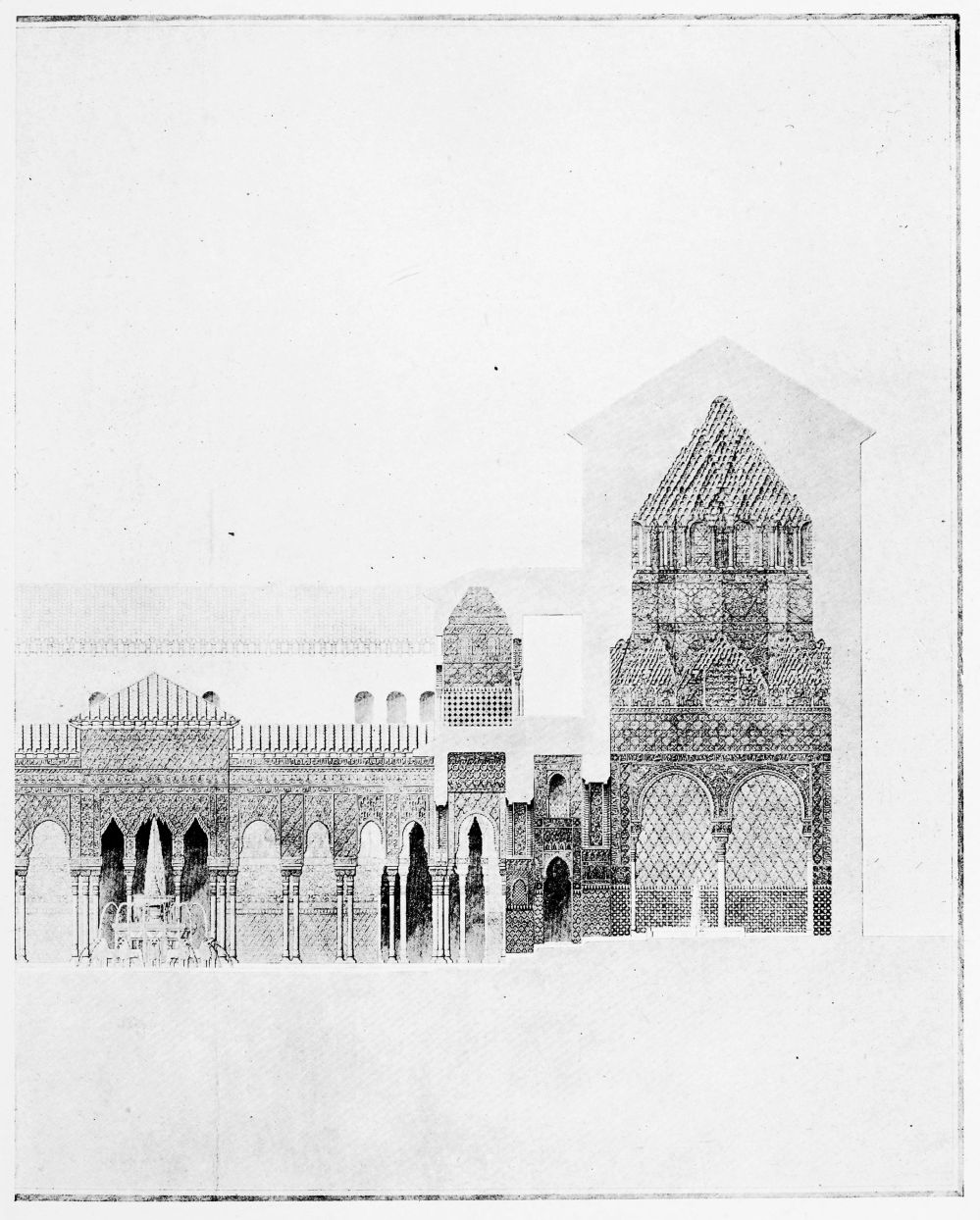 Don Mariano Contreras, Conservator of the Alhambra, the son of the gifted Raphaël Contreras, who devoted thirty-seven years of his life to the restoration of the Palace—gave me the benefit of his knowledge of this unique treasure-house of art; and I have also laid under contribution the beautiful plates of Owen Jones, who disposed of a Welsh inheritance in order to produce his great work on the Plans, Elevations, Sections and Details of the Alhambra. Jones’s Grammar of Ornament, which has been described as “beautiful enough to be the horn-book of the Angels,” also contains the result of his researches in the Alhambra, which occupied him for the greater part of eleven years. A selection of these illustrations is here rescued from the obscurity of public libraries and the inaccessible recesses of private collections. The inclusion of John F. Lewis’s drawings, and the reproduction of a series of pictures by James C. Murphy, who spent seven years in the study of the artistic marvels of the Alhambra, I do not feel called upon to defend. The photographs, several of which were placed at my disposal by Don Rafaël Garzón, represent the buildings as they appear to-day; the drawings were made before the Palace was damaged by the disastrous fire of September, 1890.{ix}