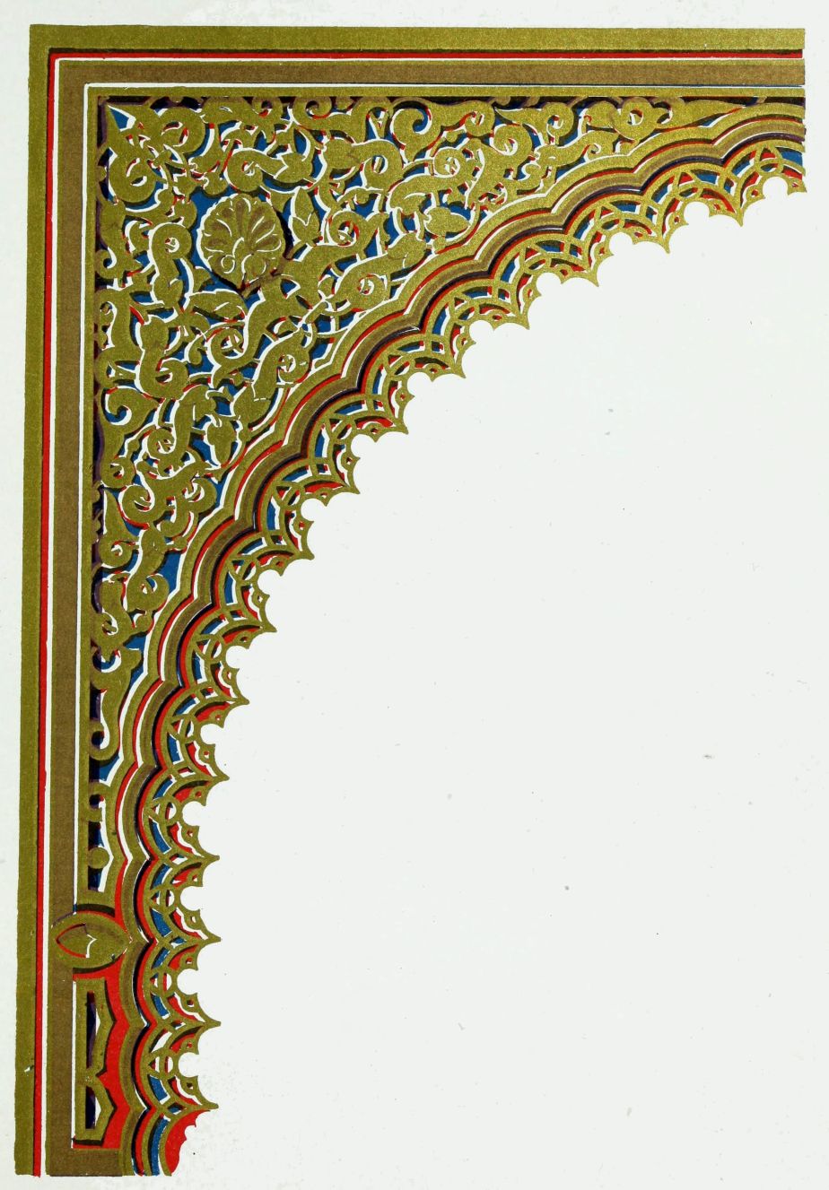 “It is really impossible to do justice, in a journal of this kind, to the sumptuous volume (its price is two guineas and the book is worth it) before us. To do that—to give the reader any adequate notion of the beauty of the illustrations with which it is enriched—we should have to summon all the resources of the colour printer’s art to our assistance, in order to reproduce them in a special edition de luxe of the “P.M.G.” Inasmuch as that is not to be done, we must ask the reader to take it on trust from us that the illustrations of Moorish decorative art are something quite out of the common.... The making of this book must, surely, have been a labour of love; and love’s labour has certainly not been lost.”—Pall Mall Gazette.