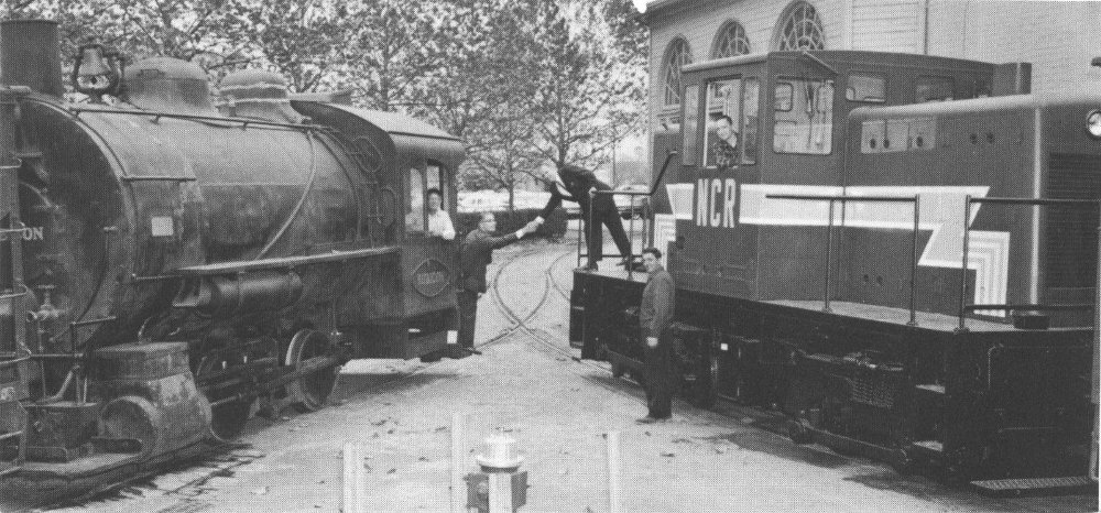 The newcomer is the “Rubicon,” one of three fireless locomotives which were purchased by The National Cash Register Company in the early years of this enterprising century. The Rubicon, however, did not come to the Park from a rusty and forgotten limbo—as, for instance, the Grasshopper locomotive did. The engine is an antique, to be sure, yet its boiler and baffles had scarcely had time to dry when it was refurbished for a place of honor in the museum. Its successor, a Diesel-powered switch engine, had been delivered only a short time before the Rubicon was relieved of service and was ready to be converted into a public curiosity. In fact, the Rubicon—injury added to insult!—on one of its final trips puffed across the NCR yard and pushed its bright blue-and-yellow replacement from the flat car on which it arrived to the roundhouse.