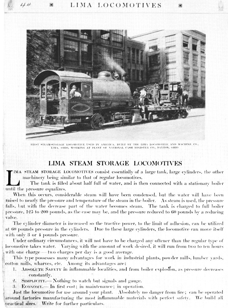 Lima steam storage locomotives consist essentially of a large tank, large cylinders, the other machinery being similar to that of regular locomotives.