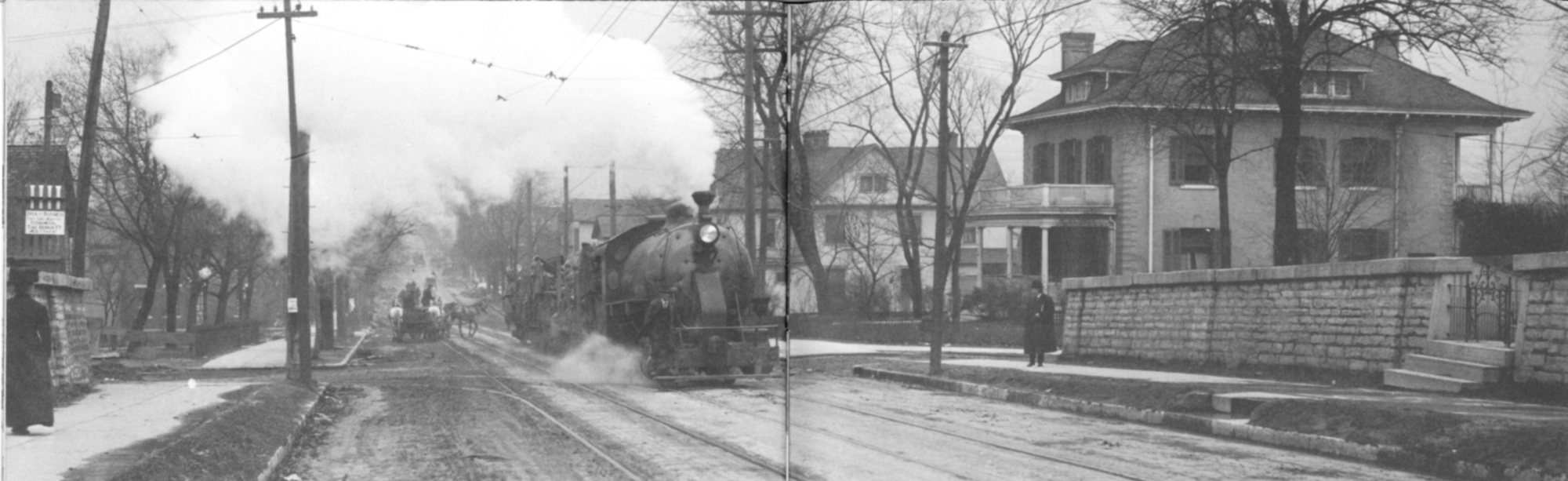 With several NCR employees aboard, the replacement engine makes its first run across Dayton’s South Main Street.