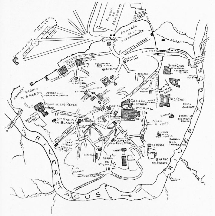The ambition of the author has not been to throw fresh light on a well-worn subject, nor to{viii} supplement the work of earlier and more erudite writers with new facts or theories, but simply, as in the case of the earlier volumes in this series, to equip the illustrations with a brief, explanatory text. It would be futile to attempt to even outline the story of Toledo in some hundred and fifty pages of letterpress, but I hope it may be found that in this limited space sufficient detail has been given to convey to the reader a general idea of the changing fortunes and unchanging character of the city, which Padilla has described as “the crown of Spain, the light of the world, free from the time of the mighty Goths.”