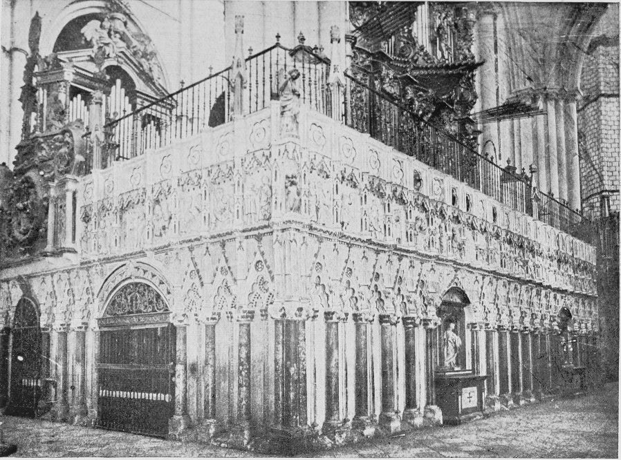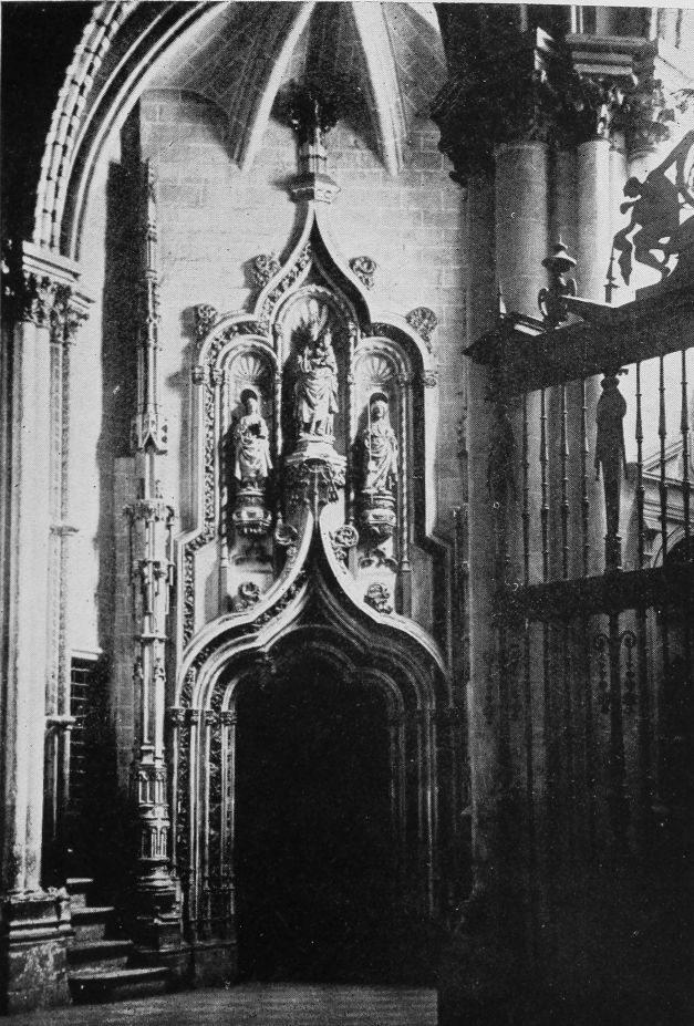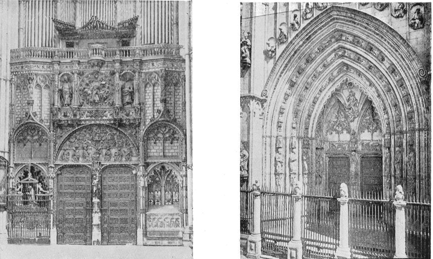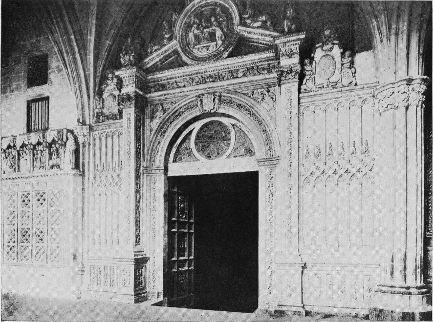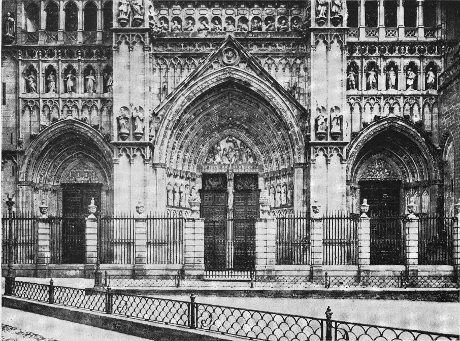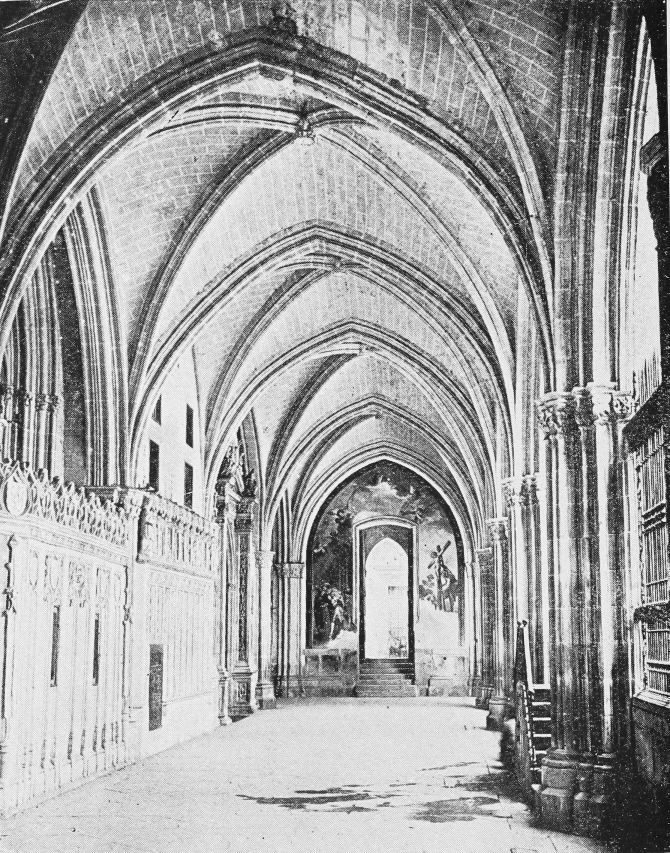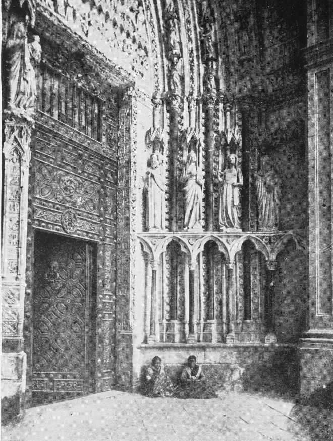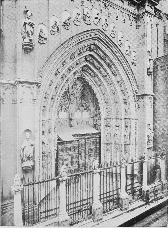 The impression of grandeur and melancholy, of strength and silence, which the traveller receives from a visit to the one-time capital of the Peninsula, cannot be suggested by the written word, but it may be that the illustrations will recall, if they do not suggest, the feeling which the city inspires. Toledo is mediæval in its architecture and its atmosphere. The Moorish occupation has left no more than a scratch upon its Gothic character; the spirit of modernity has been defied by its virile antiquity. But the Moslem remains have been made a feature of the illustrations, and, as in the volumes devoted to Seville, Cordova, and Granada in this series, the intricacies of Arabian decoration have been extensively reproduced.