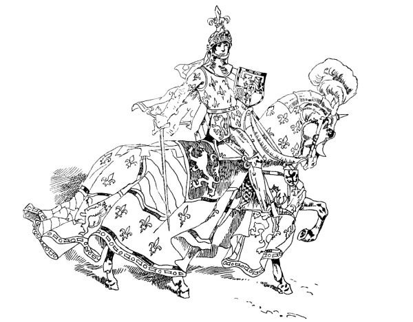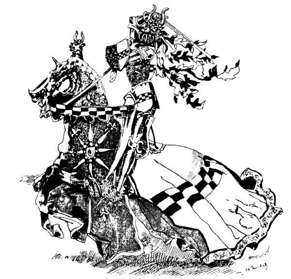 Most of us owe our early impressions of the tournament to the delightful account of the “Gentle and Joyous Passage of Arms” of Ashby de la Zouche, in the county of Leicester, given by Sir Walter Scott in his fine romance Ivanhoe. But that eminent novelist, in presenting to his readers the picture of a pas d’armes of the times of the lion-hearted Richard, took a poet’s licence by describing a jousting and mêlée such as belonged, in many details, to a time later than Richard’s by some two and a half centuries. The knightly armour of the reign of King Richard was of chain-mail, while that of the times of Henry VI was, of course, a complete harness of plate. The first-named equipment is thus described by Sainte-Palaye: “Une lance forte et dificile à rompre, un haubert ou haubergeon, c’est à dire, une double cotte de mailles, tissues de fer, à l’epreuve de l’épée, étoient les armes assignées aux Chevaliers.”[1]