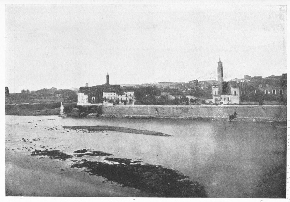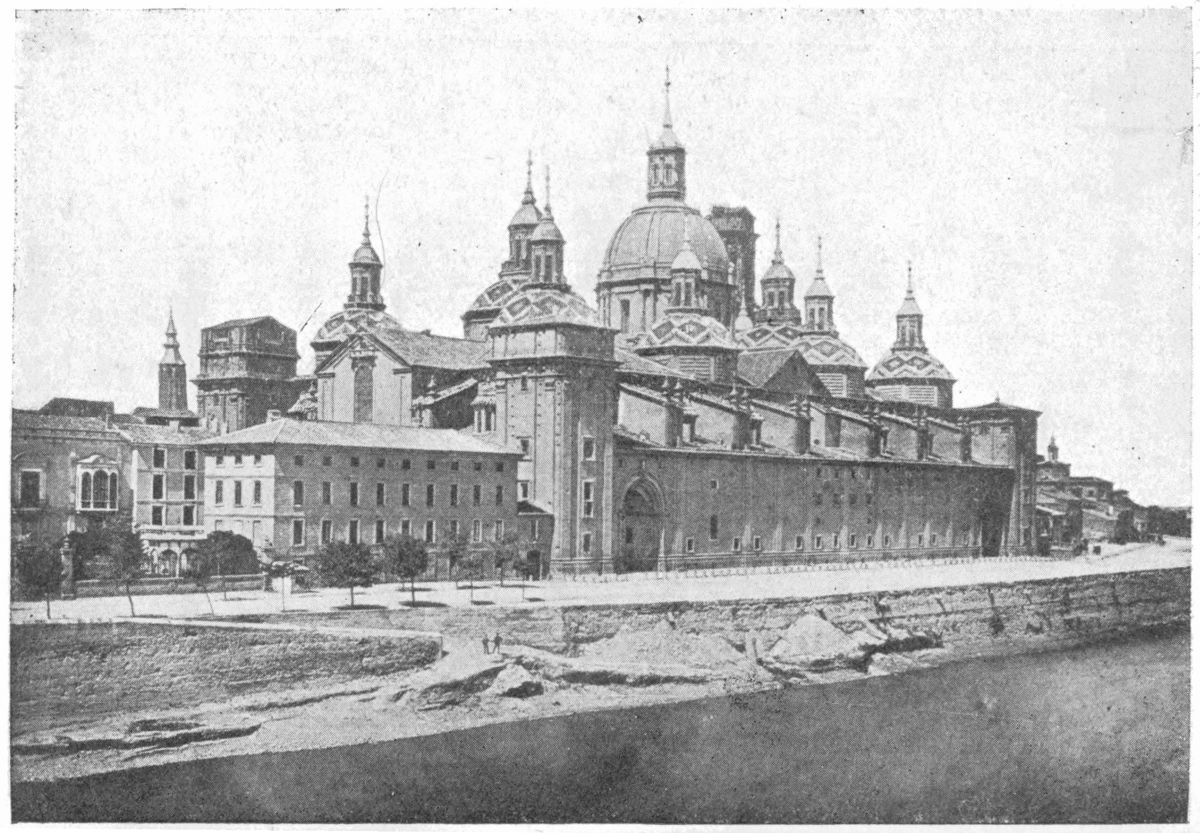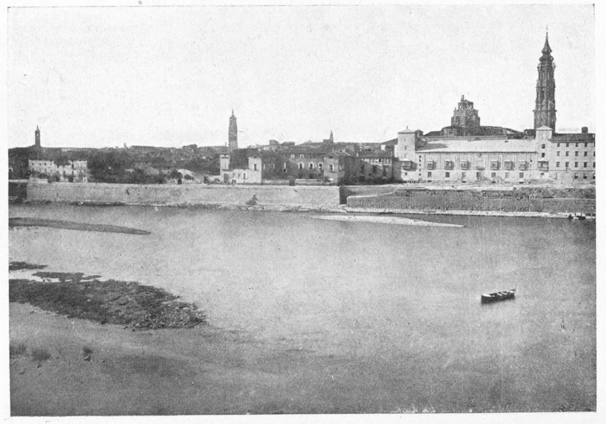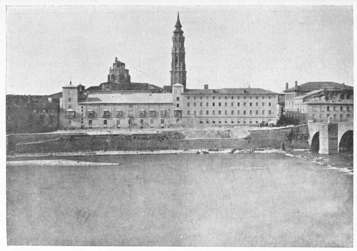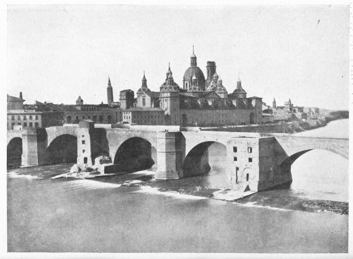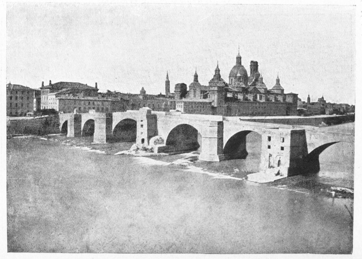 Close by, the yellow Ebro is spanned by the seven arches of the Puente de Piedra. Its origin is of unknown antiquity. It was here in 1435, when one of the arches collapsed—presaging the destruction by the Genoese of the Aragonese fleet which sailed that day; and the inscription mentioning Alfonso V., and the date 1437, can only refer to its reconstruction. And across this bridge we pass into the stern, desert country of Aragon, and so on to the distant, gleaming Pyrenees.{163}