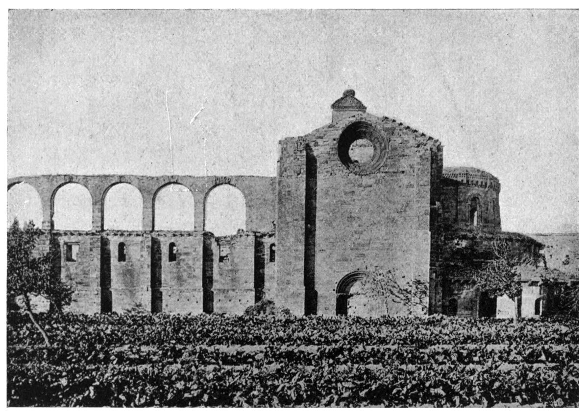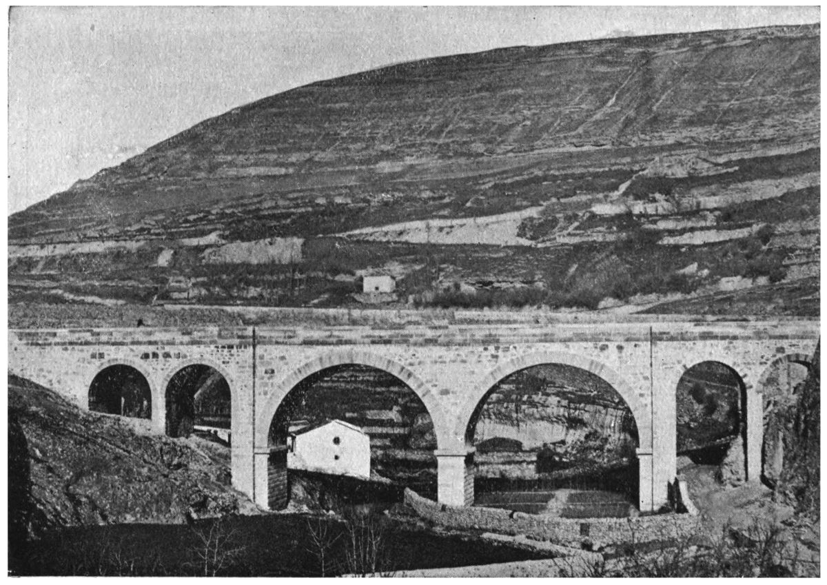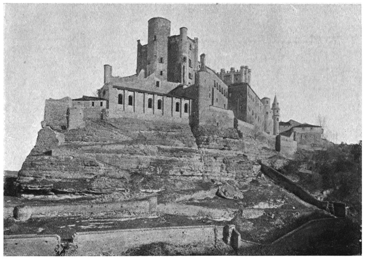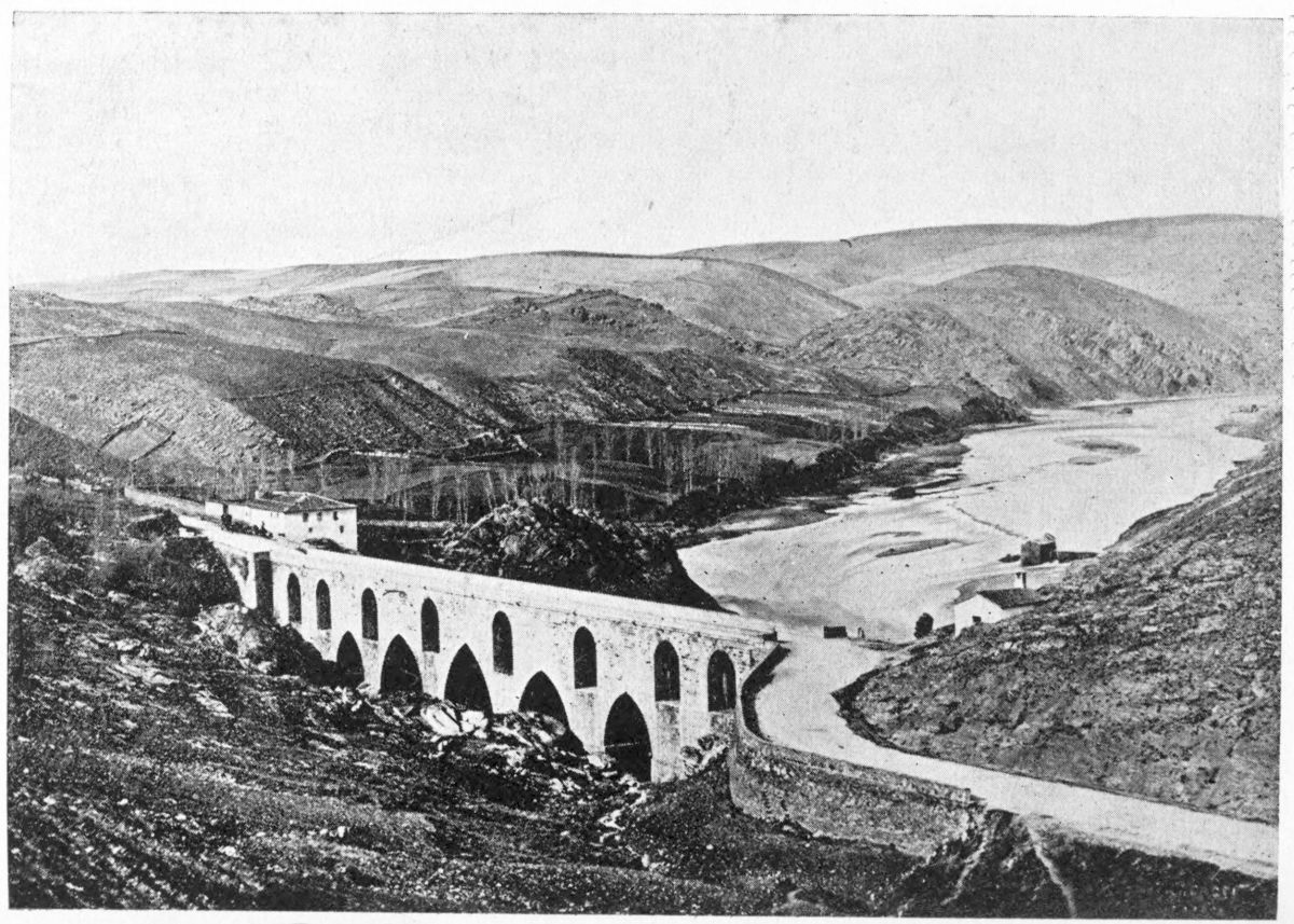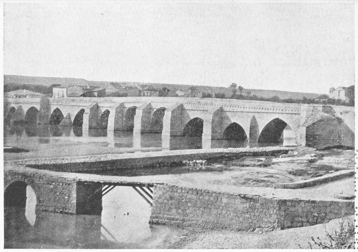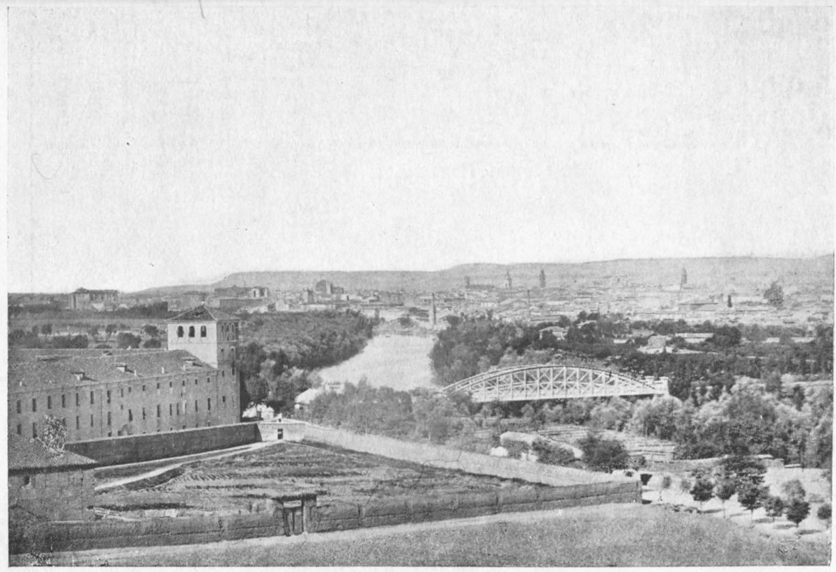 Close by, the yellow Ebro is spanned by the seven arches of the Puente de Piedra. Its origin is of unknown antiquity. It was here in 1435, when one of the arches collapsed—presaging the destruction by the Genoese of the Aragonese fleet which sailed that day; and the inscription mentioning Alfonso V., and the date 1437, can only refer to its reconstruction. And across this bridge we pass into the stern, desert country of Aragon, and so on to the distant, gleaming Pyrenees.{163}