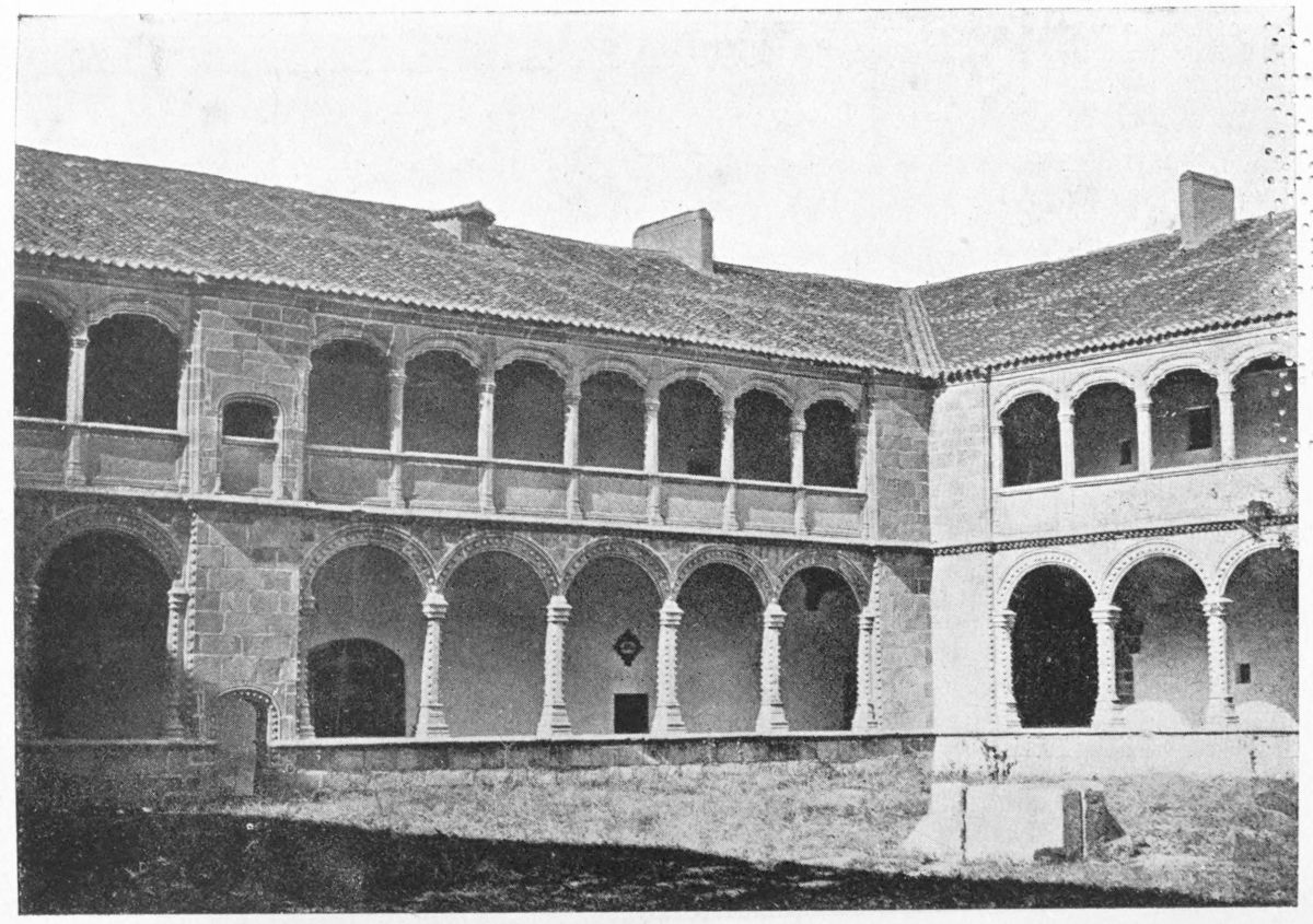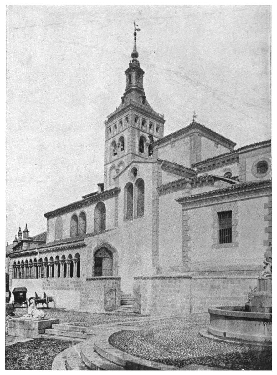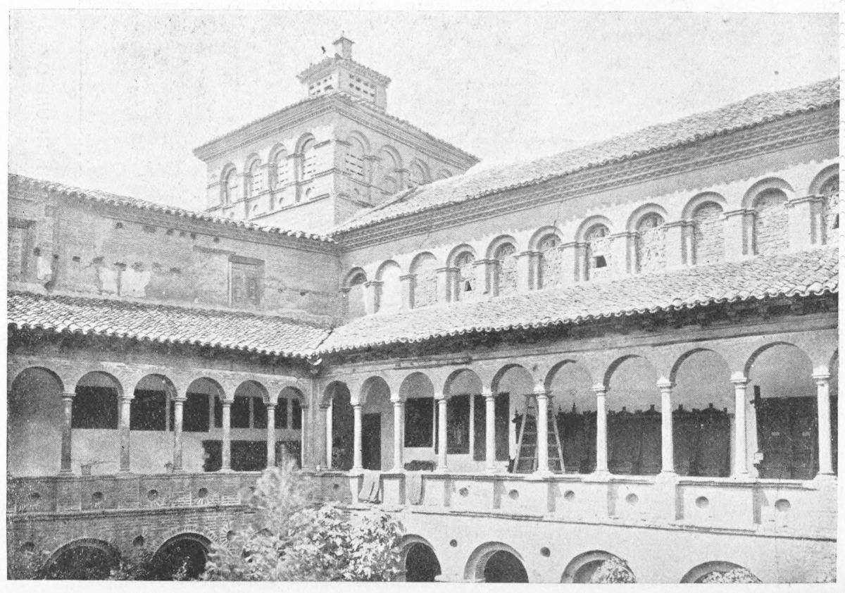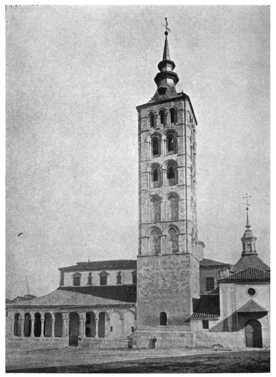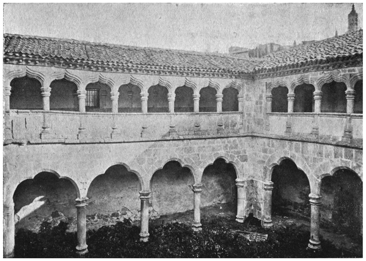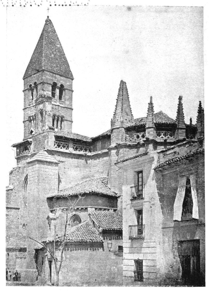 On the north this venerable church is flanked by a very beautiful Romanesque cloister of fourteen semicircular arches in three bays. The shafts, says Street, are moulded and wrought in imitation of the coupled columns of early Italian artists. This cloister, together with the steeple, makes up the most picturesque group of buildings in Valladolid, and is well worth careful preservation, if not restoration.