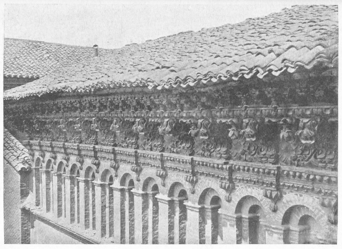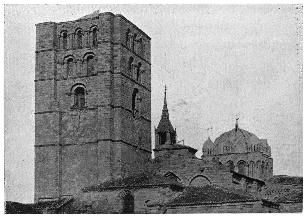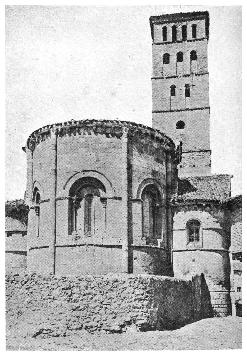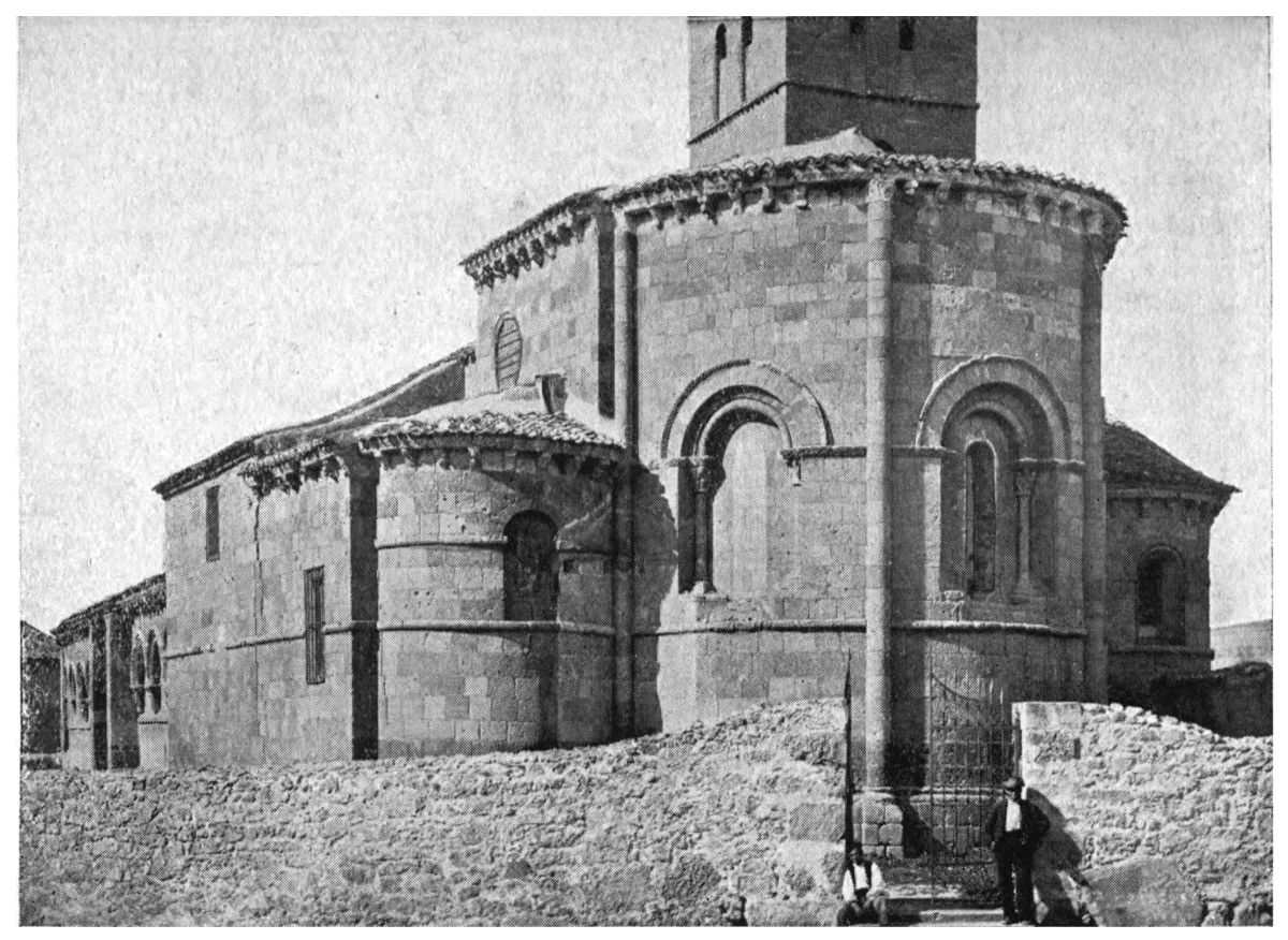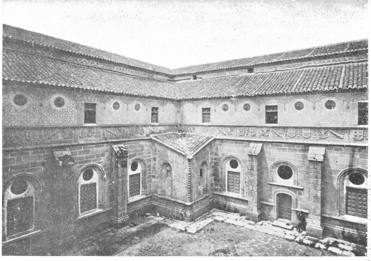 On the north this venerable church is flanked by a very beautiful Romanesque cloister of fourteen semicircular arches in three bays. The shafts, says Street, are moulded and wrought in imitation of the coupled columns of early Italian artists. This cloister, together with the steeple, makes up the most picturesque group of buildings in Valladolid, and is well worth careful preservation, if not restoration.