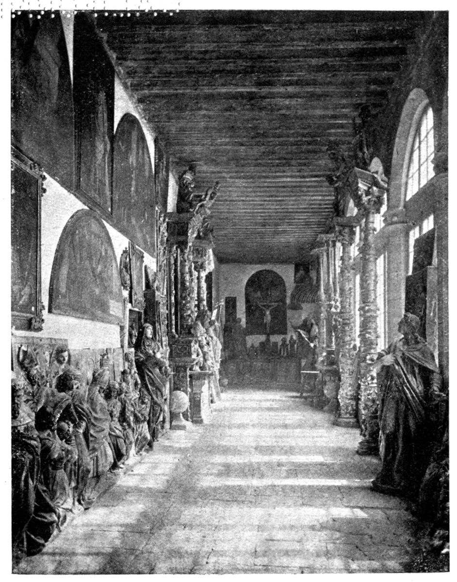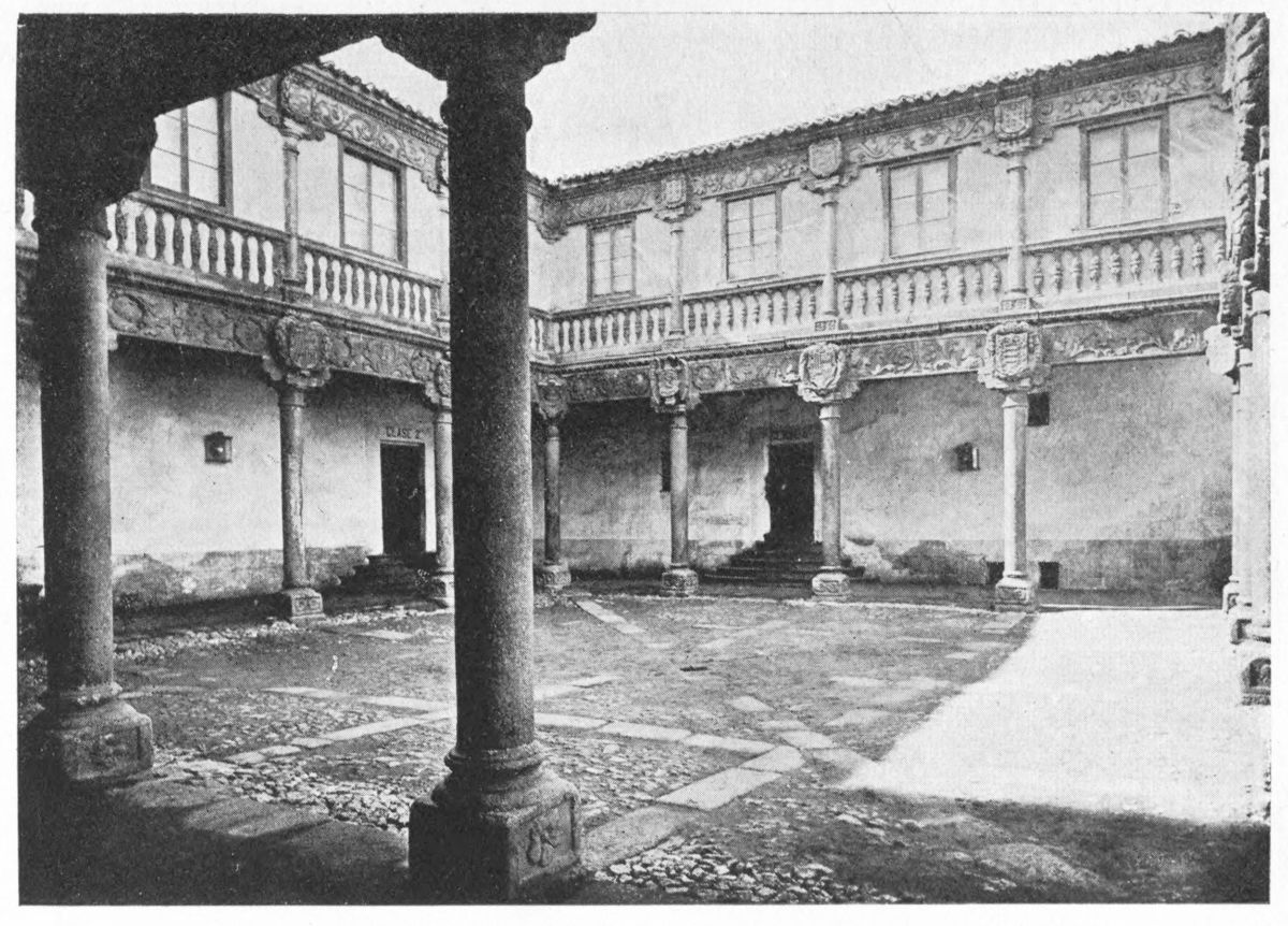 Sculpture is the art that has been least cultivated in Spain. Exceptional interest attaches,{33} therefore, to the Museum of Valladolid, which contains a valuable collection of the works of native sculptors, or rather carvers. The building itself is the old College of Santa Cruz, built in 1486 by the famous Enrique de Egas, and intended by the founder, Cardinal Mendoza (el tercer Rey) to harbour impoverished genius. The exterior is surmounted by a balustrade, and strengthened with buttresses tapering into pinnacles. The principal façade is a fine example of Plateresque work, with much that is Gothic about the detail. The coats-of-arms of the Catholic kings and of the founder appear, of course, in the decoration, and the cardinal is shown adoring the cross upheld by St. Helen. The inner court is surrounded by a triple tier of galleries, with semicircular arches, octagonal pillars, and elegant balustrades.