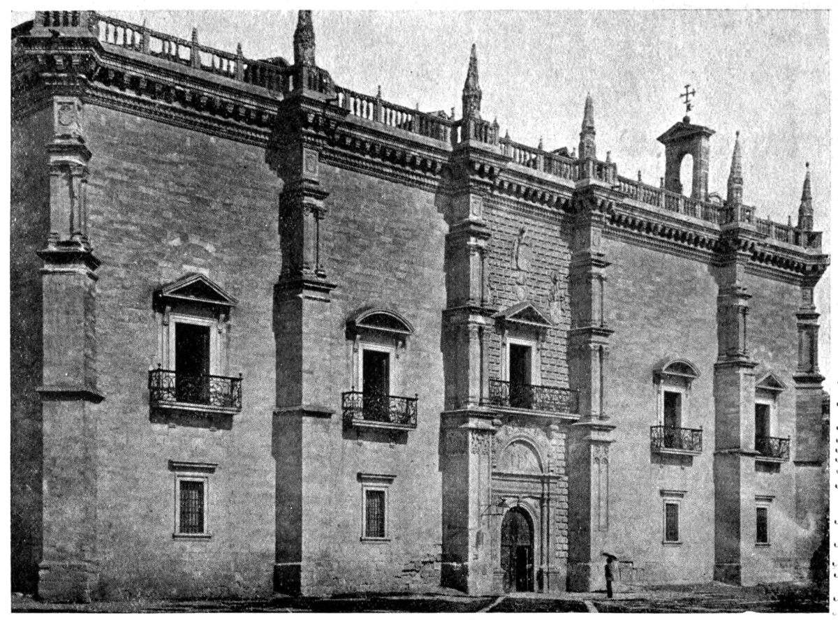 Not far from the museum is the house where Columbus died (No. 7 Cristobal Colon). He came hither on his return from his last voyage in 1504, and languished here, absolutely neglected by the cold-hearted Ferdinand, for eighteen months. From Philip and Joanna he hoped to obtain a fuller recognition of his services, and upon their landing in Spain he sent them the assurance of his homage and respect. Philip acknowledged this in a generous and kindly spirit—an act which, together with his oft-expressed disapprobation of the Inquisition, should be remembered to the handsome Burgundian’s credit. But on the 21st May 1506, Columbus went on a longer voyage than any he had made to the Indies—to the undiscovered country whence no traveller returns. He left two sons—Hernando, who, like his father, lies in the cathedral of Seville, and Diego, the ancestor of the present Duke of Veragua.