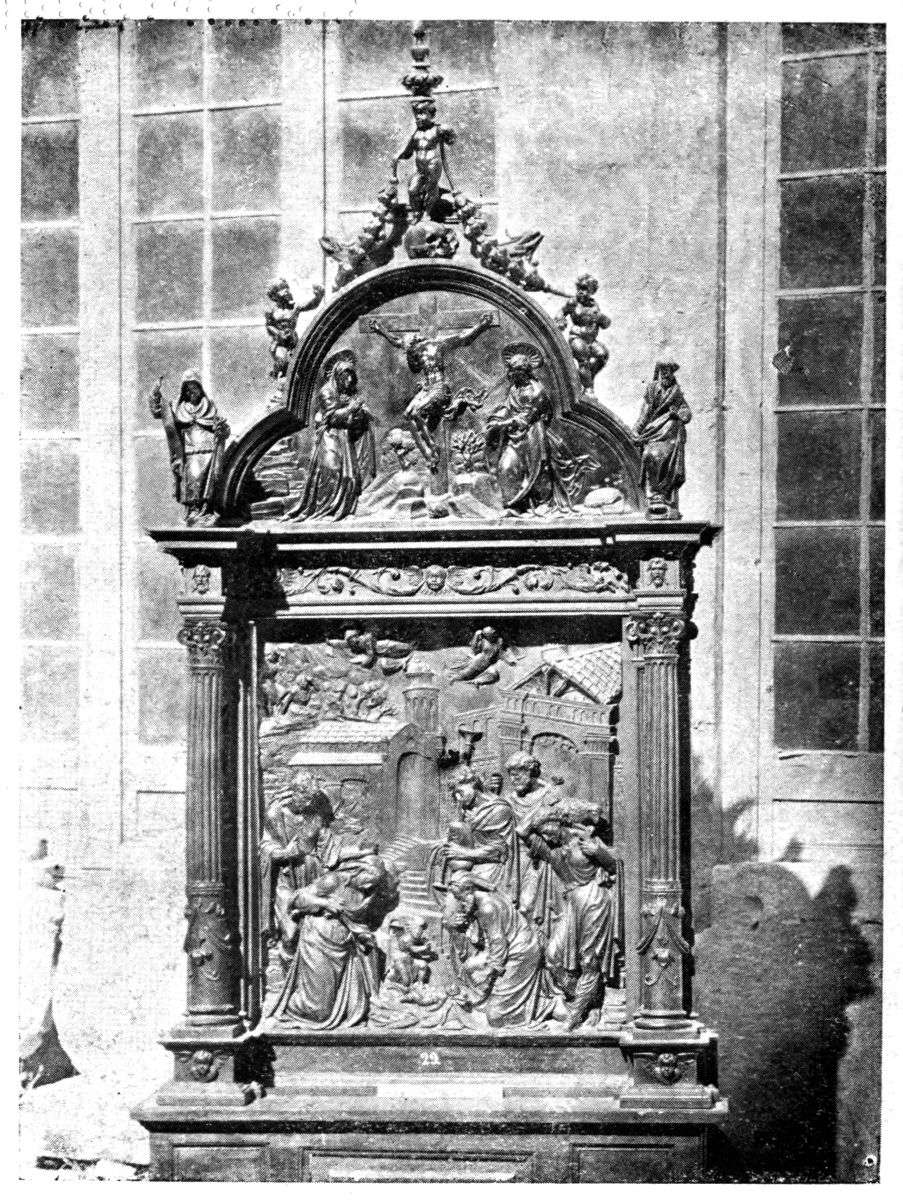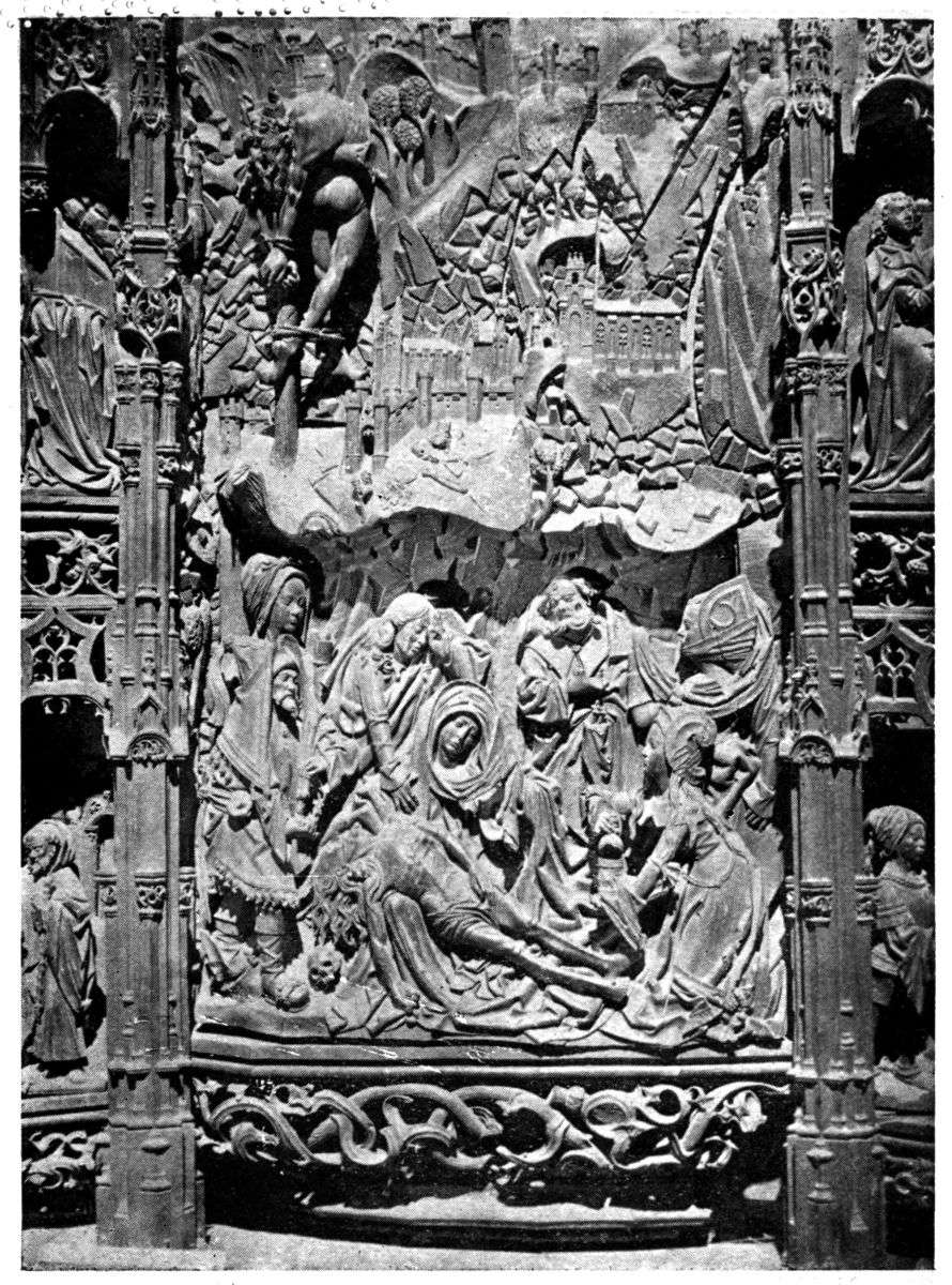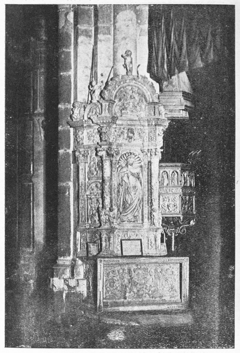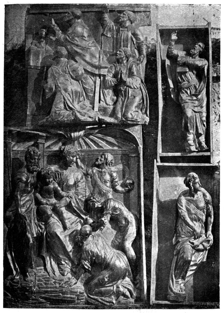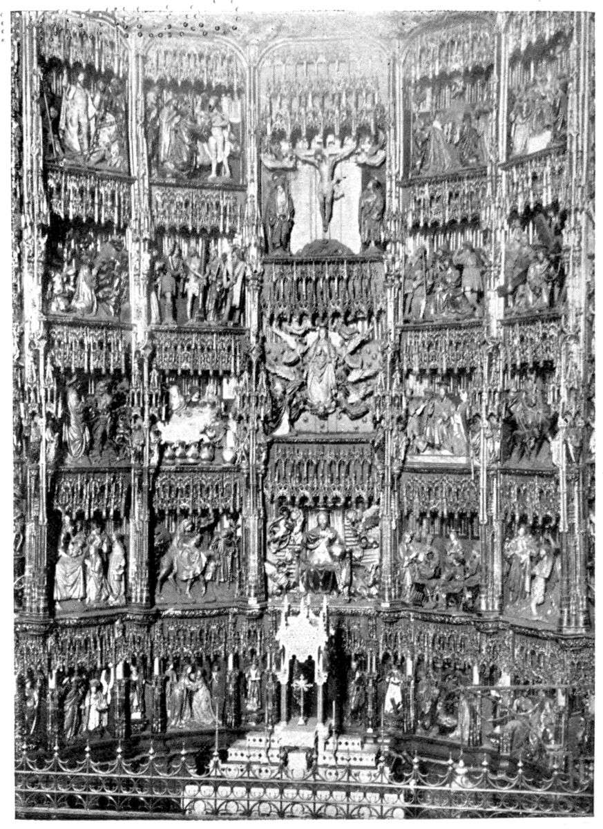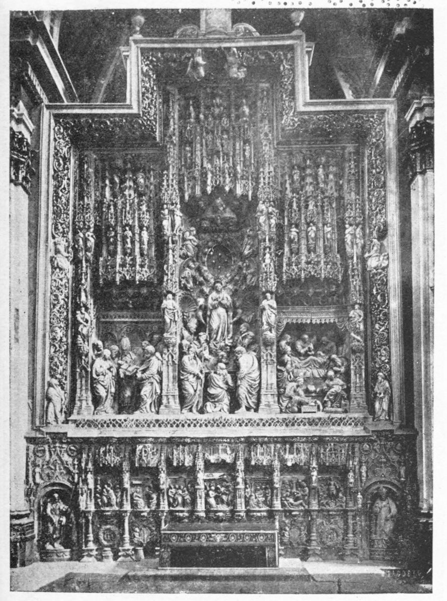 The High Altar of the cathedral is of alabaster and in the Gothic style, the work of one Damian Forment, an early sixteenth-century artist. The lower reliefs, separated by slender pilasters, represent the Espousals of the Virgin, the Annunciation, the Visitation, the Nativity, the Adoration of the Magi, the Crucifixion, and the Resurrection. Above, in canopied niches, are the Assumption, the Nativity, and the Presentation. The canopies are richly adorned with the figures of saints. At the sides are two large statues of St. James and St. Braulio—objects of special devotion—and at the apex of the altar-screen are two angels supporting Our Lady of the Pillar. The whole is undoubtedly the finest work of art in the cathedral.