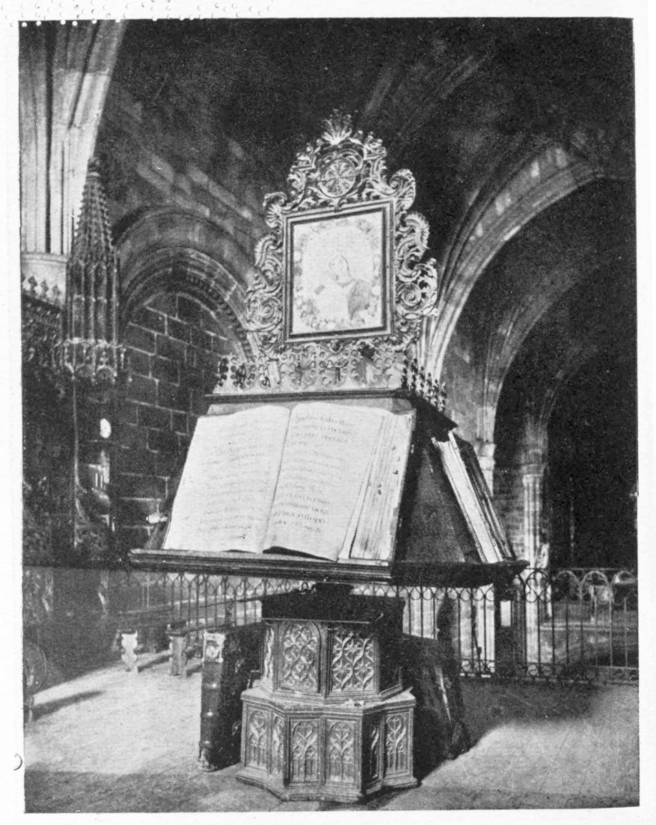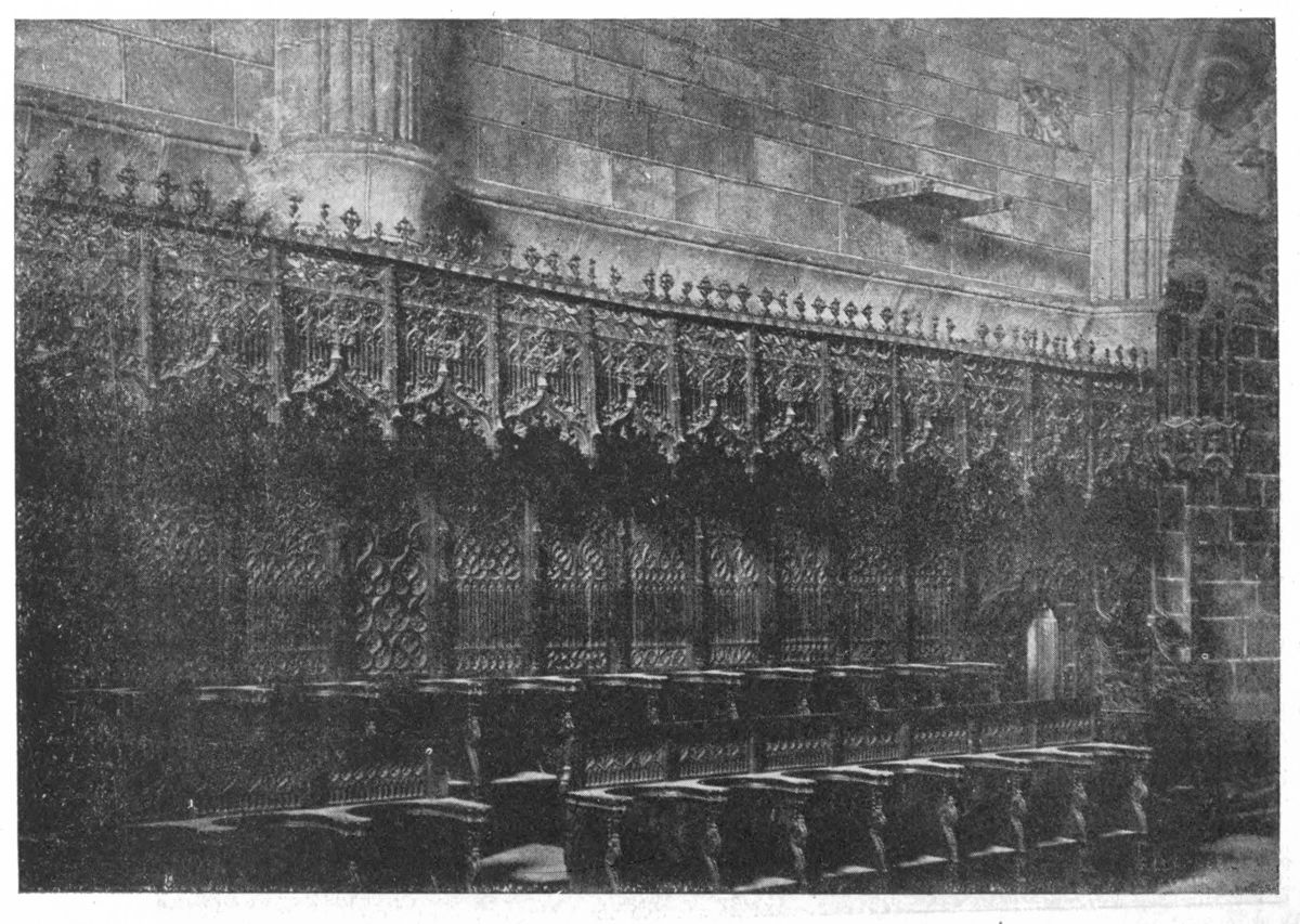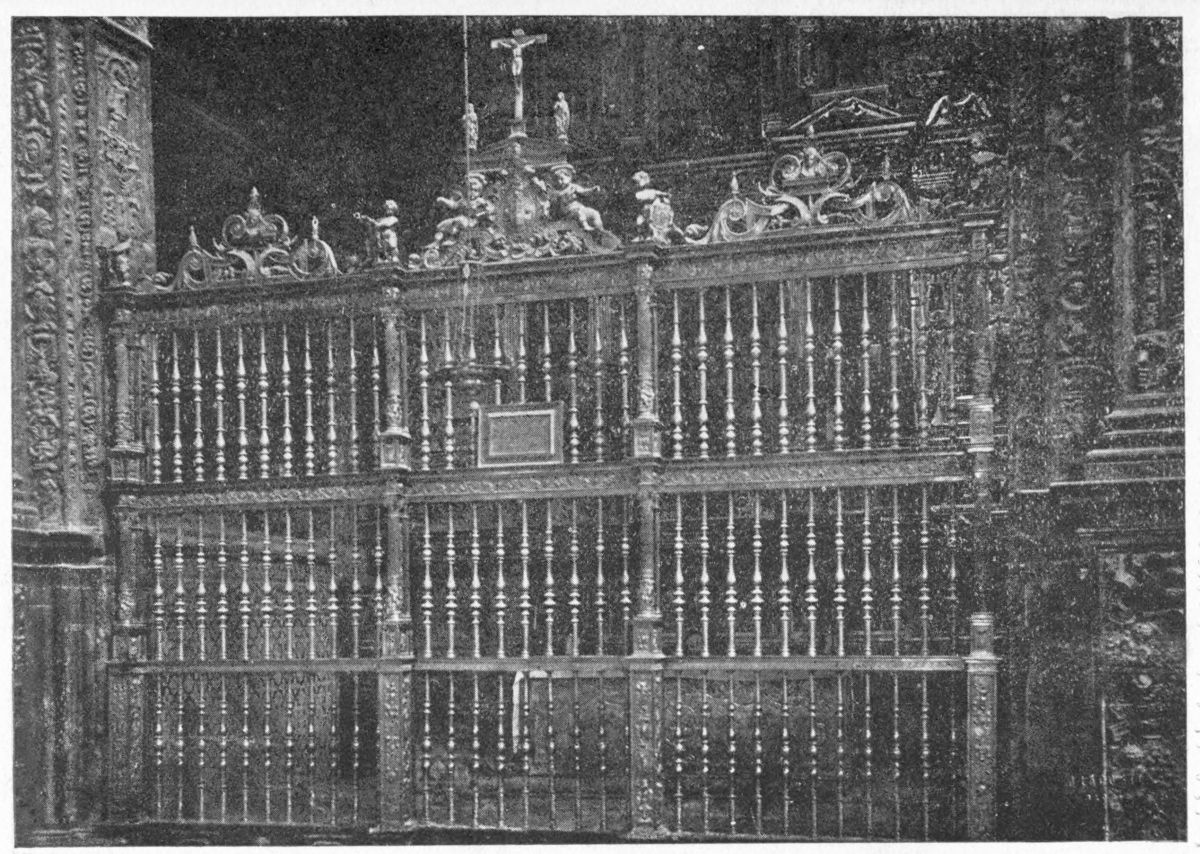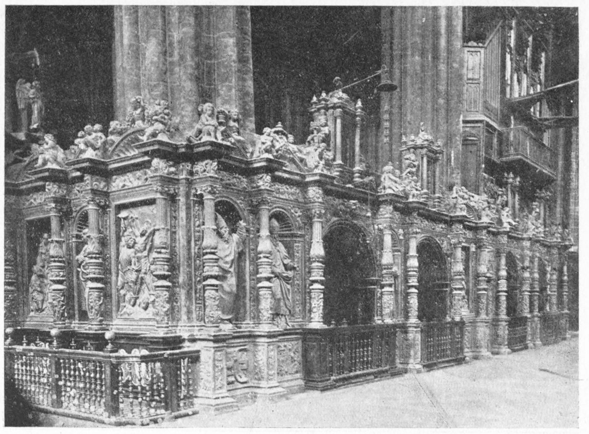 The choir occupies two of the five bays west of the crossing. It is in the Gothic style, and closed by a modern railing. In the centre is the tomb of Archbishop de Mede, from whose time the choir dates. The stalls are of Flemish oak. The fine lectern dates from 1413. The trascoro, or back of the choir, is a gorgeous plateresque affair in marble and stucco, the work of Tudelilla of Tarazona, who flourished about 1538. His are the statues of the martyrs Vincent and Laurence, the four reliefs illustrating their martyrdom, and that of San Valero, and the groups of cherubim. The tabernacle is in a not untasteful baroque style, and has side columns of black marble and{152} a good crucifix. This figure of Christ is said to have addressed Canon Funes, afterwards Bishop of Albarracin, who is shown on his knees regarding it. The sides of the choir are adorned with statues of saints, including that of Pedro de Arbues, on the very spot where he was slain.