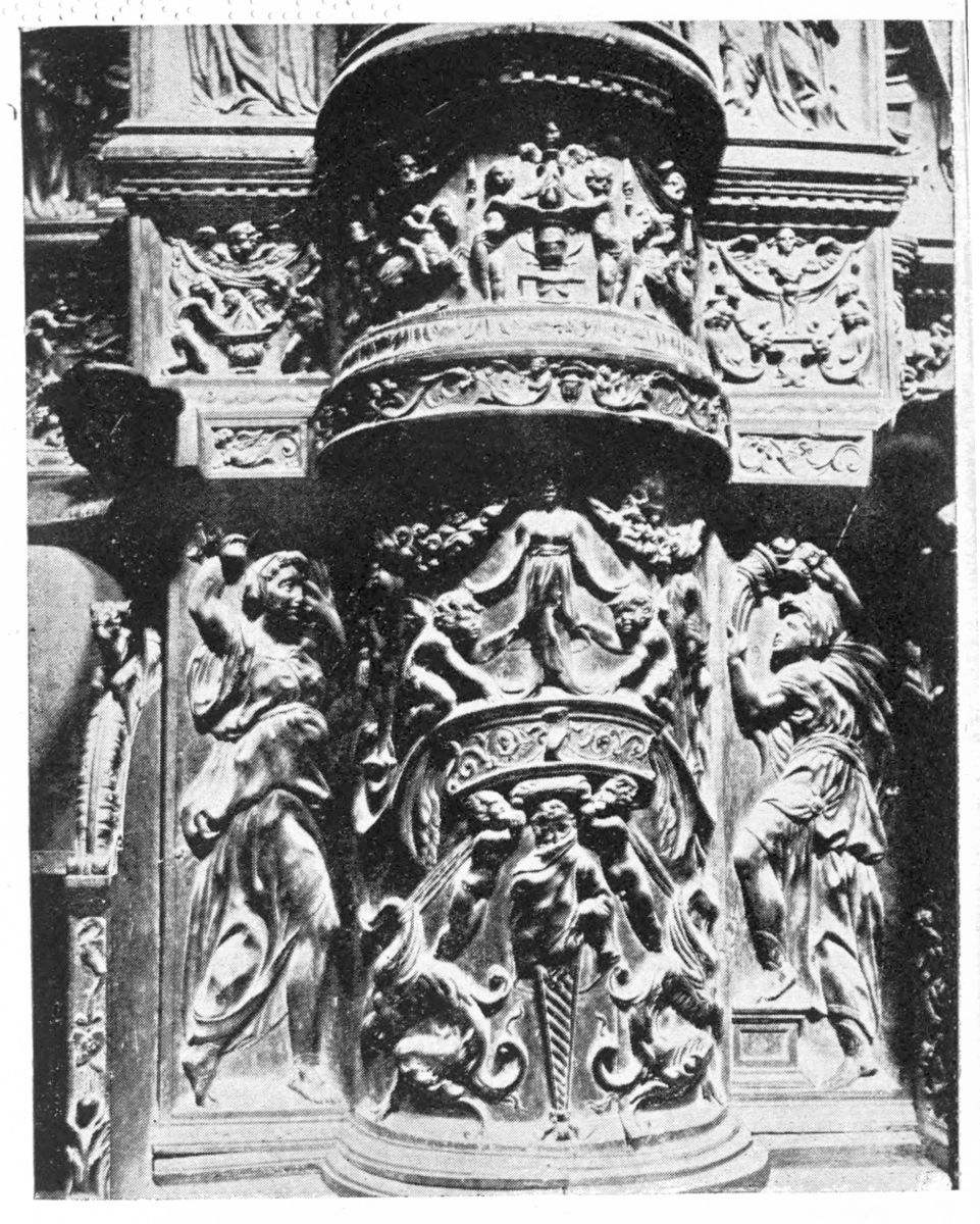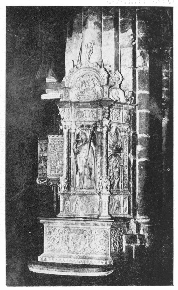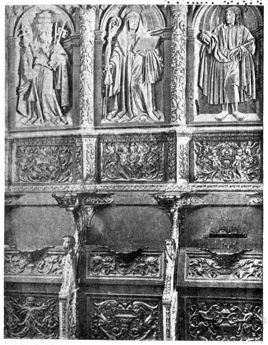 The choir occupies two of the five bays west of the crossing. It is in the Gothic style, and closed by a modern railing. In the centre is the tomb of Archbishop de Mede, from whose time the choir dates. The stalls are of Flemish oak. The fine lectern dates from 1413. The trascoro, or back of the choir, is a gorgeous plateresque affair in marble and stucco, the work of Tudelilla of Tarazona, who flourished about 1538. His are the statues of the martyrs Vincent and Laurence, the four reliefs illustrating their martyrdom, and that of San Valero, and the groups of cherubim. The tabernacle is in a not untasteful baroque style, and has side columns of black marble and{152} a good crucifix. This figure of Christ is said to have addressed Canon Funes, afterwards Bishop of Albarracin, who is shown on his knees regarding it. The sides of the choir are adorned with statues of saints, including that of Pedro de Arbues, on the very spot where he was slain.