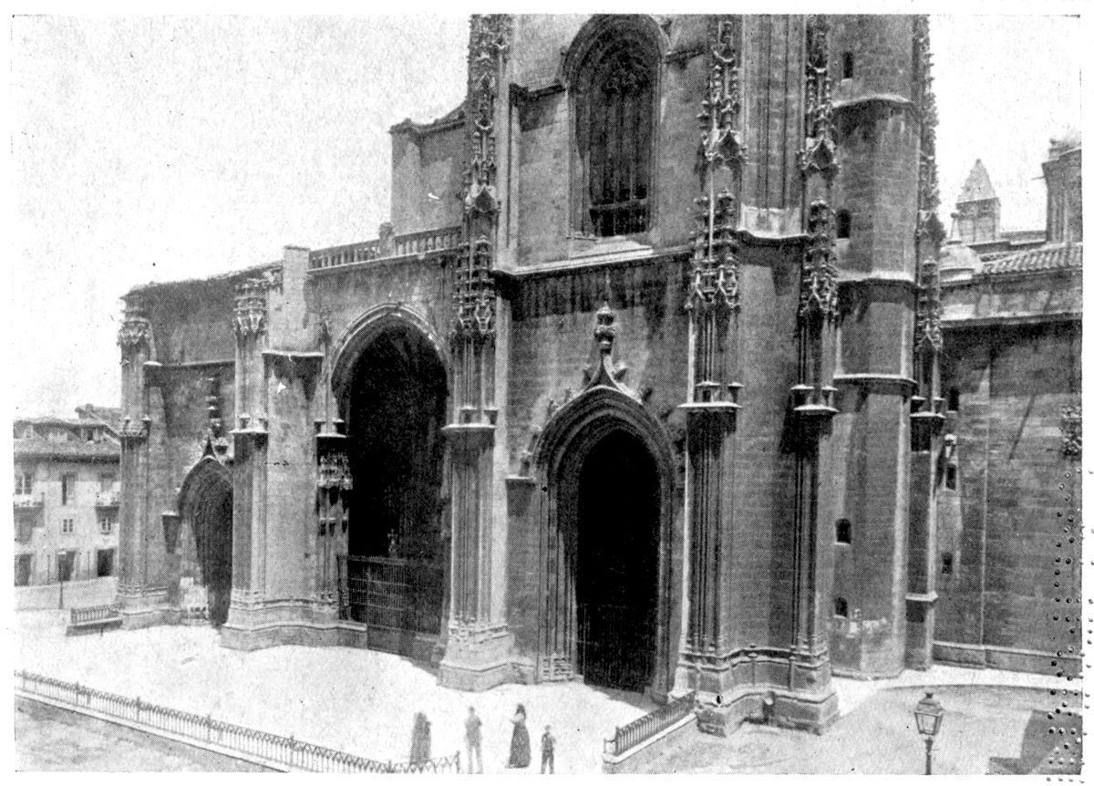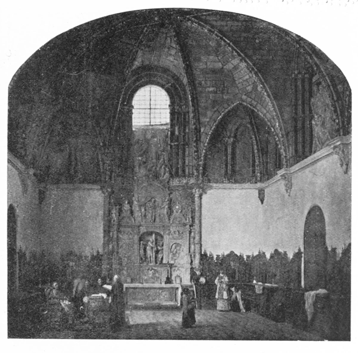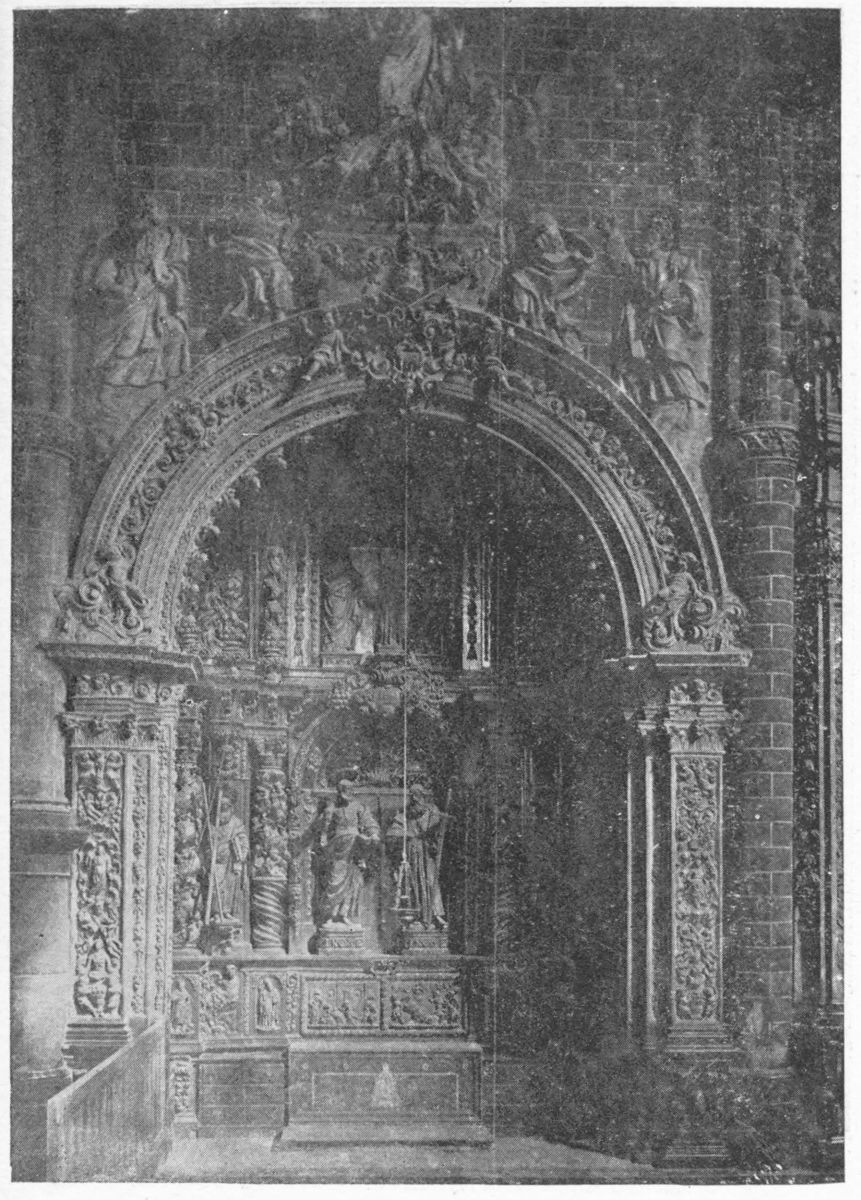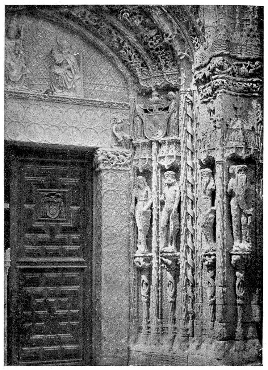 The interior exhibits an interesting blending of the Romanesque and Gothic styles. On the outer door, defaced by a modern portico, formerly hung the knockers wrenched off the gates of the Mezquita at Cordova by the first Count Armengol. The mouldings of the arch are Romanesque, but Gothic is the beautiful groining of the interior. At the west end of the church is a gallery for the choir, with stalls and organ. In the days when this was built churches were built for the laity, and the clergy did not insist on taking up the greater part of the nave, as they did in after years. The chapel of the Counts of Cancelada contains some good paintings. The most valu{26}able accessory is, however, the reredos by the celebrated Juan de Juni, begun in 1551 and finished in 1557. The work betrays an extraordinary degree of skill and vigour, but it is over-elaborate and in parts fantastic.
