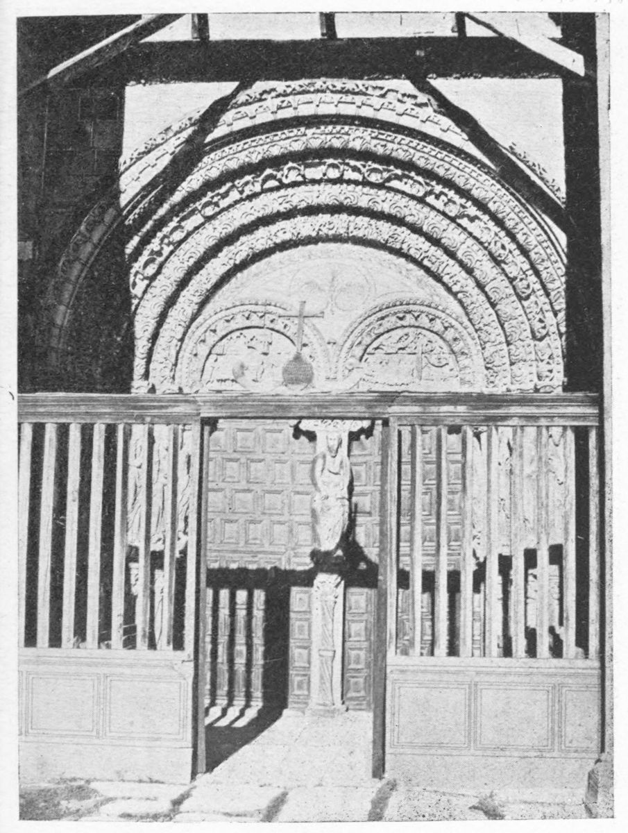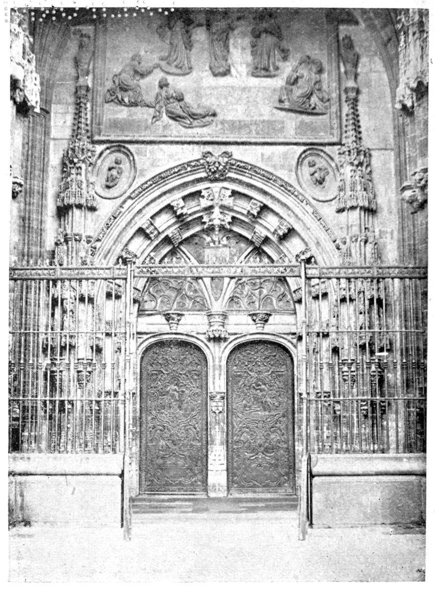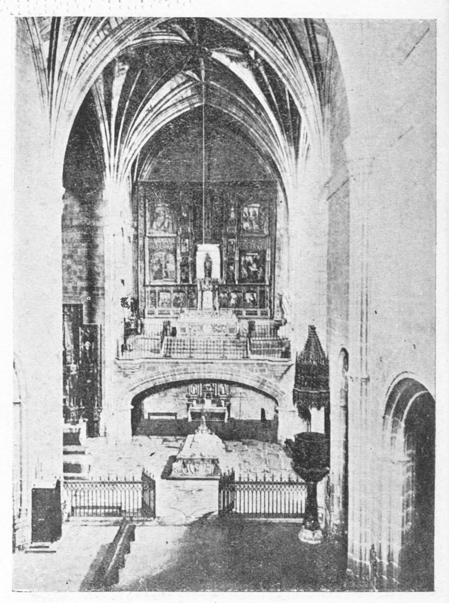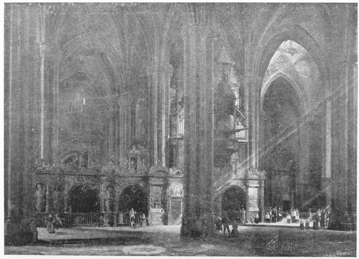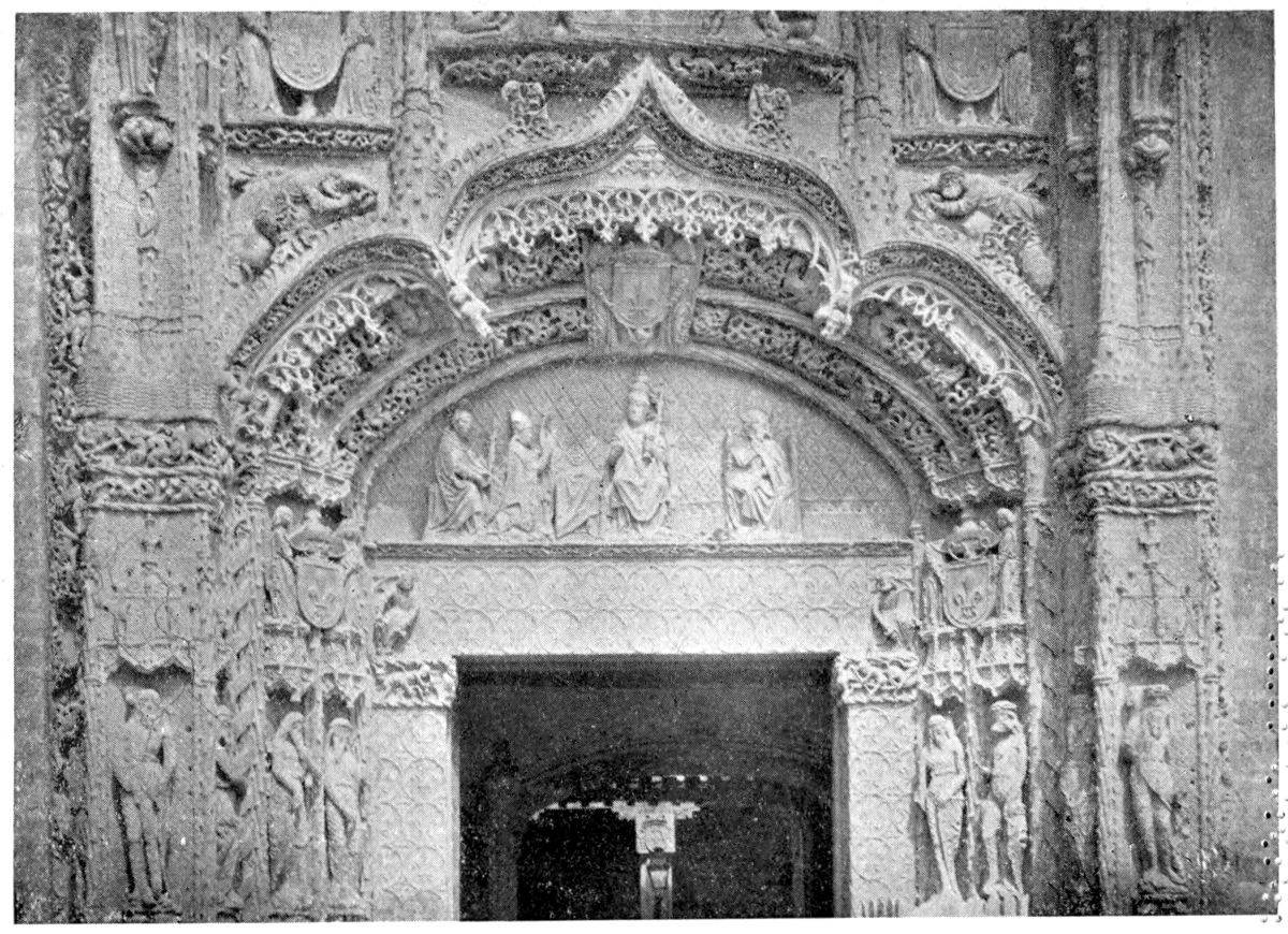 The interior exhibits an interesting blending of the Romanesque and Gothic styles. On the outer door, defaced by a modern portico, formerly hung the knockers wrenched off the gates of the Mezquita at Cordova by the first Count Armengol. The mouldings of the arch are Romanesque, but Gothic is the beautiful groining of the interior. At the west end of the church is a gallery for the choir, with stalls and organ. In the days when this was built churches were built for the laity, and the clergy did not insist on taking up the greater part of the nave, as they did in after years. The chapel of the Counts of Cancelada contains some good paintings. The most valu{26}able accessory is, however, the reredos by the celebrated Juan de Juni, begun in 1551 and finished in 1557. The work betrays an extraordinary degree of skill and vigour, but it is over-elaborate and in parts fantastic.