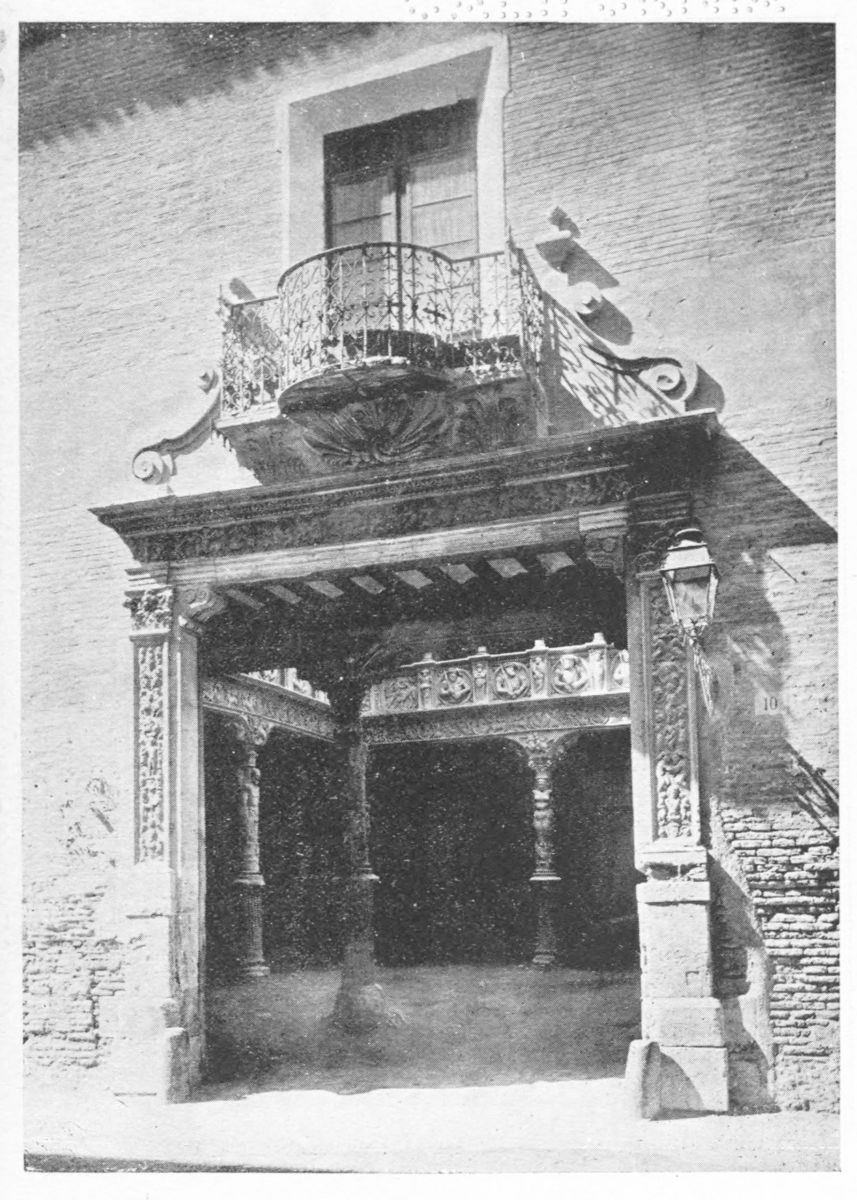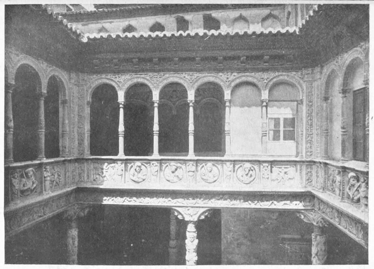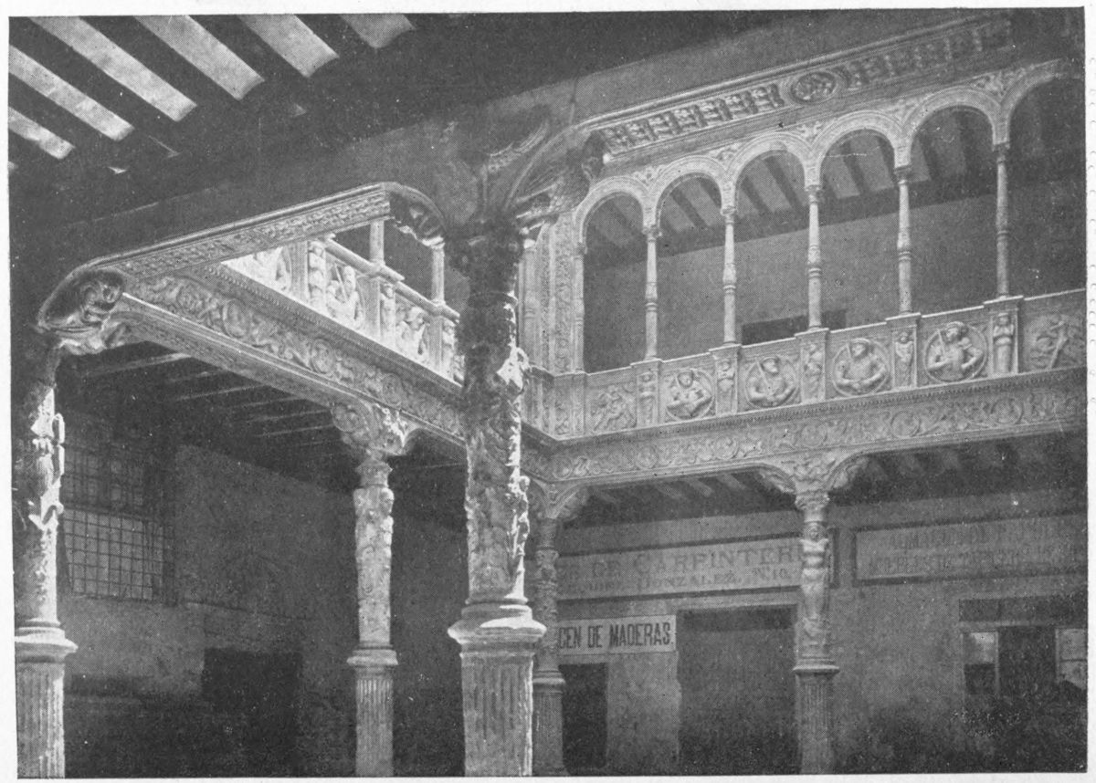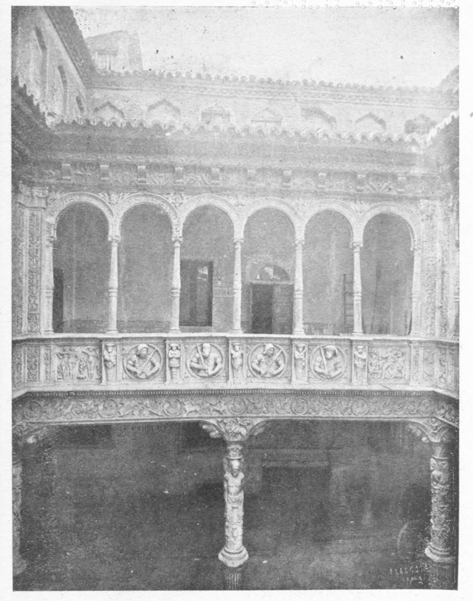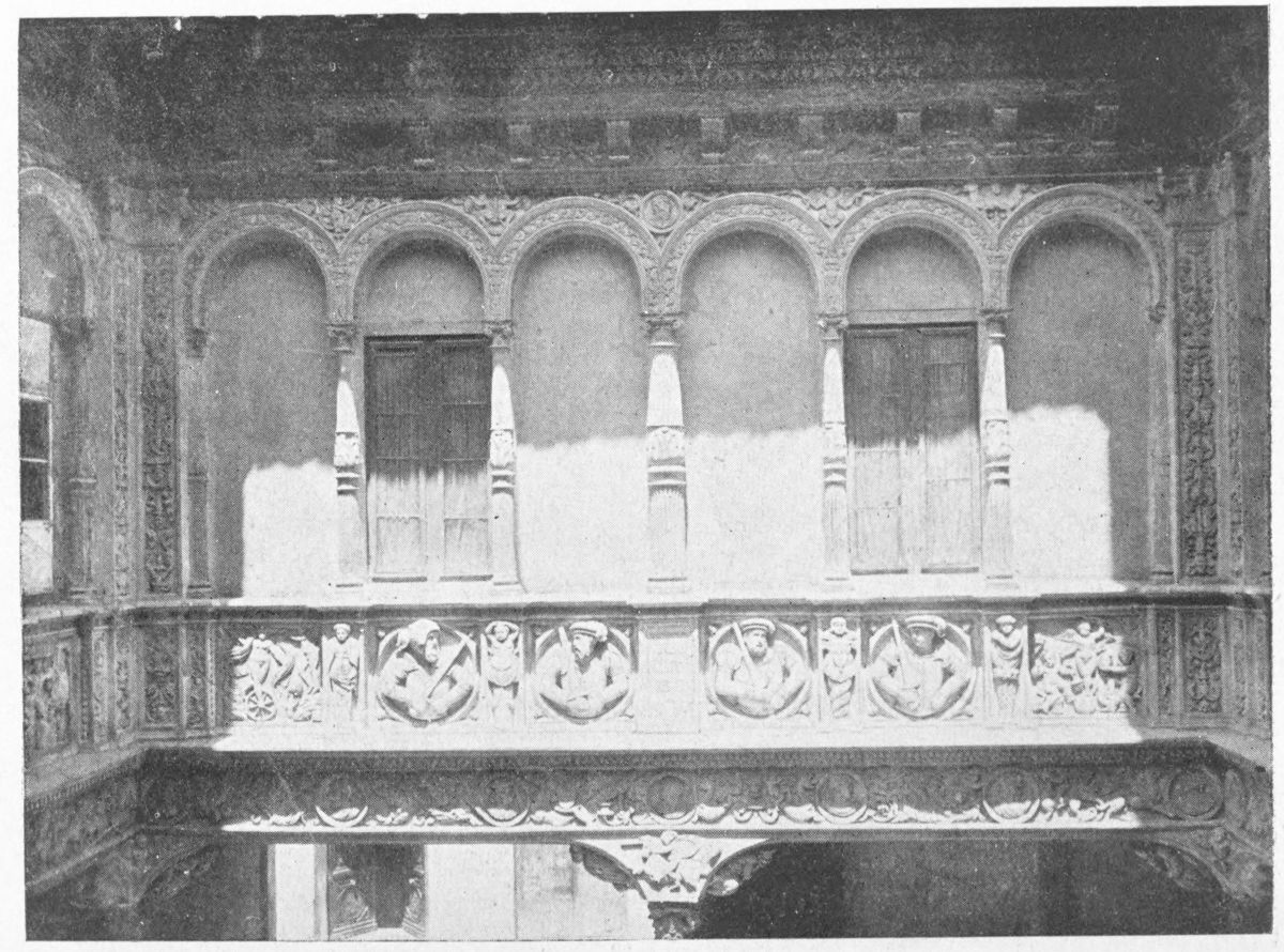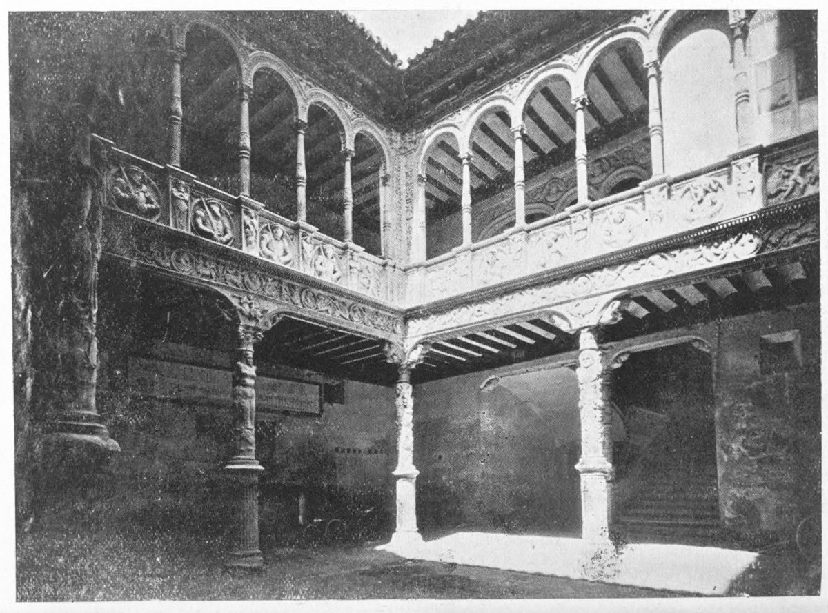 A great many of the fine old mansions (solares) of the aristocracy and merchants of Zaragoza disappeared in the siege, or to permit of modern improvements. Those which remain date mostly from the sixteenth century. The finest, on the whole, is the Casa de la Infanta, so-called as having been the residence of La Vallabriga, a lady banished from Madrid for marrying the{158} Infante Don Luis. The house was built by a rich merchant named Gabriel Zaporta in the middle of the sixteenth century. A square entrance admits to a court, round which runs a gallery, upheld by columns on fluted pedestals, and formed of caryatide figures interlocked. On these rest the capitals, elaborately carved with masks, and on these again is borne the gallery, the arches and parapet of which are enriched with medallions, masks, grotesques, and foliage. The decoration is a fine specimen of the plateresque style. The staircase, in the same style, is worthy of note.