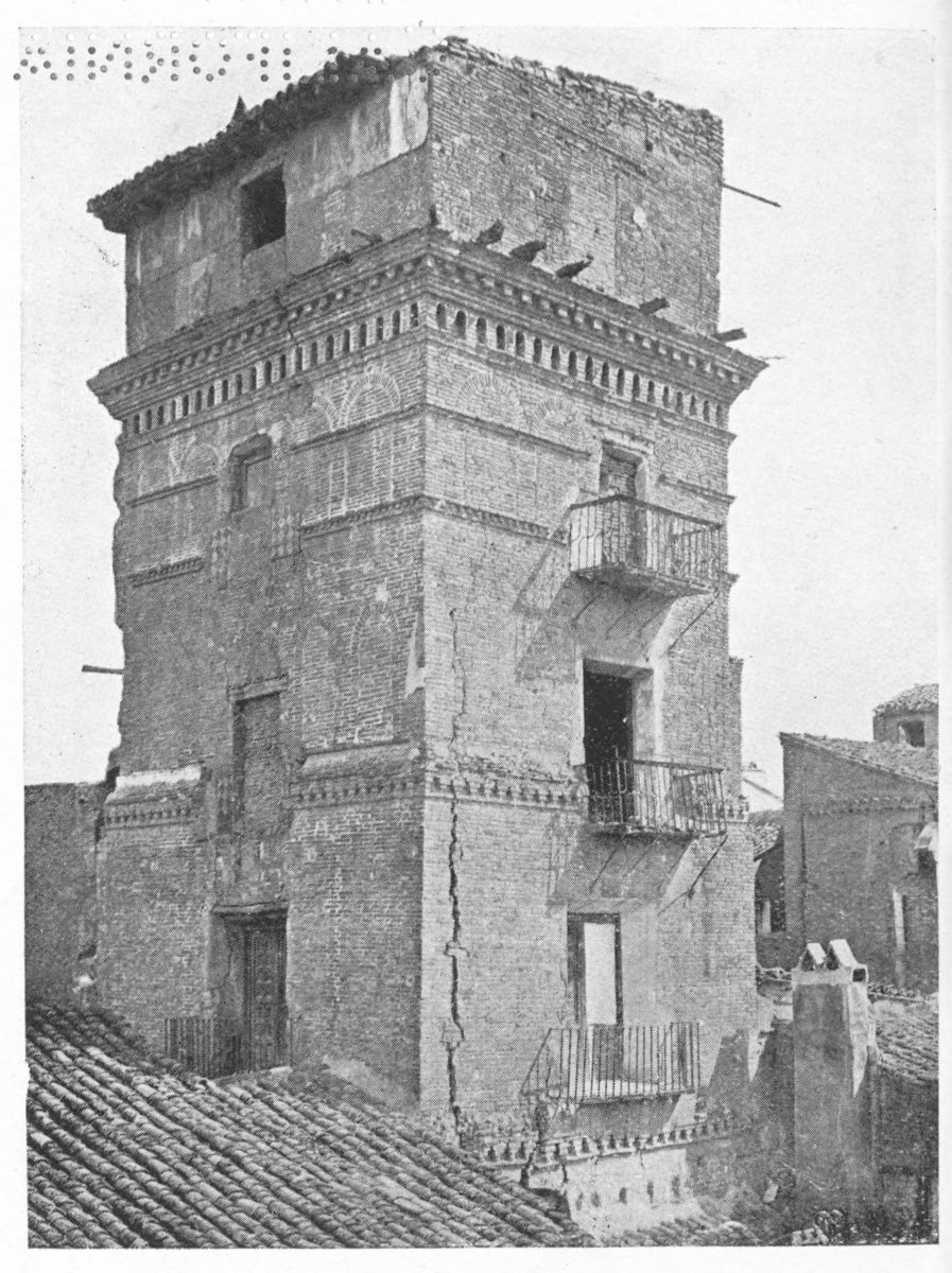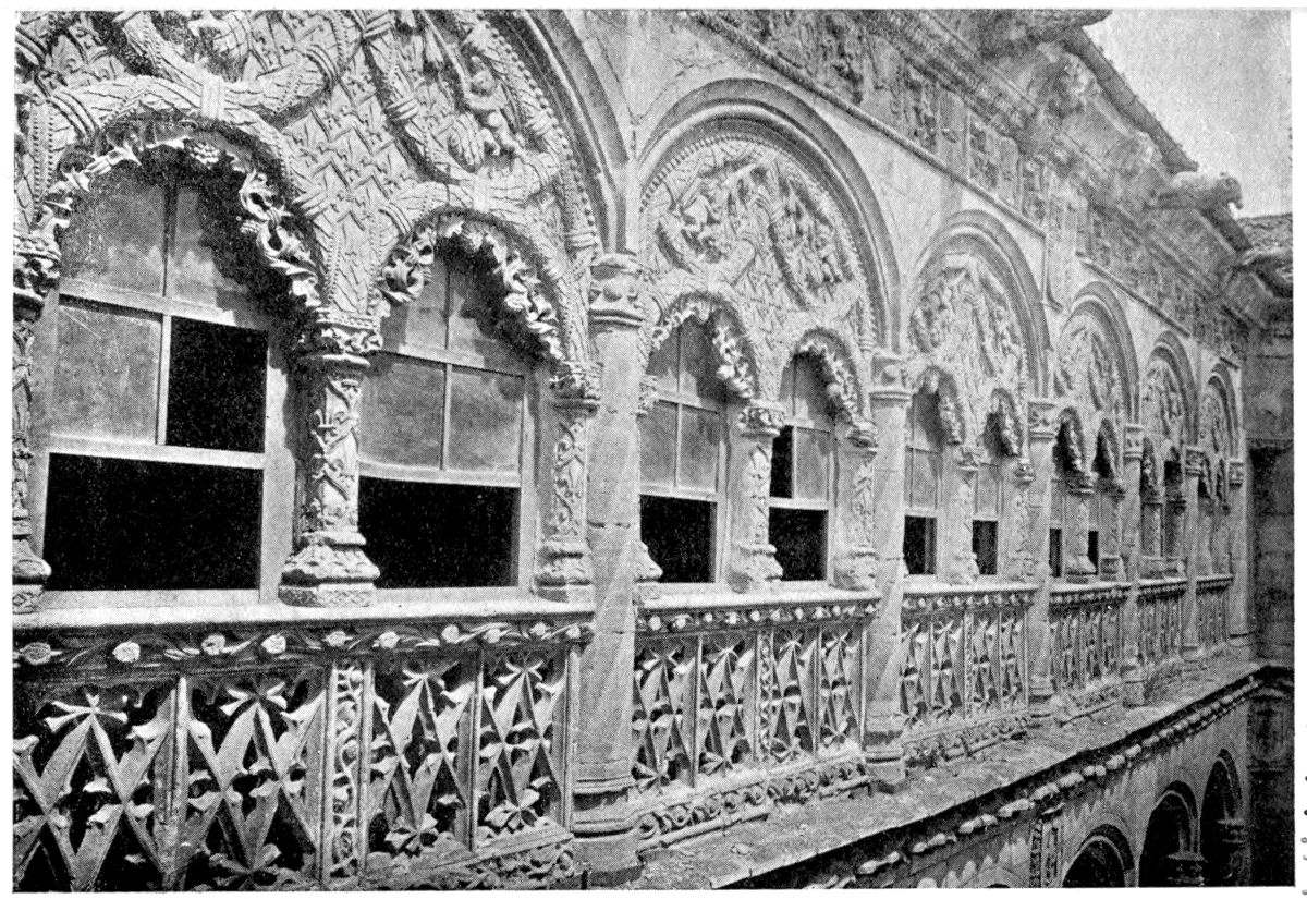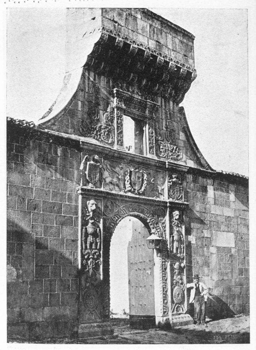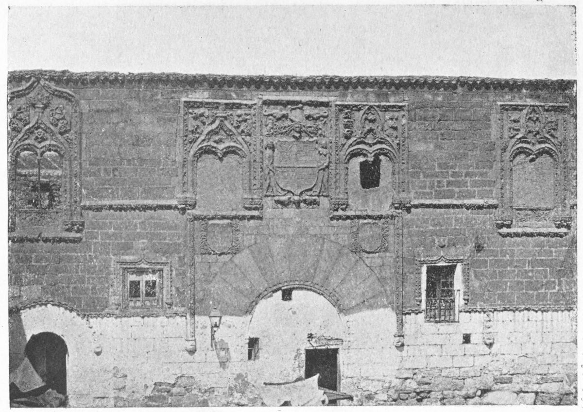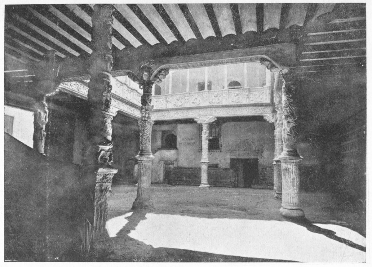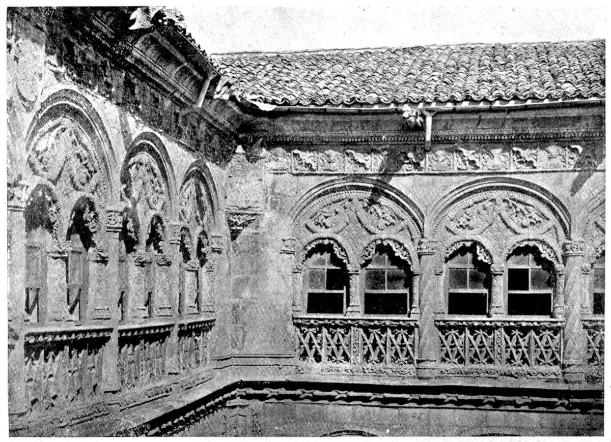 A great many of the fine old mansions (solares) of the aristocracy and merchants of Zaragoza disappeared in the siege, or to permit of modern improvements. Those which remain date mostly from the sixteenth century. The finest, on the whole, is the Casa de la Infanta, so-called as having been the residence of La Vallabriga, a lady banished from Madrid for marrying the{158} Infante Don Luis. The house was built by a rich merchant named Gabriel Zaporta in the middle of the sixteenth century. A square entrance admits to a court, round which runs a gallery, upheld by columns on fluted pedestals, and formed of caryatide figures interlocked. On these rest the capitals, elaborately carved with masks, and on these again is borne the gallery, the arches and parapet of which are enriched with medallions, masks, grotesques, and foliage. The decoration is a fine specimen of the plateresque style. The staircase, in the same style, is worthy of note.