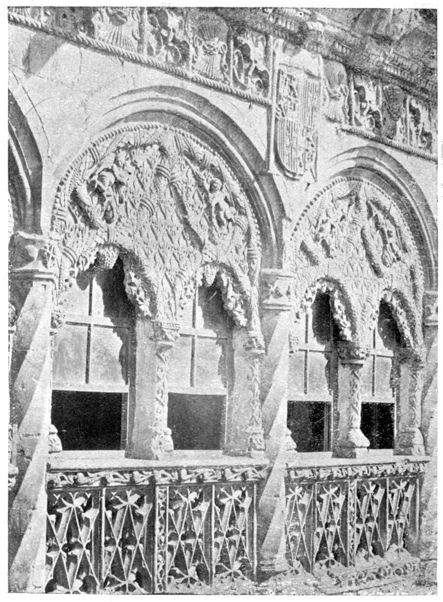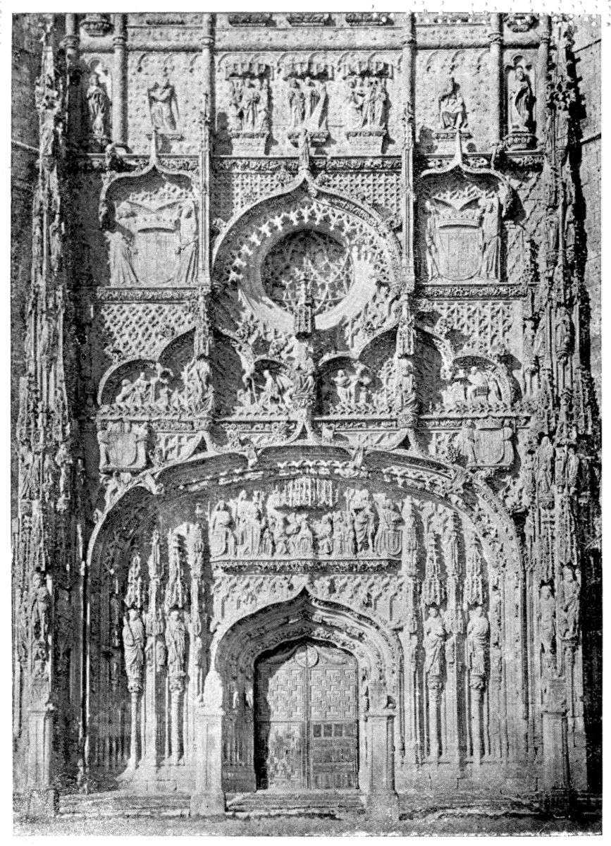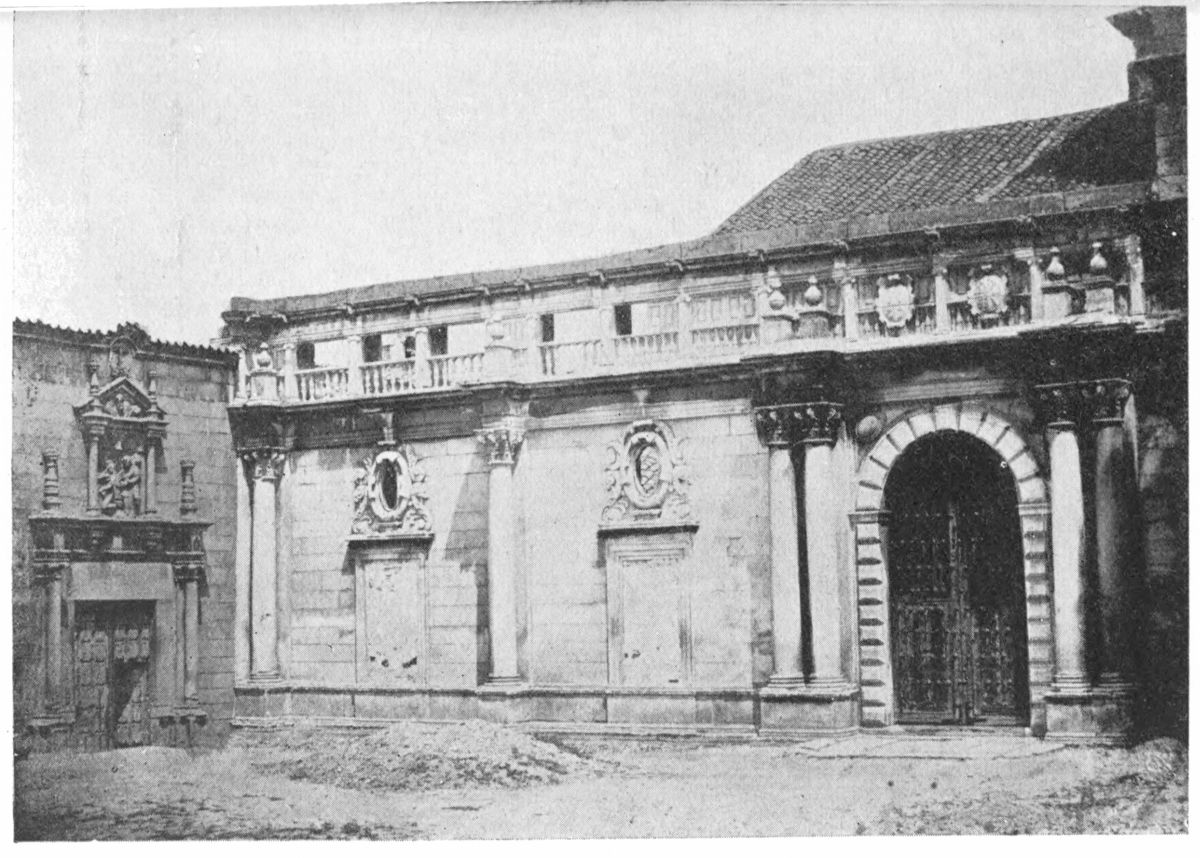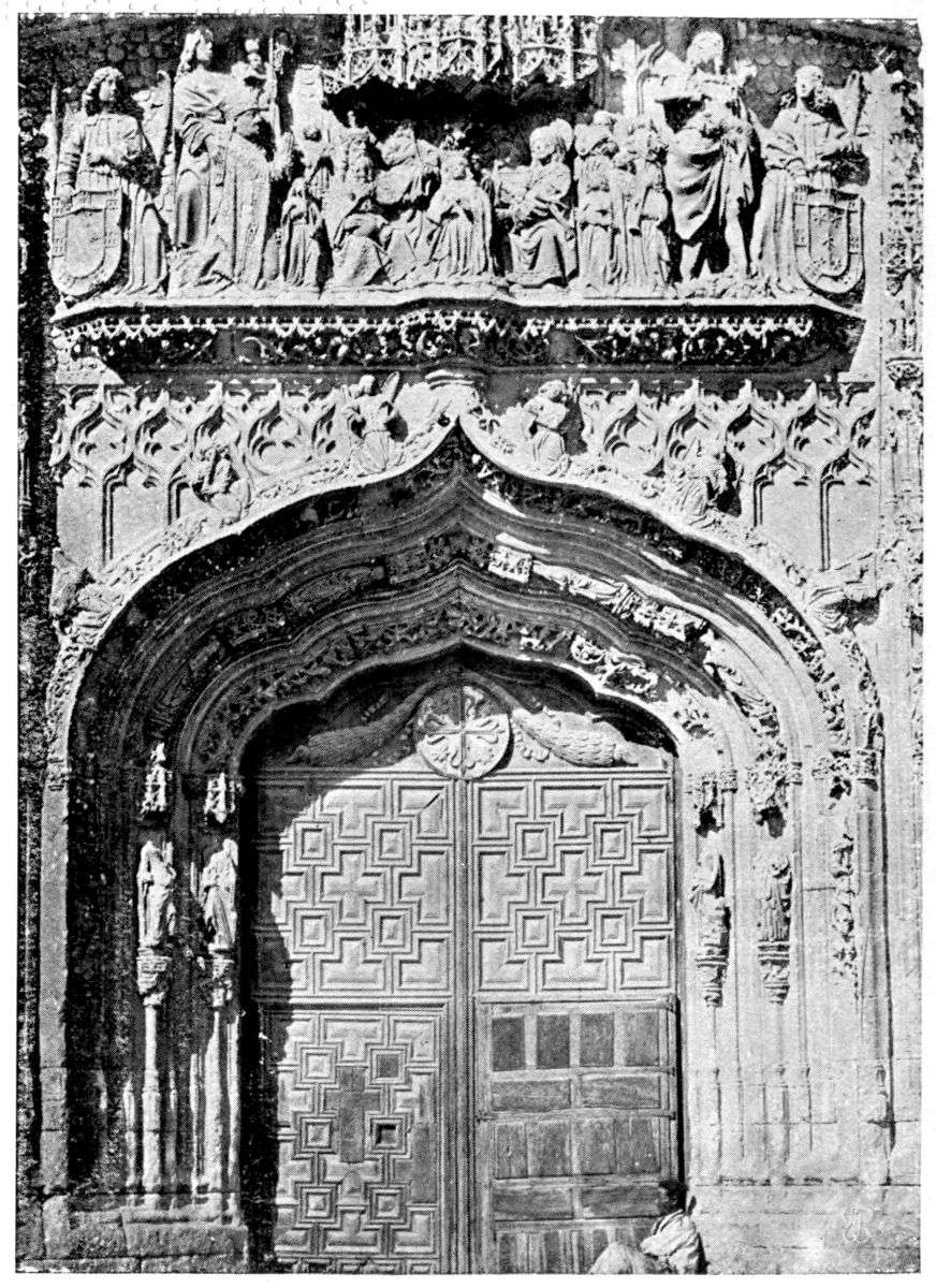 Next to San Pablo is the Colegio San Gregorio, built by Alonso de Burgos, Isabel the Catholic’s Confessor, in remembrance of his student days at the former establishment. The work, elaborate as it is, occupied only eight years—1488 to 1496.{30} The architect, Matias Carpintero, for some unknown reason committed suicide before its completion in 1490. The façade of the main entrance resembles that of the older foundation. The design displays more originality, but the execution is by no means as good. The lintel and jambs of the square doorway are decorated by a relieved pattern of fleur-de-lys, and enclosed within an arched canopy of fanciful outline. On either side of the doorway are statues of wild men—possibly an allusion to the discovery of America—and over the lintel a relief represents the founder kneeling before the patron saint. From the canopy, twisted tapering pillars soar upwards and divide the upper stage into three parts. The middle one is occupied by the relief of a pomegranate tree springing from a basin, and sheltering children and birds among its branches; it supports the coat-of-arms of Ferdinand and Isabel. The lateral divisions contain figures supporting escutcheons, the whole being ‘even more extremely heraldic in its decorations’ than San Pablo. The open-work, cusping at the top, looks as if made of coarse wicker-work, and is happily fast disappearing under the corrosive effects of frost and rain. The interior of San Gregorio wearies the eye with its excess of{31} heraldic decoration. The inner court, notwithstanding, is noble and spacious, with a double gallery of six arches on each side springing from spirally-fluted columns. The fleur-de-lys appear on the arms of the founder; the yoke and sheaf of arrows are the well-known devices of the Catholic kings. The chapel was stripped by the French of all of value that it contained, including the sepulchral effigy of Alonso de Burgos. The college is now one of the municipal buildings.