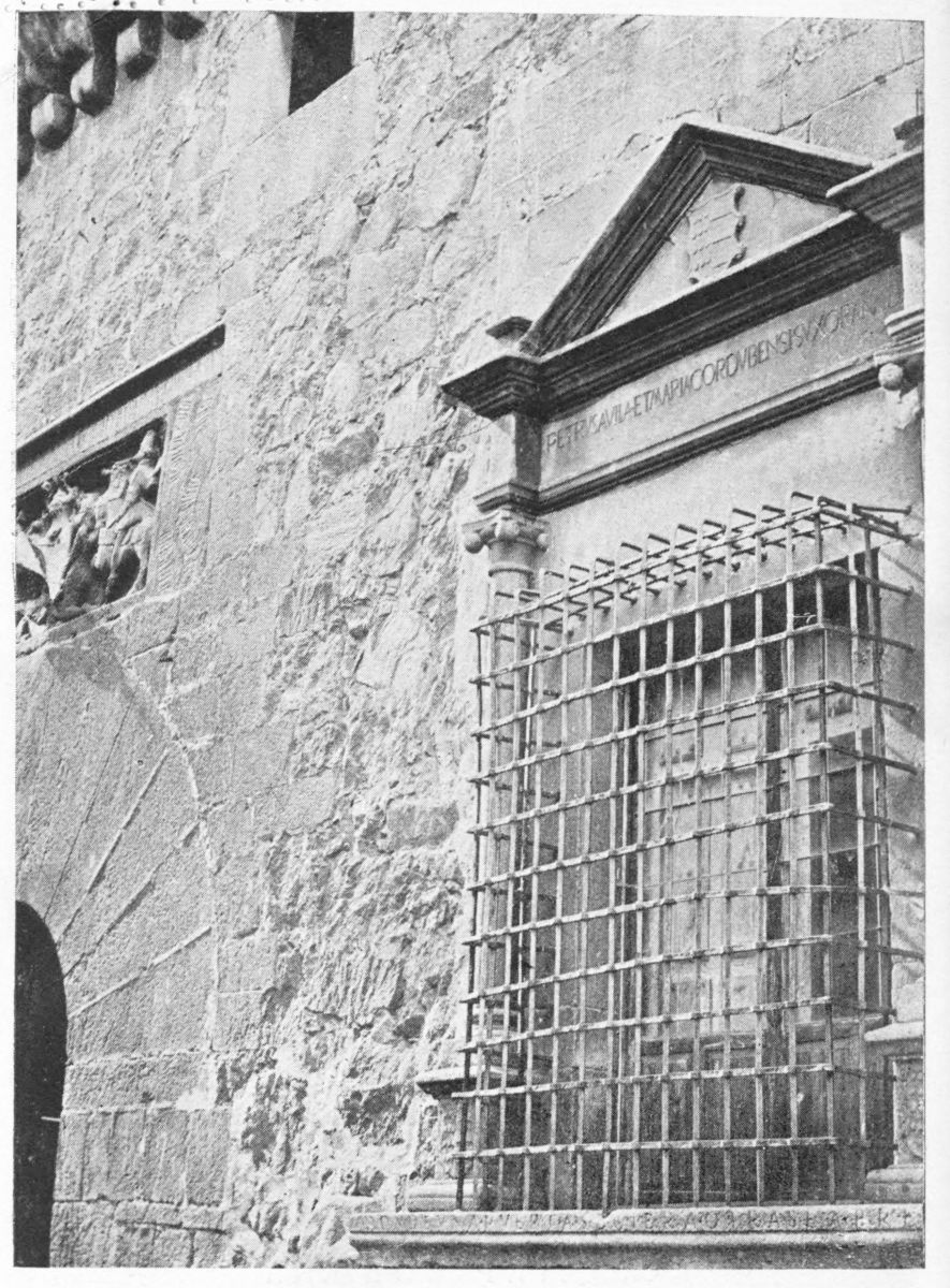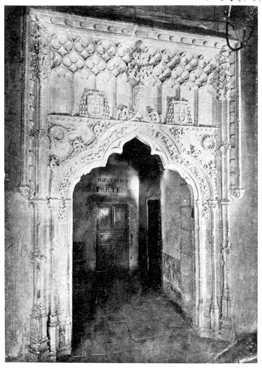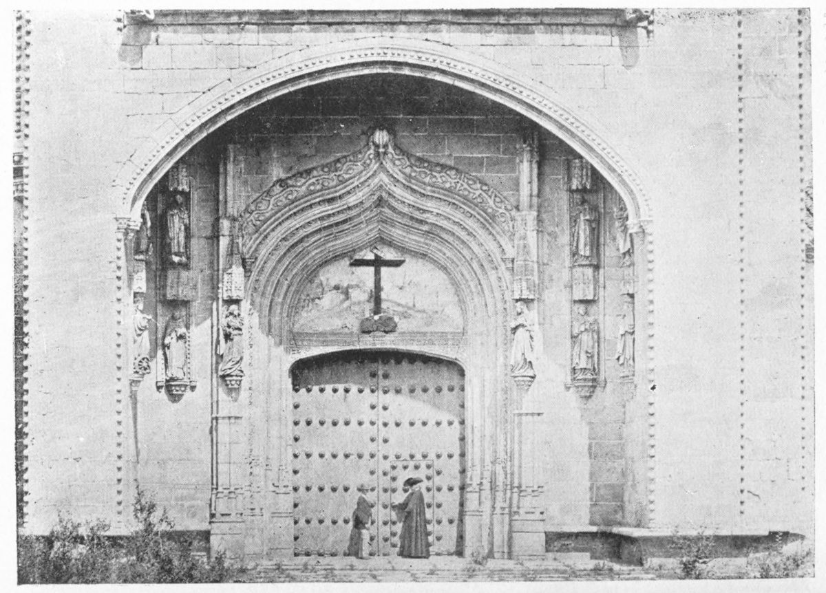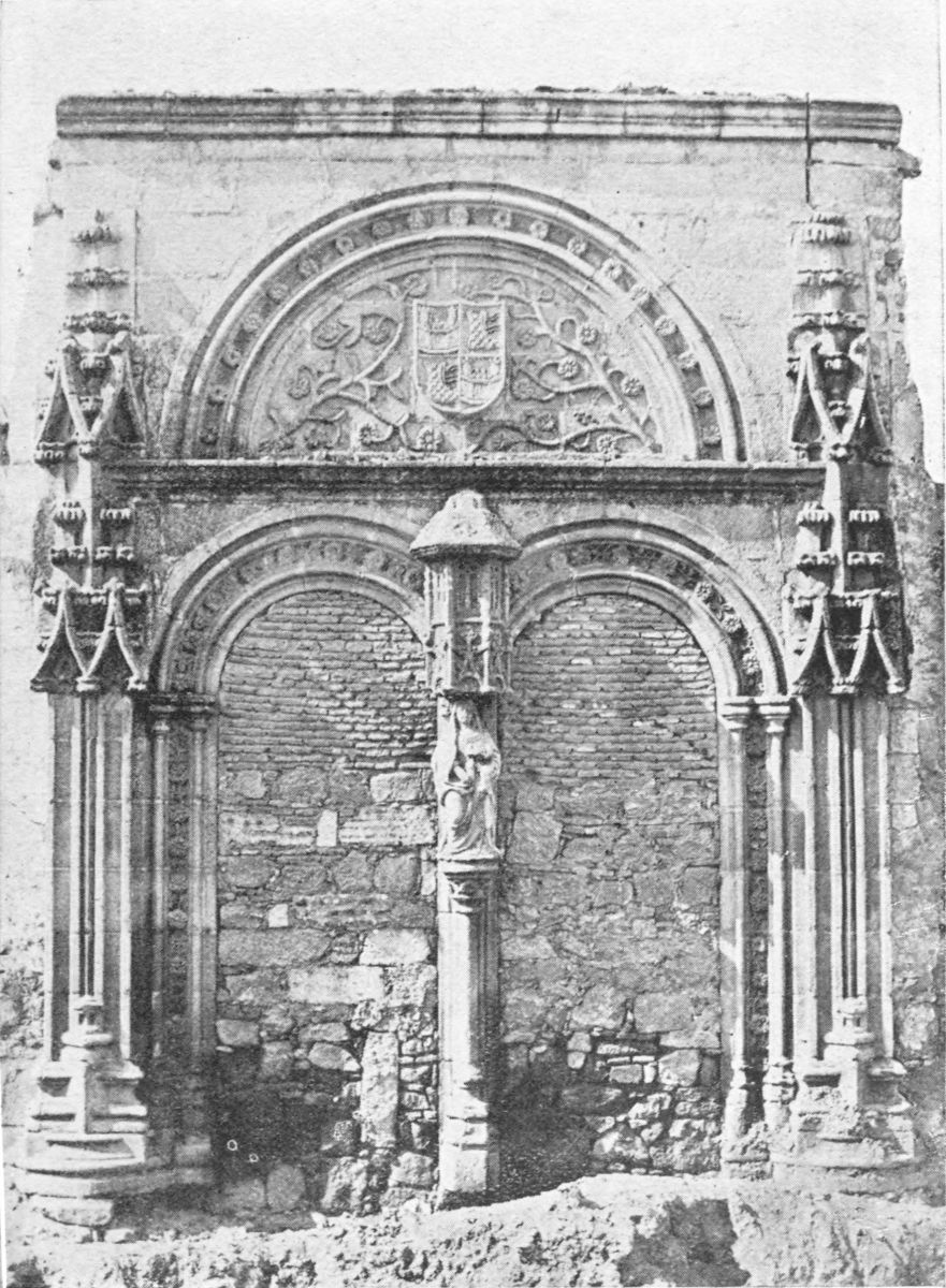 Next to San Pablo is the Colegio San Gregorio, built by Alonso de Burgos, Isabel the Catholic’s Confessor, in remembrance of his student days at the former establishment. The work, elaborate as it is, occupied only eight years—1488 to 1496.{30} The architect, Matias Carpintero, for some unknown reason committed suicide before its completion in 1490. The façade of the main entrance resembles that of the older foundation. The design displays more originality, but the execution is by no means as good. The lintel and jambs of the square doorway are decorated by a relieved pattern of fleur-de-lys, and enclosed within an arched canopy of fanciful outline. On either side of the doorway are statues of wild men—possibly an allusion to the discovery of America—and over the lintel a relief represents the founder kneeling before the patron saint. From the canopy, twisted tapering pillars soar upwards and divide the upper stage into three parts. The middle one is occupied by the relief of a pomegranate tree springing from a basin, and sheltering children and birds among its branches; it supports the coat-of-arms of Ferdinand and Isabel. The lateral divisions contain figures supporting escutcheons, the whole being ‘even more extremely heraldic in its decorations’ than San Pablo. The open-work, cusping at the top, looks as if made of coarse wicker-work, and is happily fast disappearing under the corrosive effects of frost and rain. The interior of San Gregorio wearies the eye with its excess of{31} heraldic decoration. The inner court, notwithstanding, is noble and spacious, with a double gallery of six arches on each side springing from spirally-fluted columns. The fleur-de-lys appear on the arms of the founder; the yoke and sheaf of arrows are the well-known devices of the Catholic kings. The chapel was stripped by the French of all of value that it contained, including the sepulchral effigy of Alonso de Burgos. The college is now one of the municipal buildings.