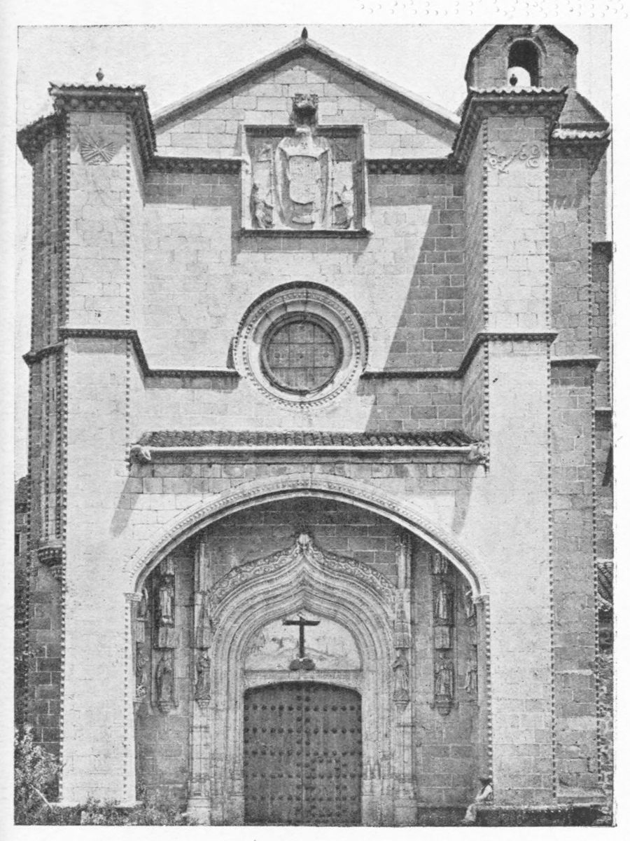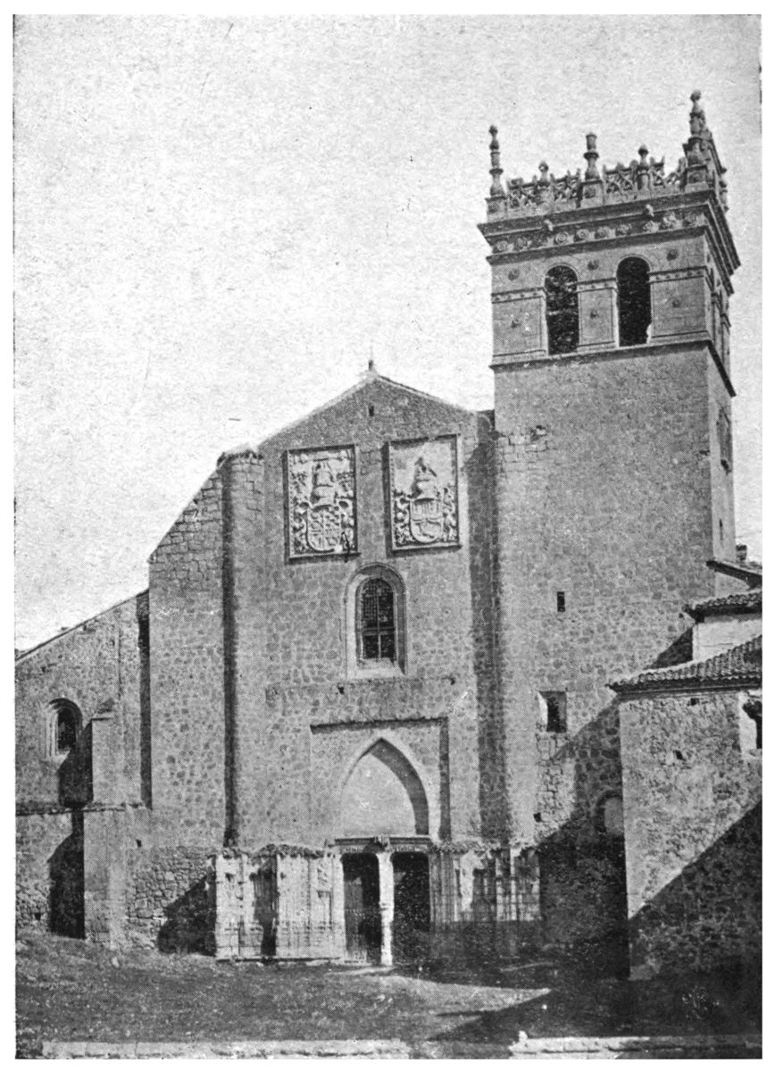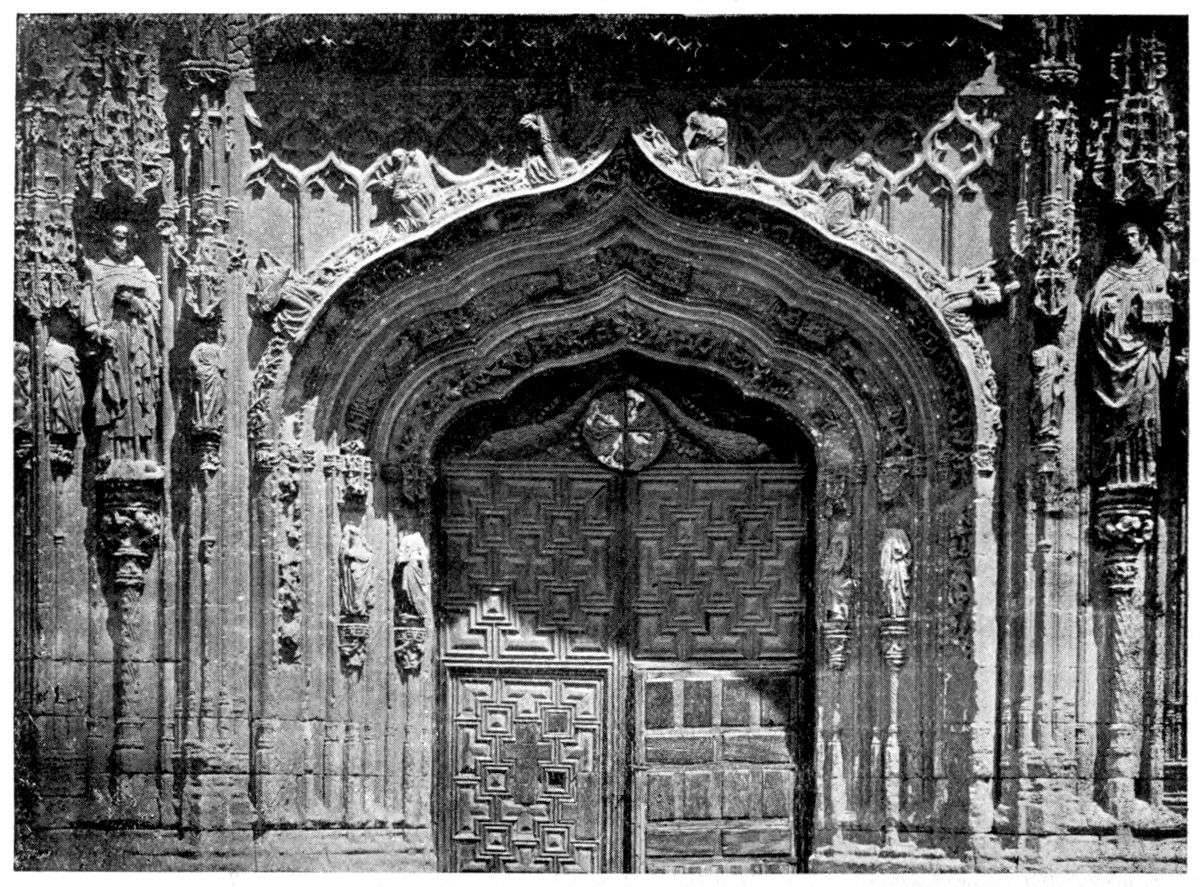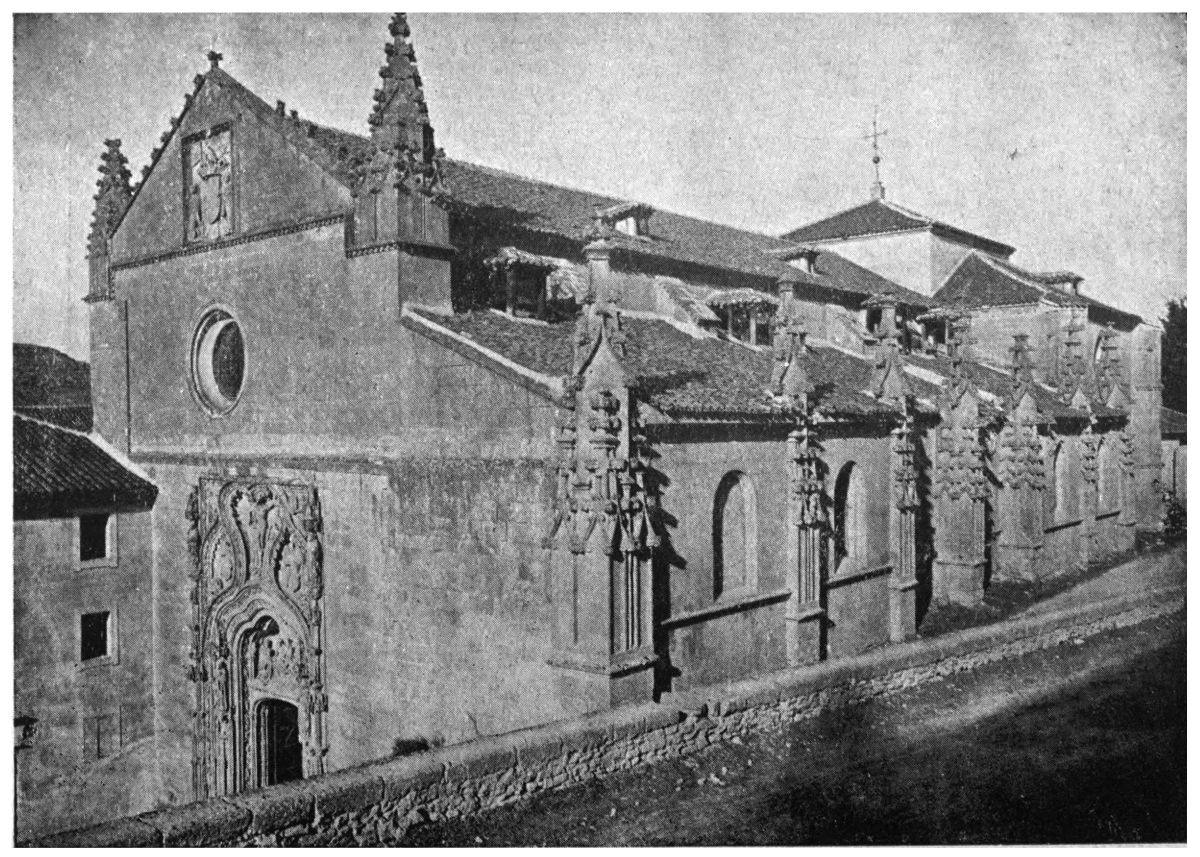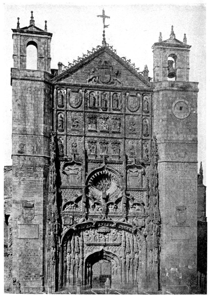 The Dominican monastery of San Pablo was founded in 1276 by Queen Violante, the rebellious consort of Alfonso XI. Maria de Molina showered favours on the community, whose friendly rivals, the Franciscans, were established in the Plaza Mayor. Later on, as we have said, Juan II. made the building his home, and died here in 1454—near to, if not in, the odour of sanctity. Here, too, the Cortes often used to sit. The present building may be considered the creation of Cardinal Juan de Torquemada (not the notorious Inquisitor), whose death took place in 1468. The façade was constructed in the latter part of the fifteenth century, and restored in the seventeenth and nineteenth centuries; it is a debased late-Gothic style, the main object of the architects being evidently to multiply evidences of their skill. In this they succeeded, for no one can question the merit of the execution. The riotous exuberance of the decoration renders a description difficult. The doorway is placed within an arch of a curious waved line. On either side are shown saints of the order, standing on pedestals,{28} with pinnacle-like canopies above them. Above the arch is an indifferent relief of the Coronation of the Blessed Virgin, attended by Cardinal Torquemada with his patron saints, the Baptist and the Evangelist. All this part of the decoration is enclosed within an ugly flattened arch. Above is the figure of Christ Enthroned, and on each side of Him a trefoil arch containing the figures of the Four Evangelists. These arches frame windows with exquisite traceries, such as fill the circular window above the Christ. The upper part of the façade is in three stages, each filled with figures of saints and heraldic devices. ‘Every vacant space,’ says Street, ‘seems to have a couple of angels holding coats-of-arms, so that it is impossible not to feel that the sculptor and the founder must have had some idea of heaven as peopled by none with less than a proper number of quarterings on their shields, or without claim to the possession of Sangre Azul.’ The arms displayed on the lower part of the façade are not, however, those of Torquemada, but of the Duke of Lerma, the favourite of Philip III., by whom the church was restored. Here he celebrated his first Mass in the year 1618, having sought refuge in the church from the cares of state, or the disappointments of a courtier’s life;{29} and here, too, he was ultimately buried. The church was plundered and dismantled by the French during the Peninsular War, and the interior is now inaccessible to visitors.
