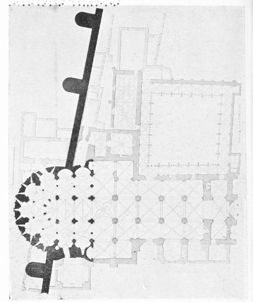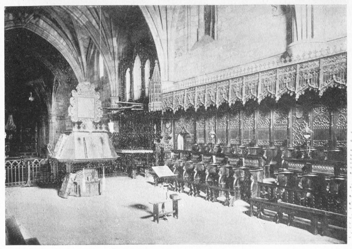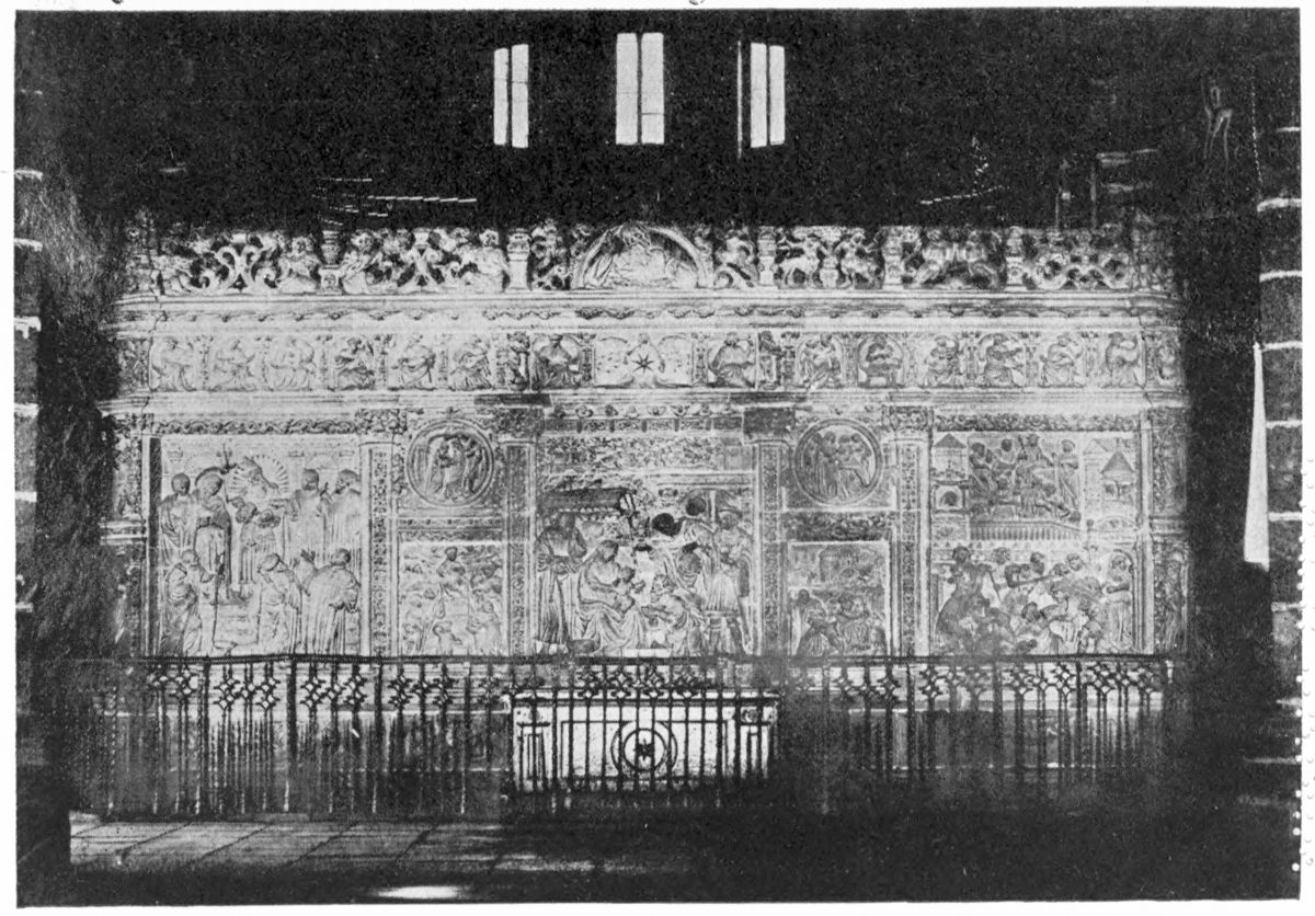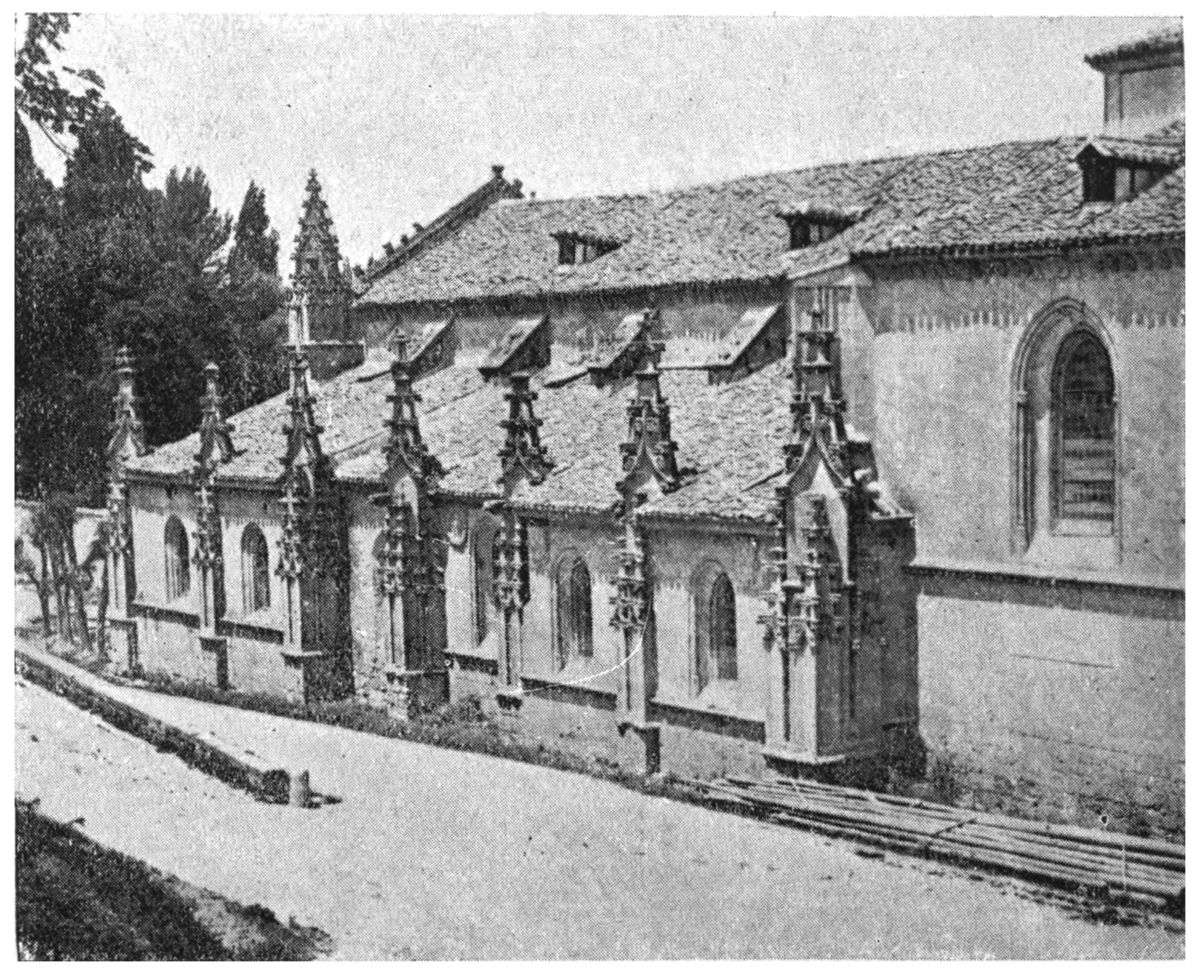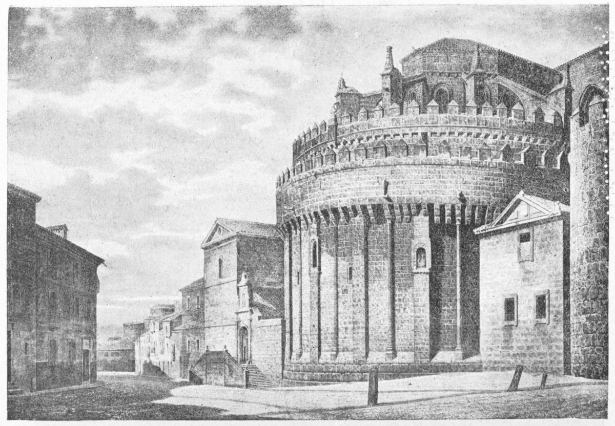 Over the chancel is the lantern, octagonal in plan, which replaced an earlier one in the first quarter of the sixteenth century. The work was undertaken by Enrique de Egas, only at the{150} express command of the king. The lower part is adorned with statues in niches, and with the canting arms (the half-moon) of the family of Archbishop de Luna.