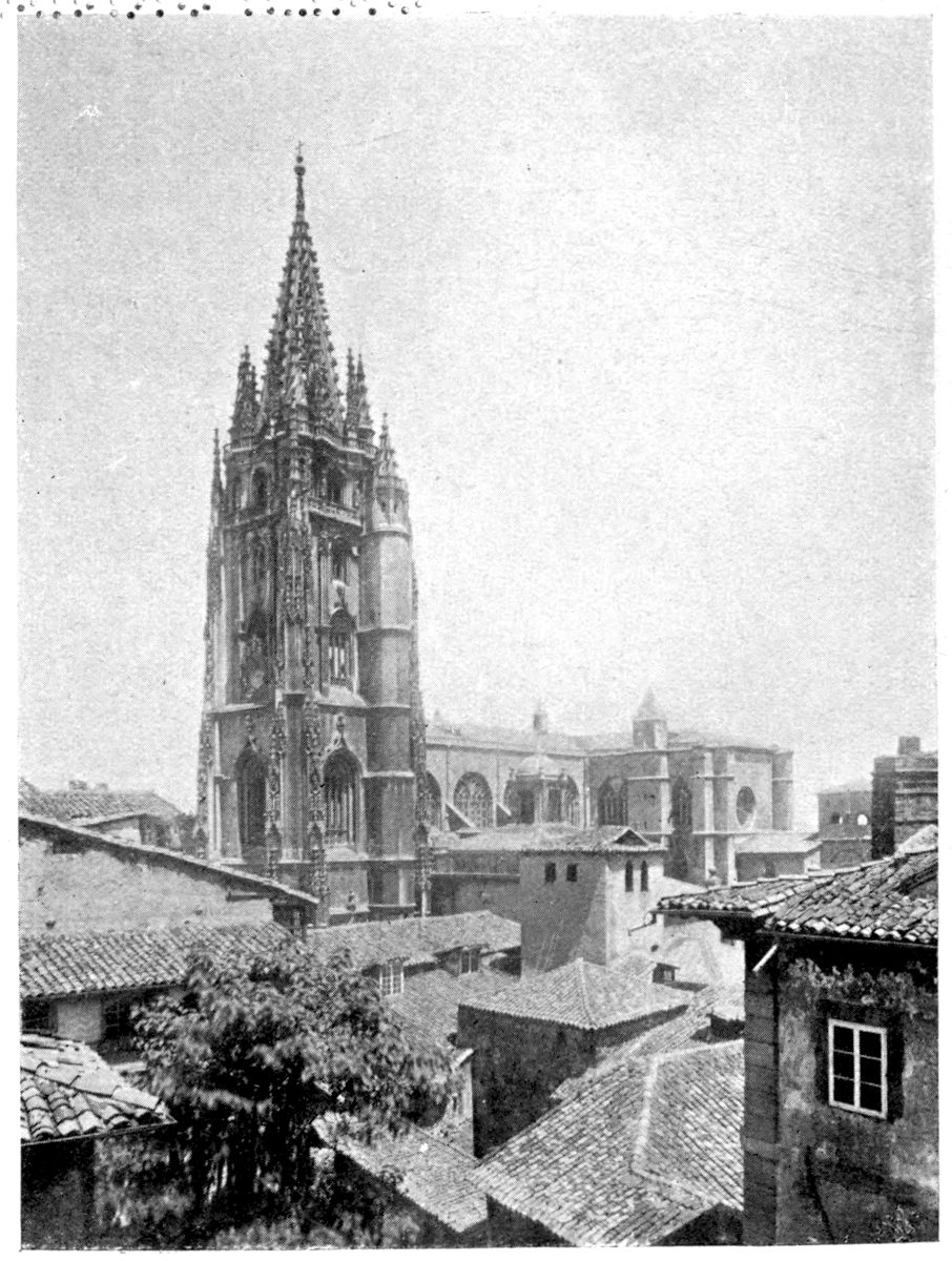 The cathedral built by Tioda by order of Alfonso the Chaste was pulled down in the twelfth century. The foundation of the existing edifice may be attributed to Bishop Gutierre de Toledo, who flourished about 1390. The work was continued zealously by his successors, but was not altogether completed till the sixteenth century was half gone. The west front is flanked by towers, only one of which, as so often happens in Spain, has been raised above the general roof-level. The southern tower is of singular dignity and beauty. It rises to the height of 224 feet,{48} and is divided into five stages, of which three are above the level of the aisles. The massive piers on which the structure rests are continued upwards in the form of buttresses along the corners, and are fluted, moulded, and enriched with canopies, crockets, and ornaments of the most elaborate and at the same time tasteful character. The windows are of three lights, with good traceries, above the archivolts appearing a kind of trefoil ornament. The third stage is girt by a beautiful parapet. The fourth stage is rather Renaissance than Gothic in treatment. It is flanked by tapering finials, and constitutes the belfry. Here is hung the bell named after King Vamba, which dates from 1219. On the topmost stage rises the graceful steeple, thickly encrusted with crockets, and flanked by pinnacles which seem to be a reproduction of it in miniature. No more beautiful church steeple than this is to be seen in Spain, or indeed in Europe. Repeated restorations, notably in 1521 and 1728, have fortunately left its fairy-like symmetry unimpaired.