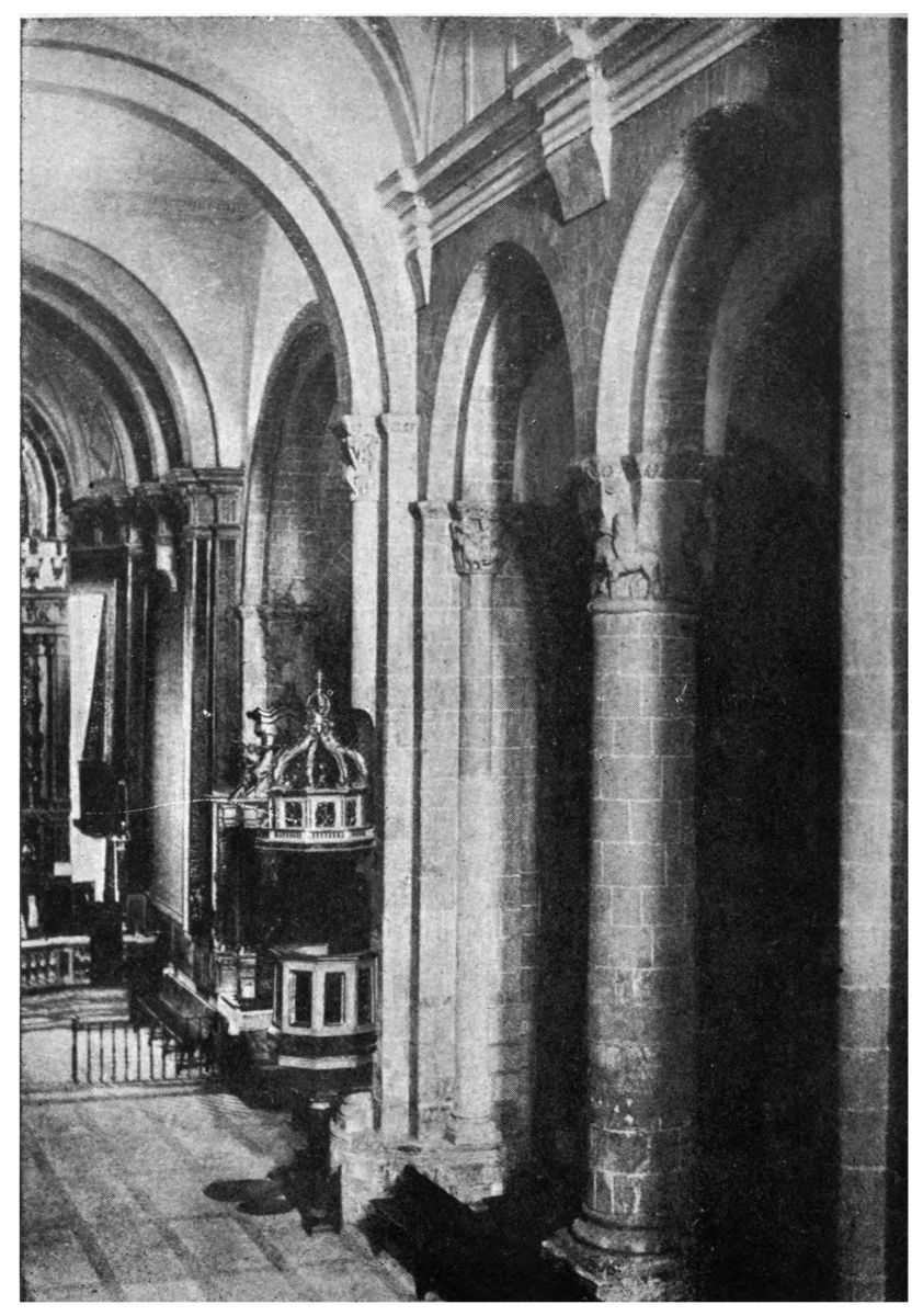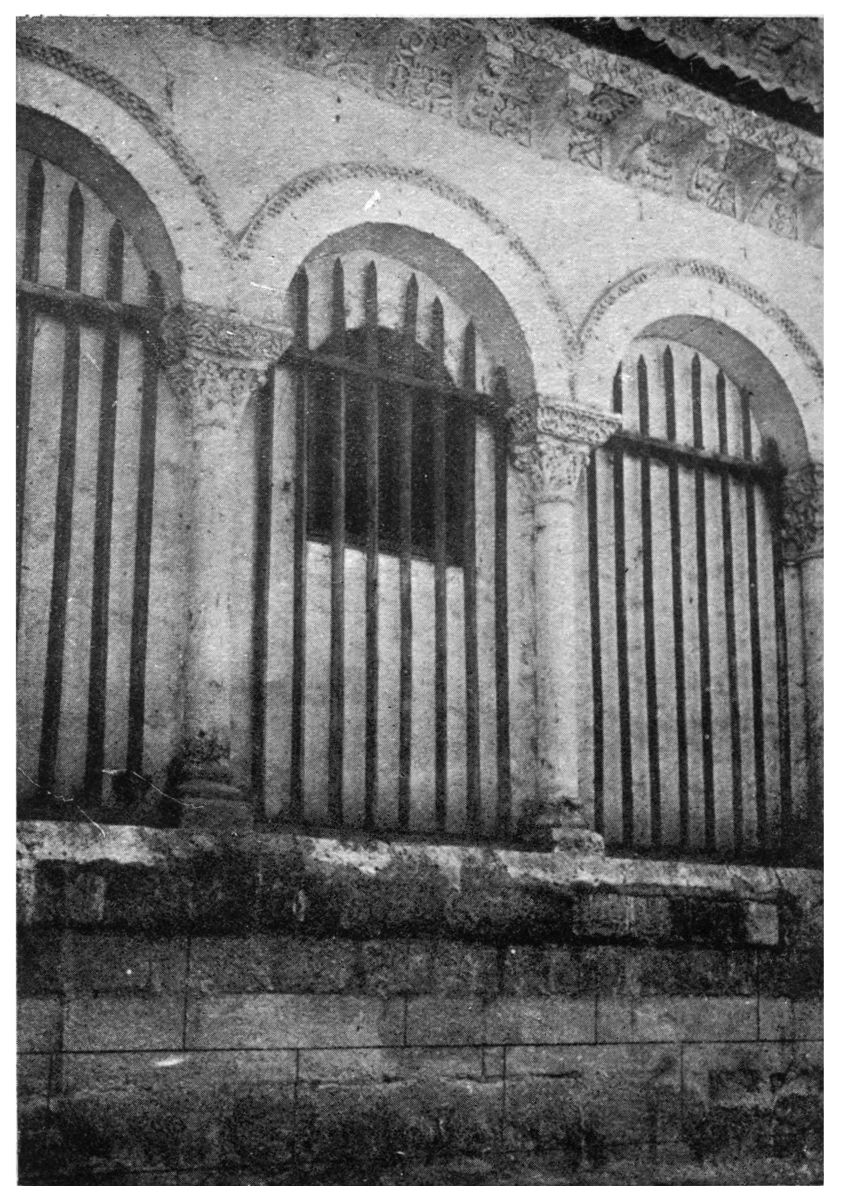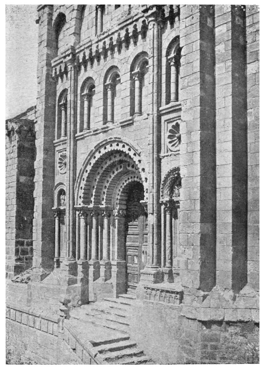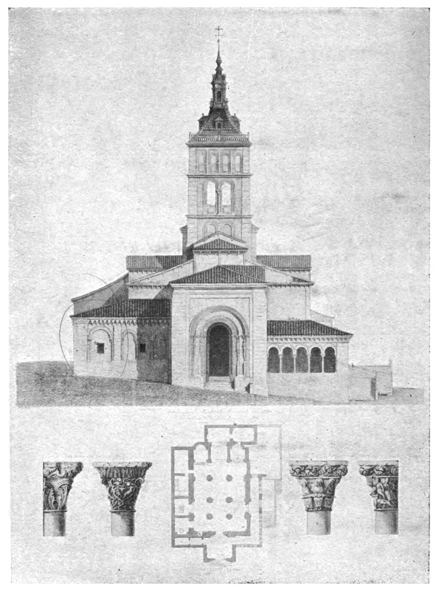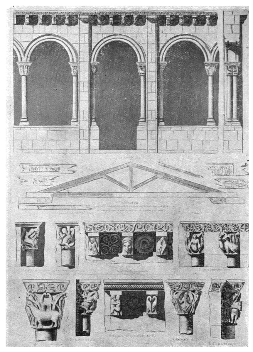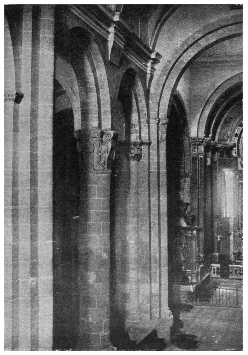 This sanctuary is now approached from the south side of the cathedral by a flight of twenty-two steps, built in the sixteenth century. We reach first the chapel, or ante-cámara, restored if not entirely constructed in the reign of Alfonso VI. (1072-1109), and representing the highest pitch of development reached at that time by Romanesque art in Spain. The roof is groined, and supported on each side by six columns built into the wall. Each column consists of two pilasters, rising from high pedestal bases, and supporting the statues of two Apostles. These figures are expressive, though rude, and the draperies are graceful and natural. At their feet are fantastic animals. The capitals of the columns are richly and beautifully carved with foliage, and with compositions representing scenes from the life of the Saviour and combats between men and lions. The capitals of the small pillars at the corners of the pedestals are also curious and delicately carved. Over the door are three heads in relief, of Christ, the Virgin, and St. John, early Romanesque work once painted and then disfigured by whitewash. The pavement of hard argamasa, or tessellated work, resembles, as Ford{45} remarks, Norman-Byzantine works in Sicily. Beneath is a crypt, or lower chapel, dedicated to St. Leocadia.