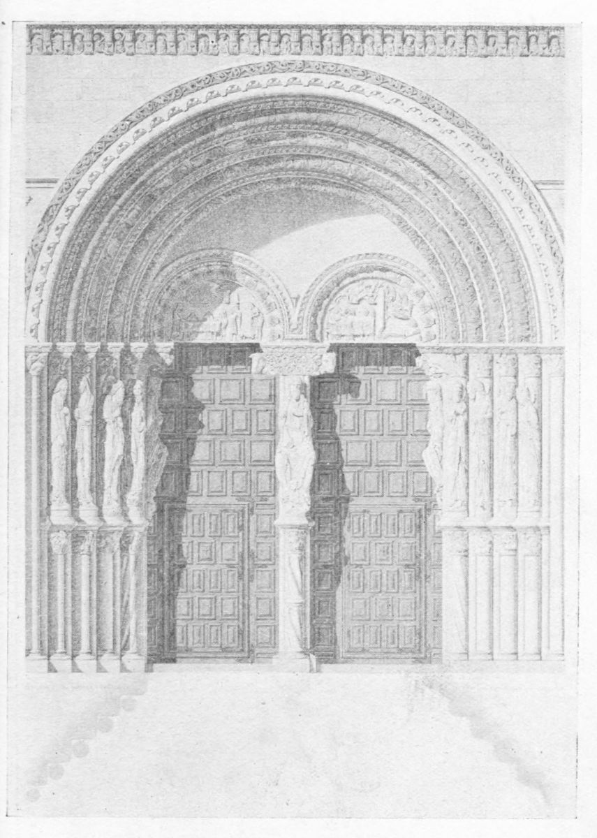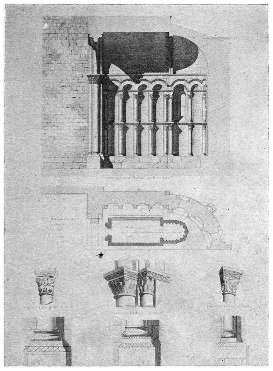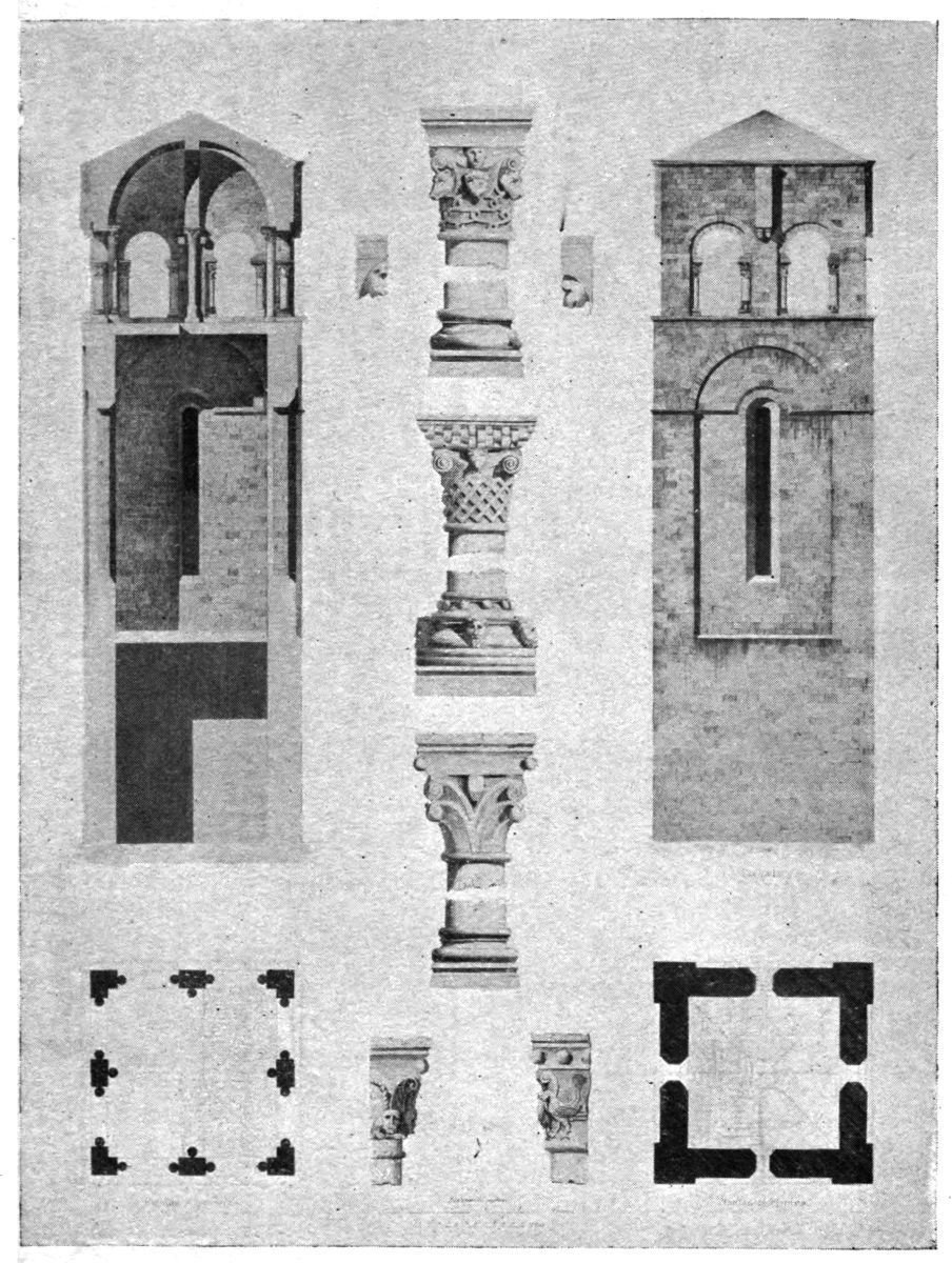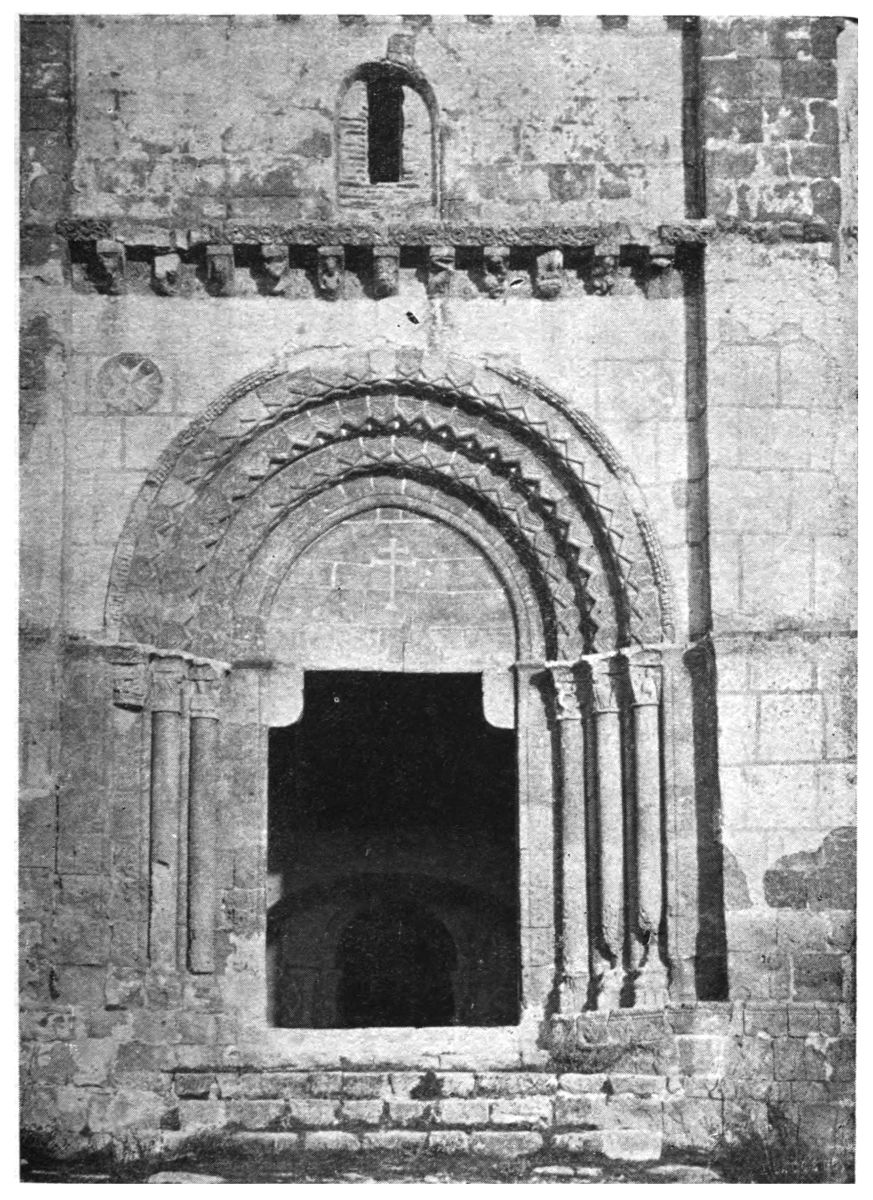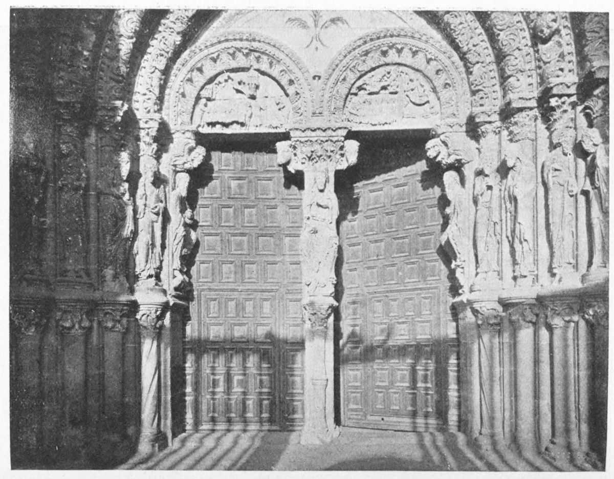 This sanctuary is now approached from the south side of the cathedral by a flight of twenty-two steps, built in the sixteenth century. We reach first the chapel, or ante-cámara, restored if not entirely constructed in the reign of Alfonso VI. (1072-1109), and representing the highest pitch of development reached at that time by Romanesque art in Spain. The roof is groined, and supported on each side by six columns built into the wall. Each column consists of two pilasters, rising from high pedestal bases, and supporting the statues of two Apostles. These figures are expressive, though rude, and the draperies are graceful and natural. At their feet are fantastic animals. The capitals of the columns are richly and beautifully carved with foliage, and with compositions representing scenes from the life of the Saviour and combats between men and lions. The capitals of the small pillars at the corners of the pedestals are also curious and delicately carved. Over the door are three heads in relief, of Christ, the Virgin, and St. John, early Romanesque work once painted and then disfigured by whitewash. The pavement of hard argamasa, or tessellated work, resembles, as Ford{45} remarks, Norman-Byzantine works in Sicily. Beneath is a crypt, or lower chapel, dedicated to St. Leocadia.