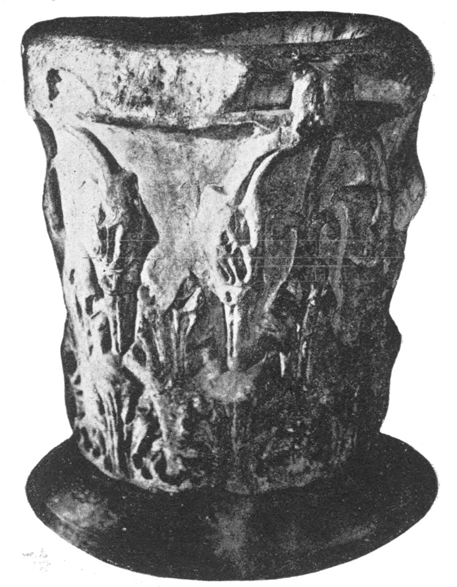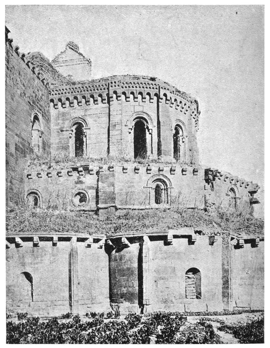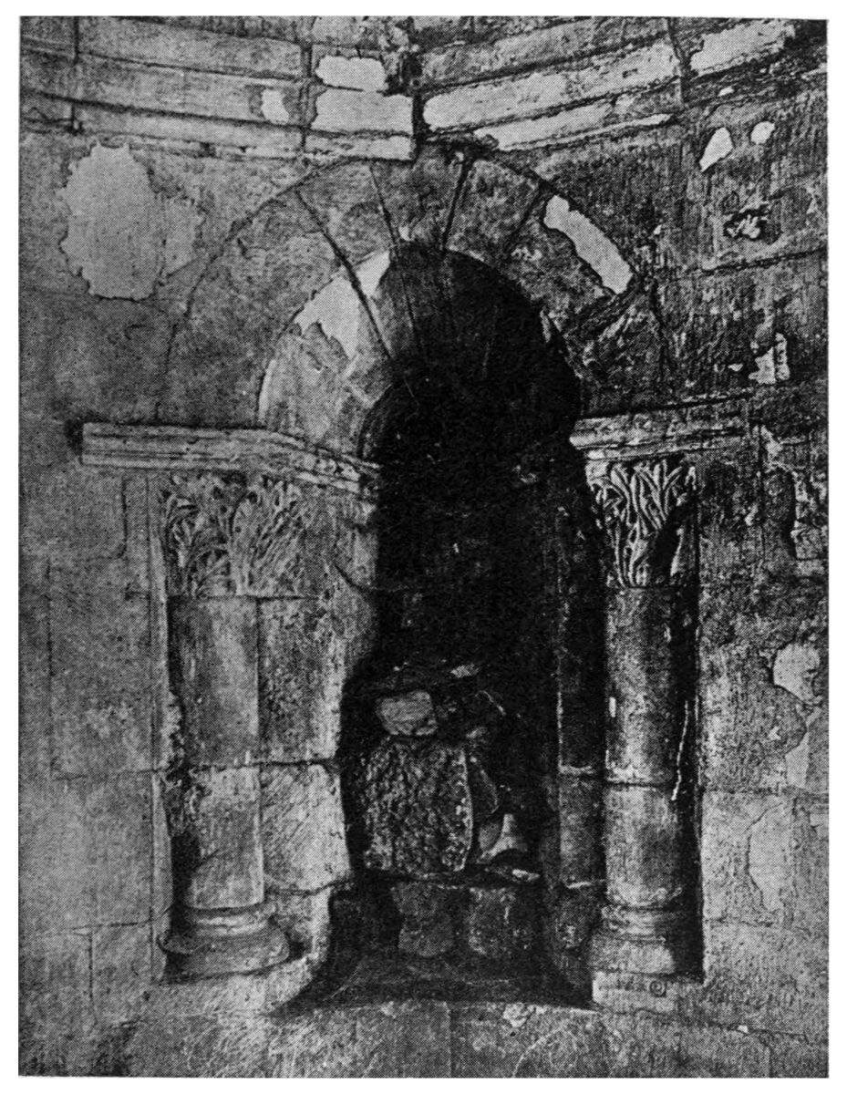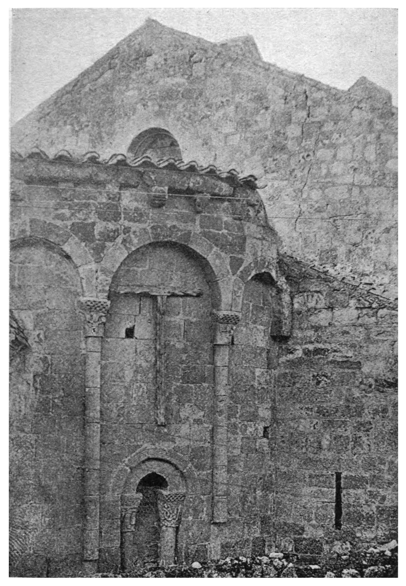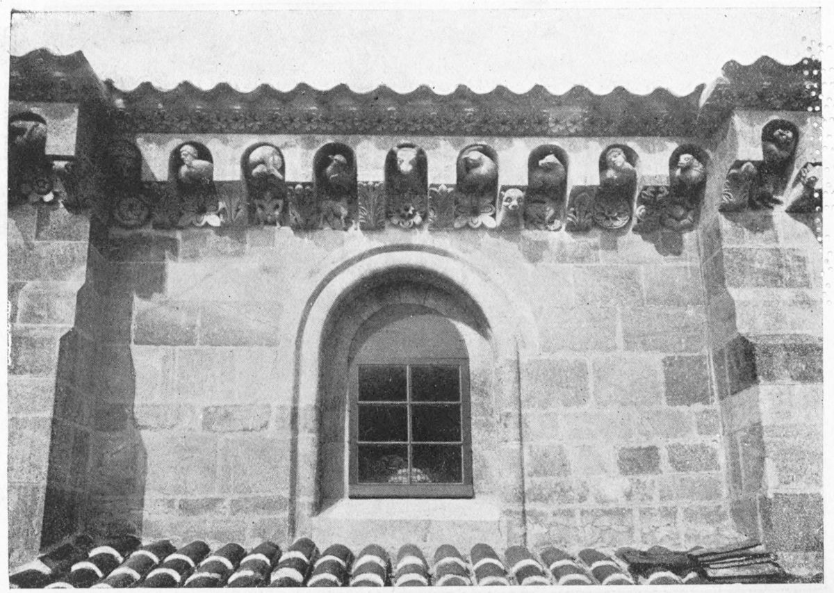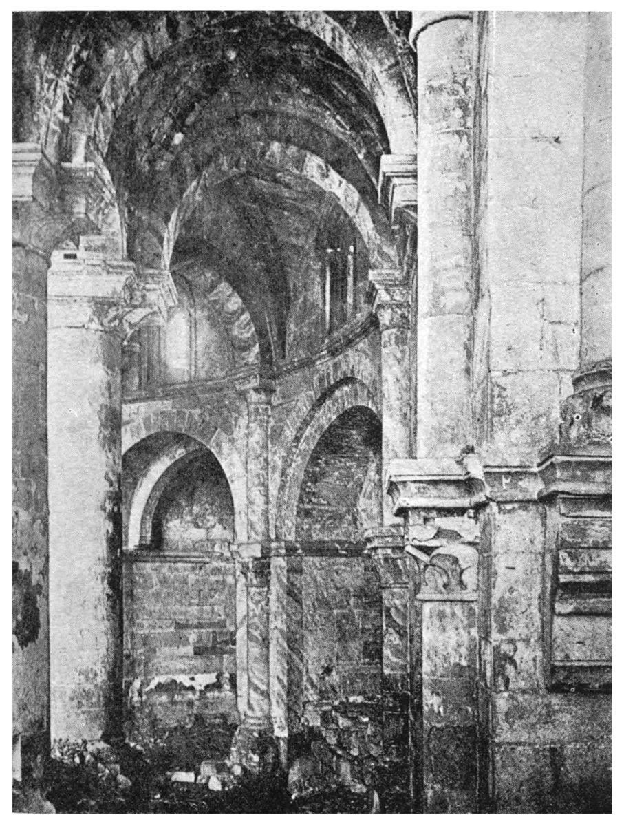 This sanctuary is now approached from the south side of the cathedral by a flight of twenty-two steps, built in the sixteenth century. We reach first the chapel, or ante-cámara, restored if not entirely constructed in the reign of Alfonso VI. (1072-1109), and representing the highest pitch of development reached at that time by Romanesque art in Spain. The roof is groined, and supported on each side by six columns built into the wall. Each column consists of two pilasters, rising from high pedestal bases, and supporting the statues of two Apostles. These figures are expressive, though rude, and the draperies are graceful and natural. At their feet are fantastic animals. The capitals of the columns are richly and beautifully carved with foliage, and with compositions representing scenes from the life of the Saviour and combats between men and lions. The capitals of the small pillars at the corners of the pedestals are also curious and delicately carved. Over the door are three heads in relief, of Christ, the Virgin, and St. John, early Romanesque work once painted and then disfigured by whitewash. The pavement of hard argamasa, or tessellated work, resembles, as Ford{45} remarks, Norman-Byzantine works in Sicily. Beneath is a crypt, or lower chapel, dedicated to St. Leocadia.