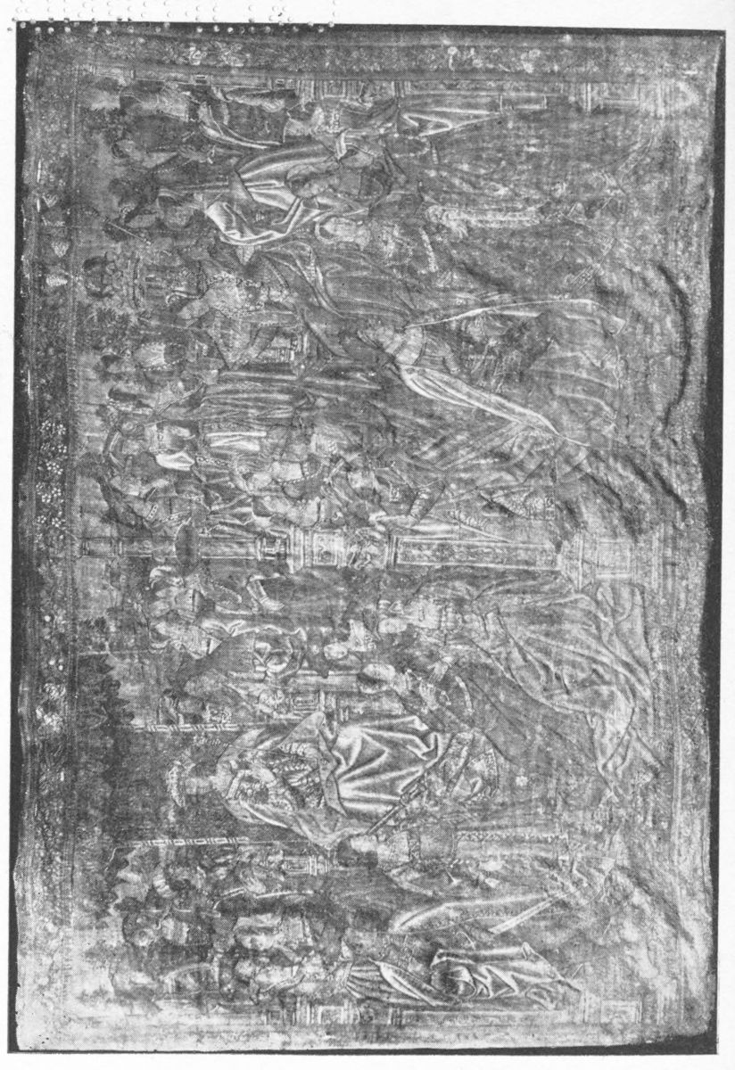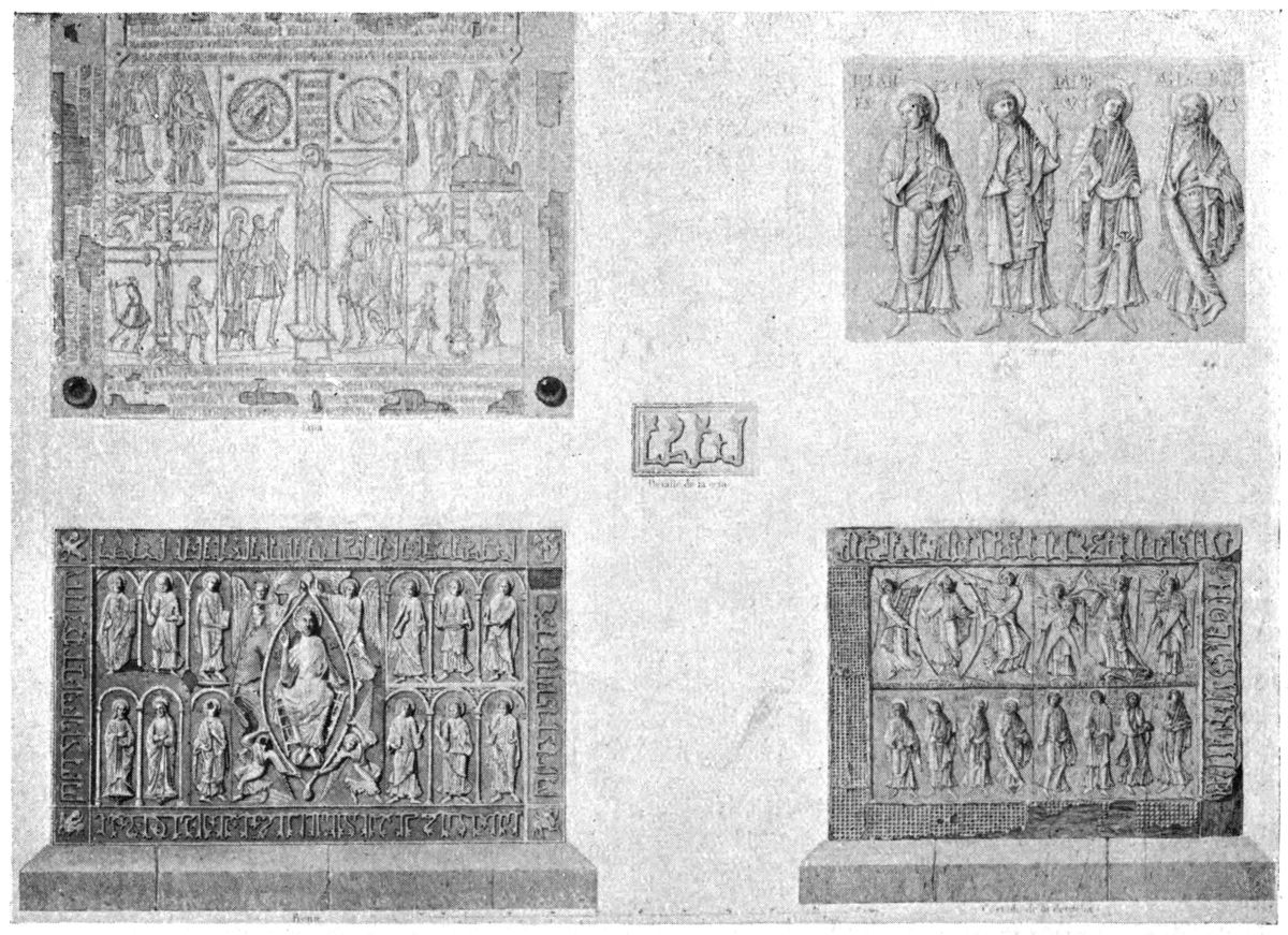 Enclosed within a railing is the Arca, a chest of oak, 7½ feet long by 3¾ broad, and thinly plated with silver. A Latin inscription of four lines on the lid goes to prove that this was the work, not of Alfonso the Chaste, but of Alfonso VI., a conclusion warranted also by the Arabic inscription in Kufic characters, in praise of the Most High, running round the chest—a form of decoration not introduced into Christian work till after the fall of Toledo. On one face of the ark are reliefs of the Twelve Apostles within niches, with the Four Evangelists at the angles, and the figure of Christ, supported by angels, in the middle. On one side are reliefs of the Nativity, Adoration of the Shepherds, and the Flight into Egypt; on the other the Revolt of Satan, the Ascension, and the Apostles. The subject of the reliefs on the cover is the Crucifixion.{46}