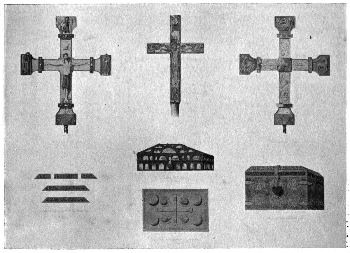 Other precious relics are exhibited in the chamber, among them the winding-sheet of the Saviour, in a superb box of gold and blue enamel. The Cruz de la Victoria was carved of plain oak and carried as a standard by Pelayo at Covadonga; it is now encrusted with gold and{47} brilliant enamels—work executed, as the inscription records, at Gauzon, near Oviedo, in the year 908. Another cross, styled the Cruz de los Angeles, dates from the times of Alfonso the Chaste, for whom it was made, it is said, by two angels disguised as goldsmiths. This precious relic is in the shape of a Maltese cross, is set with gems en cabochon, and encrusted with gilt filigree-work. In the centre is set a precious ruby. On the arms is inscribed the date of the making (808 A.D.) and an anathema on whomsoever should steal it. It is certainly remarkable that this inscription should contain nothing about the supernatural workmanship of the cross!