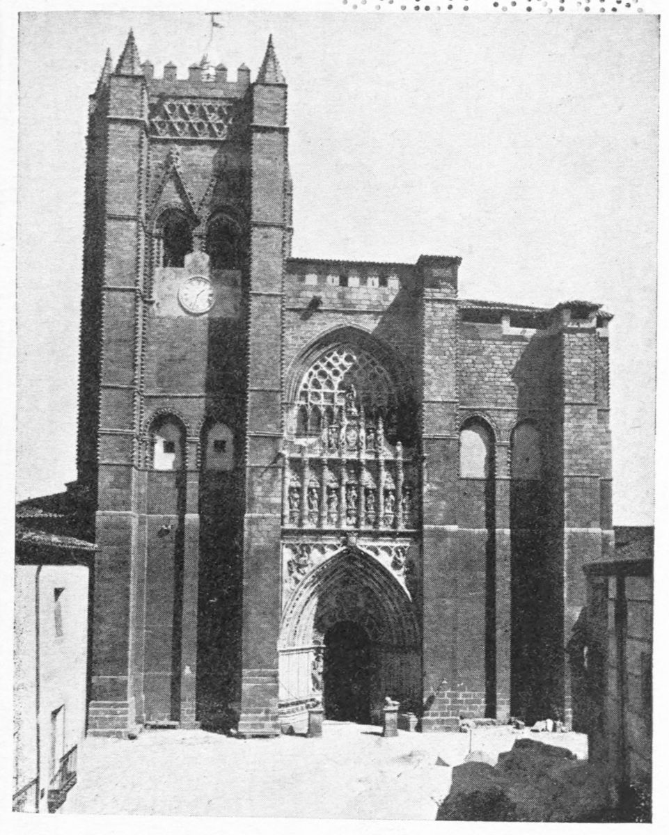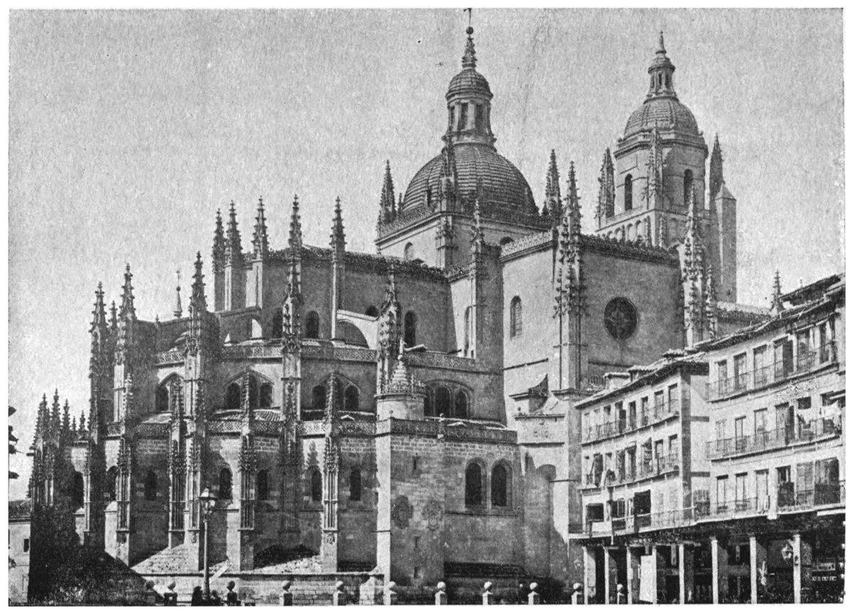 The Iglesia Mayor is said to have been built at the same time as the church of Santa Maria la Antigua, on the other side of the square, and both by Count Ansúrez. Comparing conflicting testimony, and the opinions of various architects, the conclusion would appear to be that the church was founded before the Count’s time (for it is mentioned in documents as far back as 1088, and was in his day called the Ancient), and that the existing fabric dates mainly from the reign of Alfonso IX. (1230-44)—not from the{25} time of the alleged restorer, Alfonso XI. Santa Maria is, beyond doubt, the most interesting church in the city. Its lofty steeple, with tiled roof and semicircular windows in all its four stages, is one of the few prominent landmarks of the wayfarer to Valladolid. The side apses are Romanesque, but the nave terminates in an apse, Gothic in style, and pierced with lancet windows. The buttresses taper off into graceful finials, with crockets and gargoyles. The main apse and transept are both pierced near the roof with an elegant openwork balustrade. The steeple is thoroughly Lombard in character.