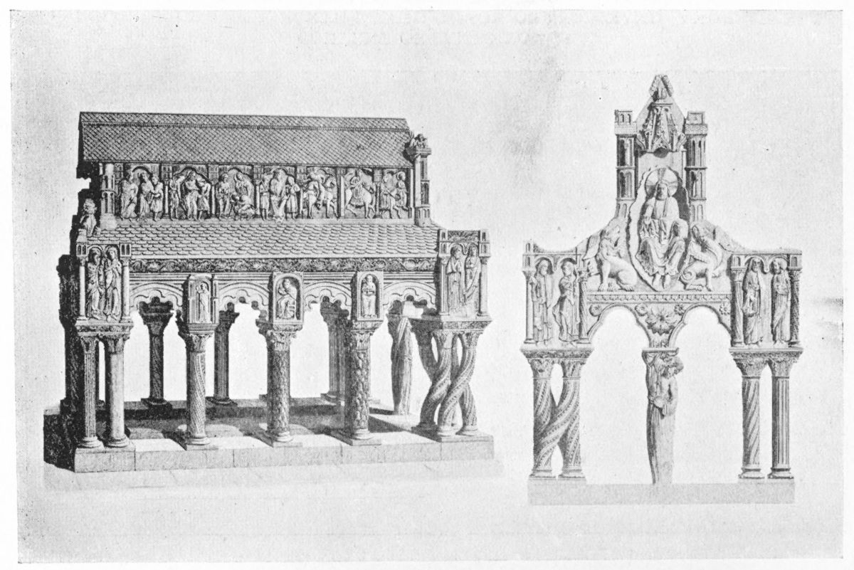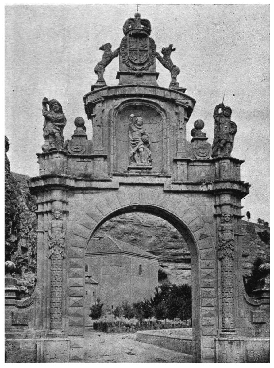 In the seventh century (so runs the legend) when the hosts of Khosru threatened the Holy Land, an ark or coffer, worked by the disciples of the Apostles and full of relics of ineffable sanctity, was conveyed by pious hands to Egypt. Thence it was transported to Cartagena, thence to Toledo; and when that city in its turn was menaced by the ever-advancing Saracen, it was taken by King Pelayo to the cave of Monsagro, ten miles from Oviedo. When the chaste king and his architect, Tioda, re-erected the basilica of San Salvador, founded by Froila, in the year 802, a chapel dedicated to San Miguel, and now called the Cámara Santa,{44} was built expressly to receive this venerated reliquary.